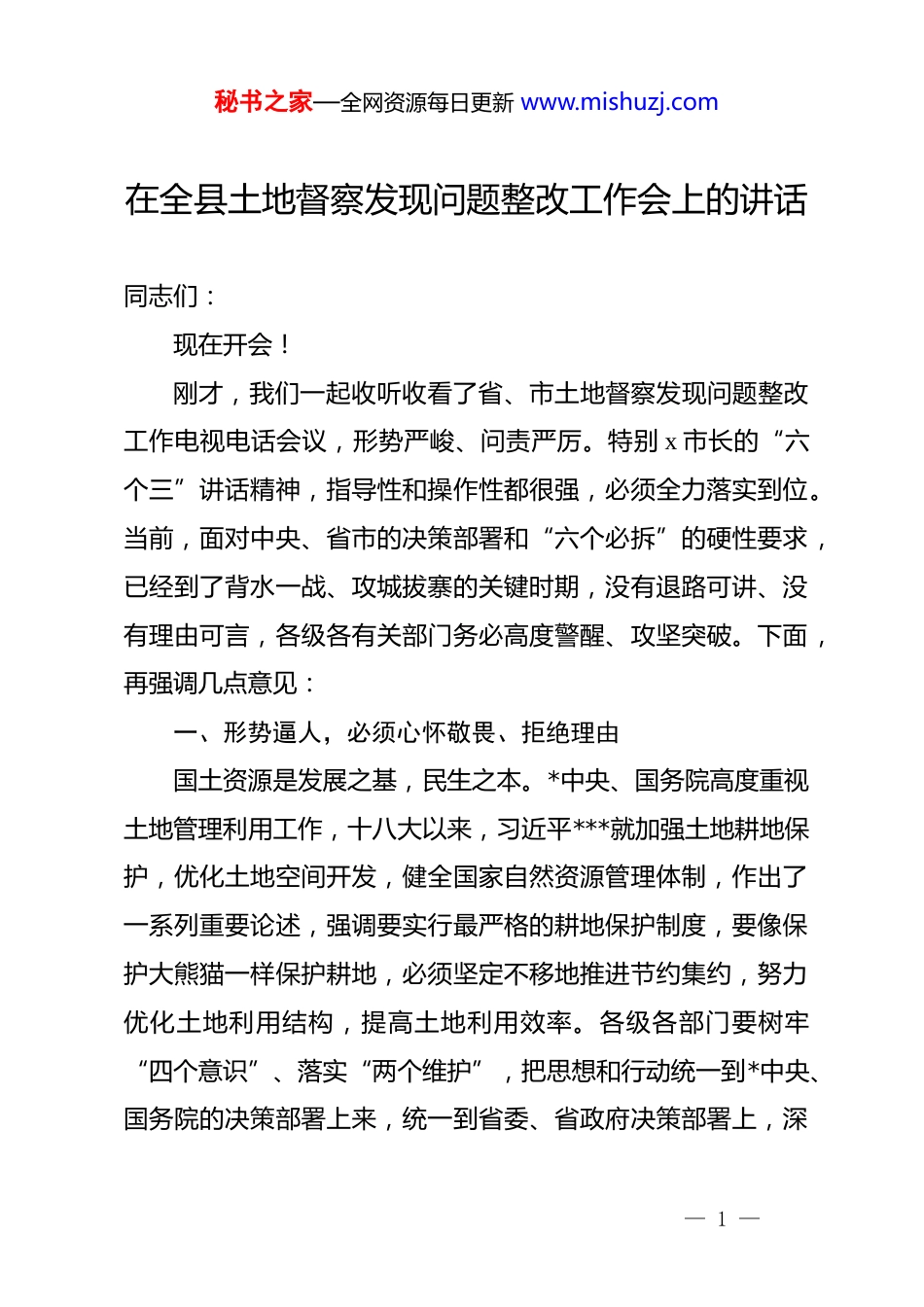 秘书之家—全网资源每日更新 www.mishuzj.com在全县土地督察发现问题整改工作会上的讲话同志们:现在开会!刚才,我们一起收听收看了省、市土地督察发现问题整改工作电视电话会议,形势严峻、问责严厉。特别 x 市长的“六个三”讲话精神,指导性和操作性都很强,必须全力落实到位。当前,面对中央、省市的决策部署和“六个必拆”的硬性要求,已经到了背水一战、攻城拔寨的关键时期,没有退路可讲、没有理由可言,各级各有关部门务必高度警醒、攻坚突破。下面,再强调几点意见:一、形势逼人,必须心怀敬畏、拒绝理由国土资源是发展之基,民生之本。*中央、国务院高度重视土地管理利用工作,十八大以来,习近平***就加强土地耕地保护,优化土地空间开发,健全国家自然资源管理体制,作出了一系列重要论述,强调要实行最严格的耕地保护制度,要像保护大熊猫一样保护耕地,必须坚定不移地推进节约集约,努力优化土地利用结构,提高土地利用效率。各级各部门要树牢“四个意识”、落实“两个维护”,把思想和行动统一到*中央、国务院的决策部署上来,统一到省委、省政府决策部署上,深— 1 —秘书之家—全网资源每日更新 www.mishuzj.com化思想认识,精心组织谋划,抓好问题整改,确保按照时间高质量完成整改任务。x 月 x 日,市委、市政府召开了高规格的土地例行督察整改攻坚行动会议;x 月 x 日,县委、县政府召开了专项动员会议,至今已经 x 天时间,工作情况如何?工作进展如何?工作效果如何?给大家通报一下情况:一是全市排位倒退。x 个县(市、区)中,我县名次由原来的中游逐步下滑,昨天通报的排名、是倒数第 x,今天上午的排名、是倒数第 x。相比别的县区,冀南新区已经全部完成并验收,x 个县完成比例达到 x%以上,x个县完成比例达到 x%以上,应该引起高度重视。二是任务差距较大。我县 201x-201x 年例行督察整改任务,共计 x 个图斑、x 亩。截至目前,仅完成 x 块图斑、x 亩,剩余 x 块图斑尚未完成,其中 x 块都是硬性任务,压力可想而知。三是畏难情绪严重。①是部分乡镇存在观望、等待和缓改拖延的思想,不为整改想办法、只为不拆找理由,甚至期待“像往常一样侥幸过关”。②是整改标准较低,此次督察整改、上级验收非常严格,稍有不对、就不予通过。但至今仍有的乡镇低标准、穷对付,不想拆、不敢拆,绝不允许!③是用老思想看新问题,耍嘴皮子、磨洋工,没有直面困难、害怕较真碰硬,与“新时代新担当新作为”的要求差距较大。— 2 —秘书之家—全网资源每日更新 www.mishuzj.com对此,各级各有关部门必须提高政治站位,拿出背水一战的决心、攻城拔寨的气势、刺刀见红的勇气,自断后路、全力攻坚,拆不到位不罢休、完不成任务不罢休、验收不过关不罢休。二、时间之紧,必须不讲条件、全力攻坚市里要求:时间上,整改节点是 x 月 x 日,验收节点延长至 x 月 x 日;标准上,全部按照监测面积计算,拆不到位、达不到标准的,一律不计入完成比例。并从今天开始,进行申请验收,逾期不再受理。各级各部门要拒绝理由、不讲条件,做到“四个务必”:一是务必坚决态度。越到最后,越是难啃的“硬骨头”,越要树立“红线”意识、“底线”思维,切实把思想和行动统一省、市要求上来,真正将“土地例行督察问题整改”作为一项政治任务,主动担当,严肃对待,传导压力、攻坚作为,坚决打好打赢这场硬仗。二是务必加快进度。县国土局要发挥好牵总协调作用,各乡镇、园区和相关责任单位要盯紧任务目标,一鼓作气、强力攻坚,特别针对重点、难点图斑,要逐一攻克、逐一问效,必要时要开展联合执法行动,依法依规、从速从快,坚决完成整改任务、不留一处违法图斑。— 3 —秘书之家—全网资源每日更新 www.mishuzj.com三是务必严格时限。目前,已经进入最后冲刺阶段,时间紧迫。各乡镇和经开区,要及时拆除、及时上报;国土局要组织精干力量,全程留痕、及时核查;整改到位的、立即申请验收,避免工作被动。四是务必高标整改。上级验收是严格遵照“监测面积”,不能“拆次留主”,要杜绝虚假整改、杜绝隐瞒整改、杜绝侥幸整改,必须按...
