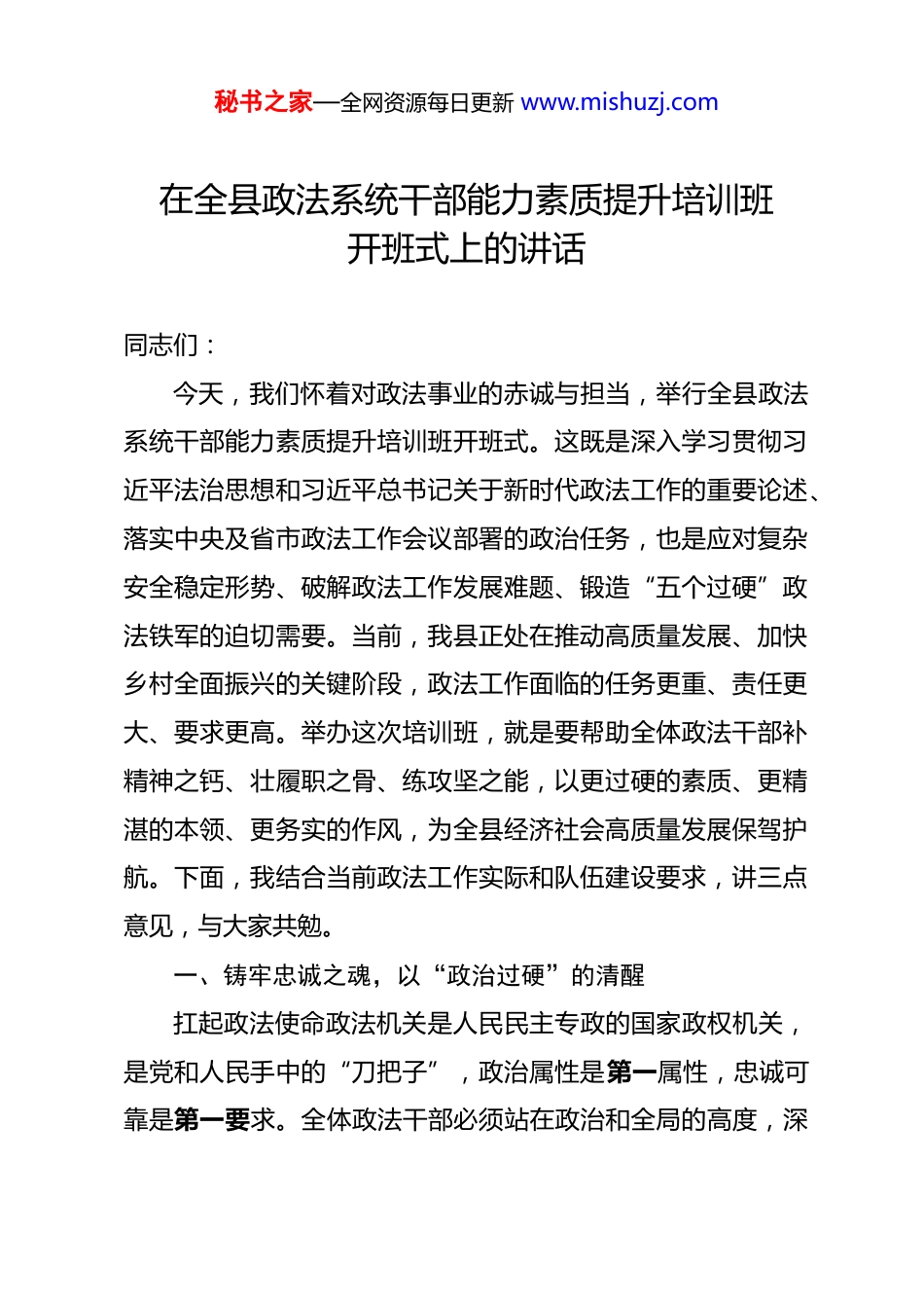 秘书之家—全网资源每日更新 www.mishuzj.com在全县政法系统干部能力素质提升培训班开班式上的讲话 同志们:今天,我们怀着对政法事业的赤诚与担当,举行全县政法系统干部能力素质提升培训班开班式。这既是深入学习贯彻习近平法治思想和习近平总书记关于新时代政法工作的重要论述、落实中央及省市政法工作会议部署的政治任务,也是应对复杂安全稳定形势、破解政法工作发展难题、锻造“五个过硬”政法铁军的迫切需要。当前,我县正处在推动高质量发展、加快乡村全面振兴的关键阶段,政法工作面临的任务更重、责任更大、要求更高。举办这次培训班,就是要帮助全体政法干部补精神之钙、壮履职之骨、练攻坚之能,以更过硬的素质、更精湛的本领、更务实的作风,为全县经济社会高质量发展保驾护航。下面,我结合当前政法工作实际和队伍建设要求,讲三点意见,与大家共勉。一、铸牢忠诚之魂,以“政治过硬”的清醒扛起政法使命政法机关是人民民主专政的国家政权机关,是党和人民手中的“刀把子”,政治属性是第一属性,忠诚可靠是第一要求。全体政法干部必须站在政治和全局的高度,深秘书之家—全网资源每日更新 www.mishuzj.com刻认识能力素质提升的极端重要性,以绝对忠诚、绝对纯洁、绝对可靠的政治品格,践行新时代政法使命。(一)坚守政治立场,把准“前行航向”。习近平总书记强调,“政法姓党是政法机关永远不变的根和魂”。政法工作事关国家政治安全、社会大局稳定、人民安居乐业,每一项决策、每一次执法司法、每一次矛盾化解,都具有鲜明的政治意义。全体干部要始终把讲政治放在首位,深刻领悟“两个确立”的决定性意义,增强“四个意识”、坚定“四个自信”、做到“两个维护”,自觉把政法工作放到党和国家事业发展大局中谋划推进。要深入学习贯彻习近平总书记关于新时代政法工作的重要论述,牢牢把握“对党忠诚、服务人民、执法公正、纪律严明”总要求,始终坚持党对政法工作的绝对领导,确保政法队伍绝对忠诚、绝对纯洁、绝对可靠,以实际行动践行对党和人民的忠诚。(二)认清形势任务,强化“担当自觉”。当前,世界百年未有之大变局加速演进,国内改革发展稳定任务艰巨繁重,政法工作面临的风险挑战呈现出复合型、跨领域、高发性特征。从安全维度看,政治安全领域风险隐患交织叠加,网络安全、数据安全等新型安全威胁持续上升;从治安维度看,电信网络诈骗、跨境犯罪等新型违法犯罪层出不穷,传统犯罪仍处于高秘书之家—全网资源每日更新 www.mishuzj.com发态势;从治理维度看,基层矛盾纠纷多元多发,征地拆迁、劳资纠纷、邻里矛盾等问题易引发风险隐患;从发展维度看,人民群众对公平正义、公共服务、安全保障的期待越来越高。面对新形势新任务,我们的政法干部队伍在风险洞察、应急处突、法治素养、群众工作等方面还存在一些短板。大家必须清醒认识到,能力不足是最大的风险,本领恐慌是最大的危机。唯有主动补短板、强弱项、提能力,才能在复杂局面中牢牢掌握主动权,真正扛起维护安全稳定、护航发展大局的政治责任。(三)践行人民至上,永葆“为民初心”。“江山就是人民,人民就是江山。”政法工作的根基在人民、力量在人民。从街头巷尾的巡逻防控到打击犯罪的雷霆行动,从司法为民的便民服务到矛盾纠纷的多元化解,每一项工作都连着民心、关乎民生。近年来,我们持续深化扫黑除恶专项斗争,破获了一批群众反映强烈的刑事案件;推进“一站式”矛盾纠纷调处中心建设,化解了一批信访积案和突出矛盾;深化政法领域“放管服”改革,推出了一批便民利企举措,群众安全感满意度持续提升。但我们也要看到,群众在安全保障、执法公正、服务效率等方面还有不少期盼。全体干部要始终坚守为民初心,把群众的“急难愁盼”作为工作的出发点和落脚点,主动深入基层、深入群众,倾听群众呼声、了解群众需求,用心用情用力秘书之家—全网资源每日更新 www.mishuzj.com解决好群众反映强烈的突出问题。要以“时时放心不下”的责任感,严厉打击侵害群众利益的违法犯罪,公正规范文明执法司法,让群众在每一起案件办理、每一件事情处理中都能感受到公平正义,不断增强群众的获得...