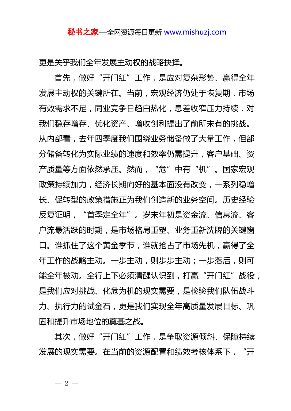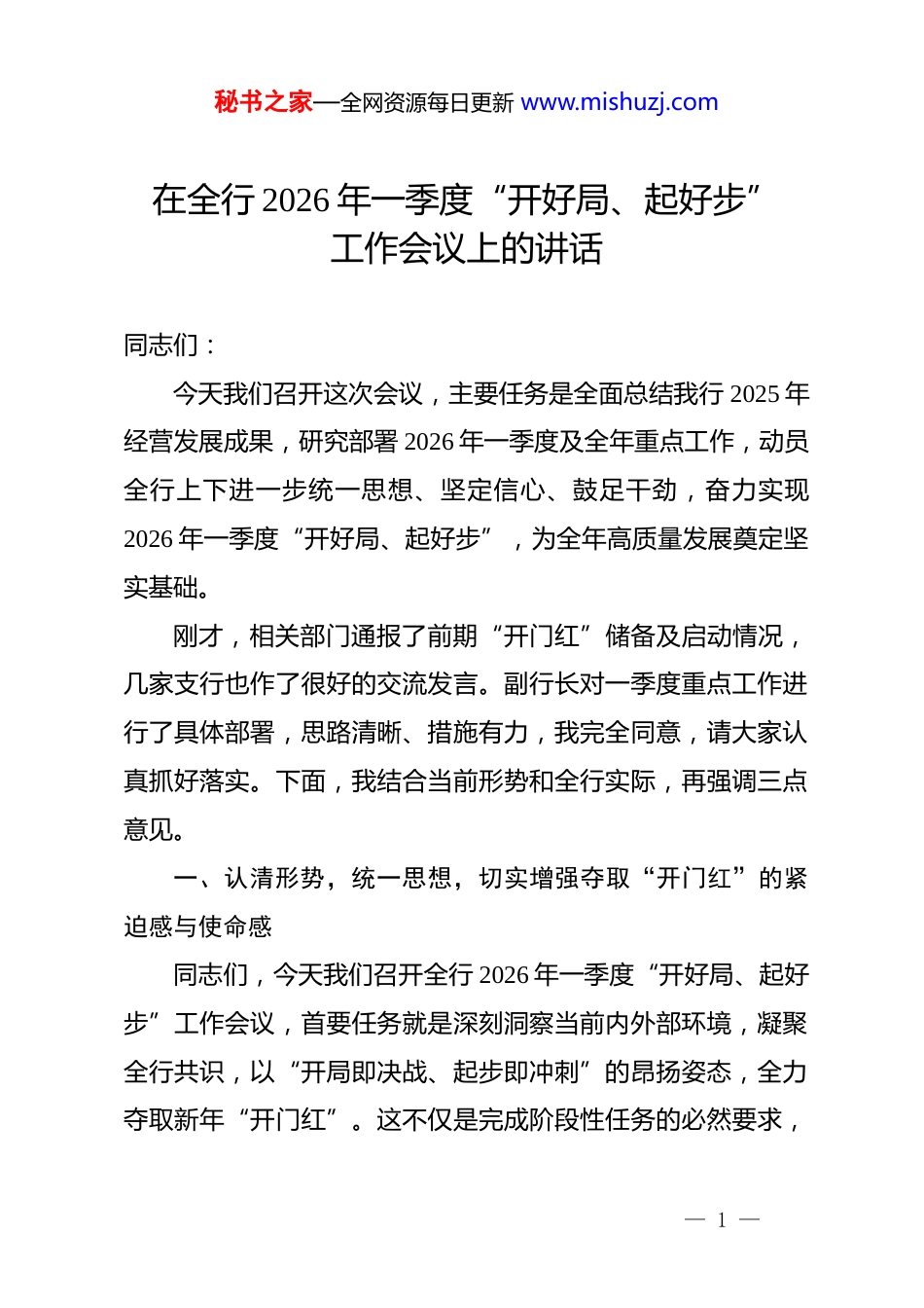 秘书之家—全网资源每日更新 www.mishuzj.com在全行 2026 年一季度“开好局、起好步”工作会议上的讲话同志们:今天我们召开这次会议,主要任务是全面总结我行 2025 年经营发展成果,研究部署 2026 年一季度及全年重点工作,动员全行上下进一步统一思想、坚定信心、鼓足干劲,奋力实现2026 年一季度“开好局、起好步”,为全年高质量发展奠定坚实基础。刚才,相关部门通报了前期“开门红”储备及启动情况,几家支行也作了很好的交流发言。副行长对一季度重点工作进行了具体部署,思路清晰、措施有力,我完全同意,请大家认真抓好落实。下面,我结合当前形势和全行实际,再强调三点意见。一、认清形势,统一思想,切实增强夺取“开门红”的紧迫感与使命感同志们,今天我们召开全行 2026 年一季度“开好局、起好步”工作会议,首要任务就是深刻洞察当前内外部环境,凝聚全行共识,以“开局即决战、起步即冲刺”的昂扬姿态,全力夺取新年“开门红”。这不仅是完成阶段性任务的必然要求,— 1 —秘书之家—全网资源每日更新 www.mishuzj.com更是关乎我们全年发展主动权的战略抉择。首先,做好“开门红”工作,是应对复杂形势、赢得全年发展主动权的关键所在。当前,宏观经济仍处于恢复期,市场有效需求不足,同业竞争日趋白热化,息差收窄压力持续,对我们稳存增存、优化资产、增收创利提出了前所未有的挑战。从内部看,去年四季度我们围绕业务储备做了大量工作,但部分储备转化为实际业绩的速度和效率仍需提升,客户基础、资产质量等方面依然承压。然而,“危”中有“机”。国家宏观政策持续加力,经济长期向好的基本面没有改变,一系列稳增长、促转型的政策措施正为我们创造新的业务空间。历史经验反复证明,“首季定全年”。岁末年初是资金流、信息流、客户流最活跃的时期,是市场格局重塑、业务重新洗牌的关键窗口。谁抓住了这个黄金季节,谁就抢占了市场先机,赢得了全年工作的战略主动。一步主动,则步步主动;一步落后,则可能全年被动。全行上下必须清醒认识到,打赢“开门红”战役,是我们应对挑战、化危为机的现实需要,是检验我们队伍战斗力、执行力的试金石,更是我们实现全年高质量发展目标、巩固和提升市场地位的奠基之战。其次,做好“开门红”工作,是争取资源倾斜、保障持续发展的现实需要。在当前的资源配置和绩效考核体系下,“开— 2 —秘书之家—全网资源每日更新 www.mishuzj.com门红”的成效直接关系到我们全年能获得多少费用、薪酬和战略资源的支持。从分行整体到每位员工,一季度业绩都是全年收入的重要基石。近年来,凡是能在一季度抢占先机、业绩突出的机构,其全年发展速度更快,员工获得感更强;反之,则容易陷入“首季被动、全年被动”的困境。我们必须将“开门红”作为争取政策红利、赢得发展空间的重要战役来打,用实实在在的业绩说话,为分行赢得更多总行资源倾斜,为员工创造更丰厚的回报,为可持续发展注入更强动力。第三,做好“开门红”工作,是落实战略部署、实现赶超进位的内在要求。总行、分行*委对我们新一年的发展寄予厚望,制定了雄心勃勃— 3 —