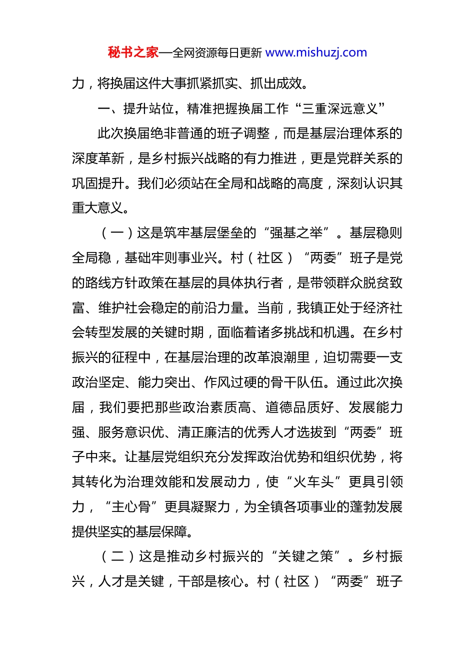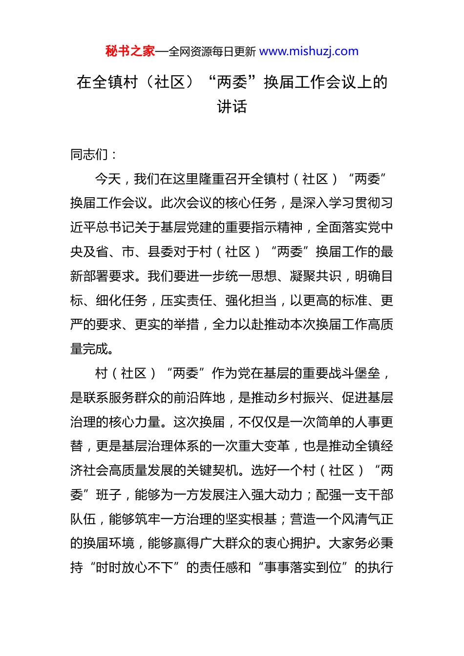 秘书之家—全网资源每日更新 www.mishuzj.com在全镇村(社区)“两委”换届工作会议上的讲话 同志们:今天,我们在这里隆重召开全镇村(社区)“两委”换届工作会议。此次会议的核心任务,是深入学习贯彻习近平总书记关于基层党建的重要指示精神,全面落实党中央及省、市、县委对于村(社区)“两委”换届工作的最新部署要求。我们要进一步统一思想、凝聚共识,明确目标、细化任务,压实责任、强化担当,以更高的标准、更严的要求、更实的举措,全力以赴推动本次换届工作高质量完成。村(社区)“两委”作为党在基层的重要战斗堡垒,是联系服务群众的前沿阵地,是推动乡村振兴、促进基层治理的核心力量。这次换届,不仅仅是一次简单的人事更替,更是基层治理体系的一次重大变革,也是推动全镇经济社会高质量发展的关键契机。选好一个村(社区)“两委”班子,能够为一方发展注入强大动力;配强一支干部队伍,能够筑牢一方治理的坚实根基;营造一个风清气正的换届环境,能够赢得广大群众的衷心拥护。大家务必秉持“时时放心不下”的责任感和“事事落实到位”的执行秘书之家—全网资源每日更新 www.mishuzj.com力,将换届这件大事抓紧抓实、抓出成效。一、提升站位,精准把握换届工作“三重深远意义”此次换届绝非普通的班子调整,而是基层治理体系的深度革新,是乡村振兴战略的有力推进,更是党群关系的巩固提升。我们必须站在全局和战略的高度,深刻认识其重大意义。(一)这是筑牢基层堡垒的“强基之举”。基层稳则全局稳,基础牢则事业兴。村(社区)“两委”班子是党的路线方针政策在基层的具体执行者,是带领群众脱贫致富、维护社会稳定的前沿力量。当前,我镇正处于经济社会转型发展的关键时期,面临着诸多挑战和机遇。在乡村振兴的征程中,在基层治理的改革浪潮里,迫切需要一支政治坚定、能力突出、作风过硬的骨干队伍。通过此次换届,我们要把那些政治素质高、道德品质好、发展能力强、服务意识优、清正廉洁的优秀人才选拔到“两委”班子中来。让基层党组织充分发挥政治优势和组织优势,将其转化为治理效能和发展动力,使“火车头”更具引领力,“主心骨”更具凝聚力,为全镇各项事业的蓬勃发展提供坚实的基层保障。(二)这是推动乡村振兴的“关键之策”。乡村振兴,人才是关键,干部是核心。村(社区)“两委”班子秘书之家—全网资源每日更新 www.mishuzj.com是乡村振兴的直接组织者和推动者,其能力素质直接关系到乡村振兴的成效。无论是产业发展、生态建设,还是文化繁荣、社会治理,都需要一支有担当、有作为、有创新精神的干部队伍。此次换届,我们要聚焦乡村振兴的“二十字”总要求,选拔出有战略眼光、有发展思路、有开拓精神的“领头雁”,配强有干劲、有闯劲、有韧劲的“实干家”。他们要带领群众因地制宜发展特色农业、乡村旅游、农村电商等新兴产业,积极推进农村人居环境整治,传承和弘扬优秀乡村文化,完善村规民约,加强基层民主法治建设。通过他们的努力,将党的政策转化为群众的实际行动,把乡村振兴的美好蓝图变为现实,为乡村振兴注入源源不断的活力。(三)这是密切党群关系的“连心之桥”。村(社区)“两委”干部与群众联系最为紧密,他们的一言一行、一举一动都代表着党和政府的形象。一个好的“两委”班子能够倾听群众呼声,反映群众诉求,解决群众困难,增强群众对党的信任和拥护。此次换届,我们要通过严格的程序和标准,选拔出真正为群众谋幸福、为群众办实事的干部。他们要深入群众,了解群众的需求和期盼,关心群众的疾苦和困难,切实解决群众在生产生活中遇到的实际问题。通过他们的工作,拉近党和群众的距离,增秘书之家—全网资源每日更新 www.mishuzj.com进党群干群关系,使党在基层的执政基础更加稳固。二、明确目标要求,严格落实换届工作“三个关键标准”为确保换届工作顺利进行,选出高素质、有能力、能担当的“两委”班子,我们要严格落实以下三个关键标准。(一)坚持政治标准“首位度”。政治标准是衡量干部的首要标准。我们要选拔政治立场坚定、对党忠诚、坚决贯彻党的路线方针政策的干部。他们要牢固增强“四个意识”,坚...