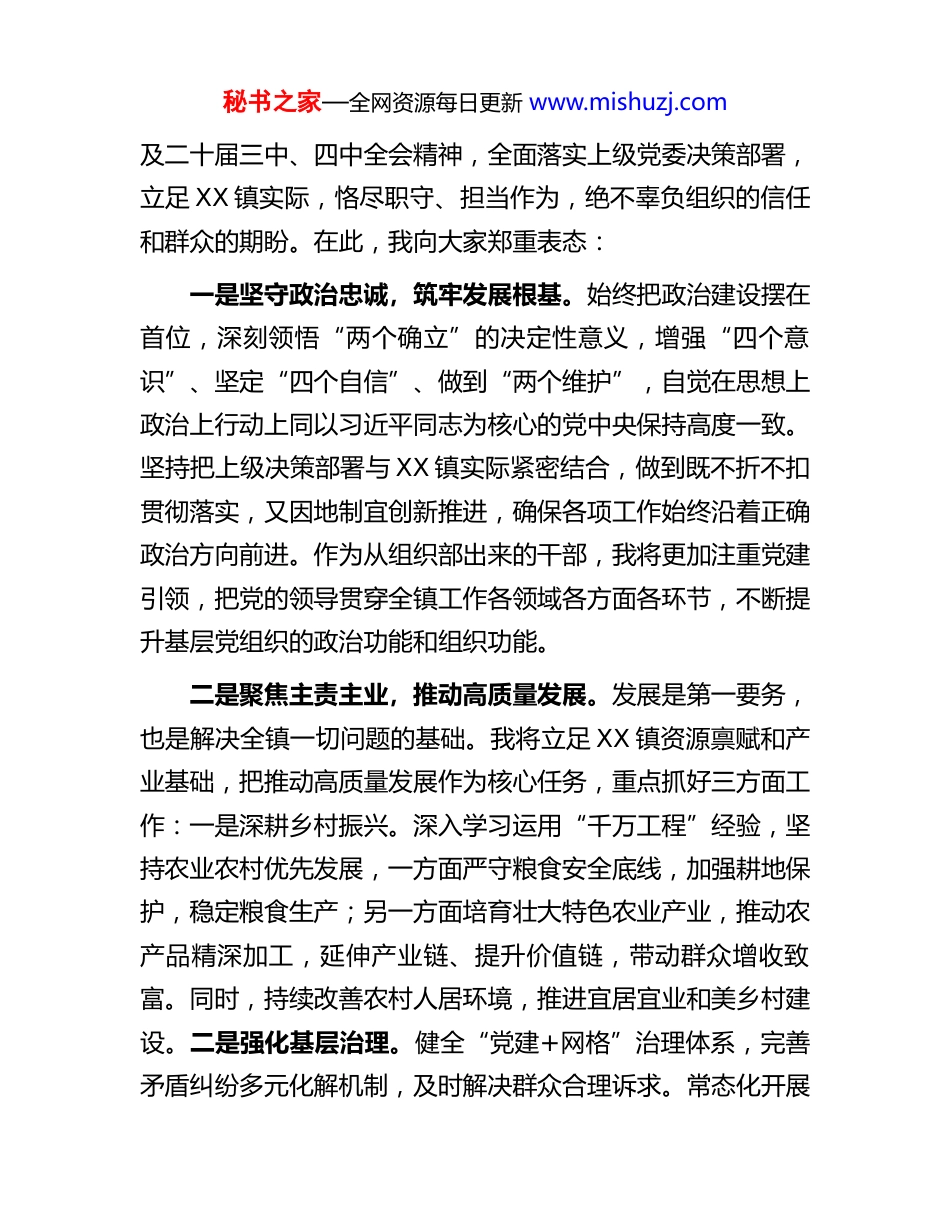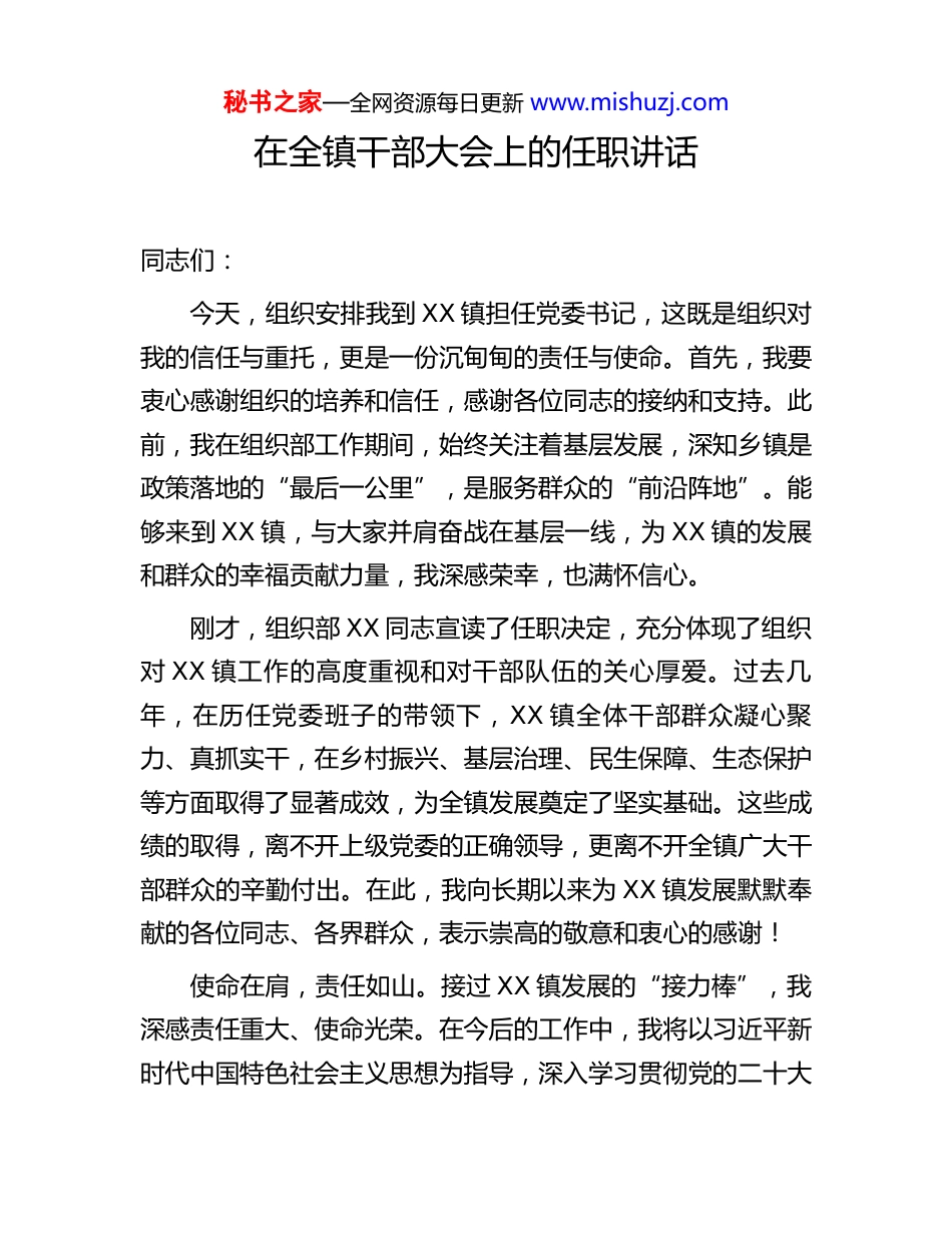 秘书之家—全网资源每日更新 www.mishuzj.com在全镇干部大会上的任职讲话同志们:今天,组织安排我到 XX 镇担任党委书记,这既是组织对我的信任与重托,更是一份沉甸甸的责任与使命。首先,我要衷心感谢组织的培养和信任,感谢各位同志的接纳和支持。此前,我在组织部工作期间,始终关注着基层发展,深知乡镇是政策落地的“最后一公里”,是服务群众的“前沿阵地”。能够来到 XX 镇,与大家并肩奋战在基层一线,为 XX 镇的发展和群众的幸福贡献力量,我深感荣幸,也满怀信心。刚才,组织部 XX 同志宣读了任职决定,充分体现了组织对 XX 镇工作的高度重视和对干部队伍的关心厚爱。过去几年,在历任党委班子的带领下,XX 镇全体干部群众凝心聚力、真抓实干,在乡村振兴、基层治理、民生保障、生态保护等方面取得了显著成效,为全镇发展奠定了坚实基础。这些成绩的取得,离不开上级党委的正确领导,更离不开全镇广大干部群众的辛勤付出。在此,我向长期以来为 XX 镇发展默默奉献的各位同志、各界群众,表示崇高的敬意和衷心的感谢!使命在肩,责任如山。接过 XX 镇发展的“接力棒”,我深感责任重大、使命光荣。在今后的工作中,我将以习近平新时代中国特色社会主义思想为指导,深入学习贯彻党的二十大秘书之家—全网资源每日更新 www.mishuzj.com及二十届三中、四中全会精神,全面落实上级党委决策部署,立足 XX 镇实际,恪尽职守、担当作为,绝不辜负组织的信任和群众的期盼。在此,我向大家郑重表态:一是坚守政治忠诚,筑牢发展根基。始终把政治建设摆在首位,深刻领悟“两个确立”的决定性意义,增强“四个意识”、坚定“四个自信”、做到“两个维护”,自觉在思想上政治上行动上同以习近平同志为核心的党中央保持高度一致。坚持把上级决策部署与 XX 镇实际紧密结合,做到既不折不扣贯彻落实,又因地制宜创新推进,确保各项工作始终沿着正确政治方向前进。作为从组织部出来的干部,我将更加注重党建引领,把党的领导贯穿全镇工作各领域各方面各环节,不断提升基层党组织的政治功能和组织功能。二是聚焦主责主业,推动高质量发展。发展是第一要务,也是解决全镇一切问题的基础。我将立足 XX 镇资源禀赋和产业基础,把推动高质量发展作为核心任务,重点抓好三方面工作:一是深耕乡村振兴。深入学习运用“千万工程”经验,坚持农业农村优先发展,一方面严守粮食安全底线,加强耕地保护,稳定粮食生产;另一方面培育壮大特色农业产业,推动农产品精深加工,延伸产业链、提升价值链,带动群众增收致富。同时,持续改善农村人居环境,推进宜居宜业和美乡村建设。二是强化基层治理。健全“党建+网格”治理体系,完善矛盾纠纷多元化解机制,及时解决群众合理诉求。常态化开展秘书之家—全网资源每日更新 www.mishuzj.com安全生产隐患排查整治,坚决防范和遏制重特大安全事故发生,维护社会大局和谐稳定。三是增进民生福祉。始终坚持以人民为中心的发展思想,聚焦群众急难愁盼问题,扎实推进教育、医疗、养老、住房等民生工程,完善社会保障体系,让发展成果更多更公平惠及全镇群众。三是坚持团结协作,凝聚发展合力。团结是干事创业的根本保障。我将坚决贯彻民主集中制,带头维护班子团结,做到重大事项集体研究、民主决策、分工负责。主动加强与班子成员的沟通协调,大事讲原则、小事讲风格,形成“心往一处想、劲往一处使”的工作格局。同时,我将始终相信群众、依靠群众,尊重干部、关爱干部,为大家干事创业搭建平台、创造条件,充分调动全镇上下的积极性、主动性和创造性,凝聚起推动 XX 镇发展的强大合力。四是严守纪律底线,永葆清廉本色。打铁必须自身硬。我将始终把纪律和规矩挺在前面,严格遵守中央八项规定及其实施细则精神,坚决反对形式主义、官僚主义。带头遵守廉洁自律各项规定,管好自己、管好家人、管好身边工作人员,自觉接受组织监督、群众监督和社会监督。同时,切实履行全面从严治党“第一责任人”职责,加强干部队伍教育管理,营造风清气正的政治生态,让清正廉洁成为 XX 镇干部队伍的鲜明底色。秘书之家—全网资源每日更新 www.mish...