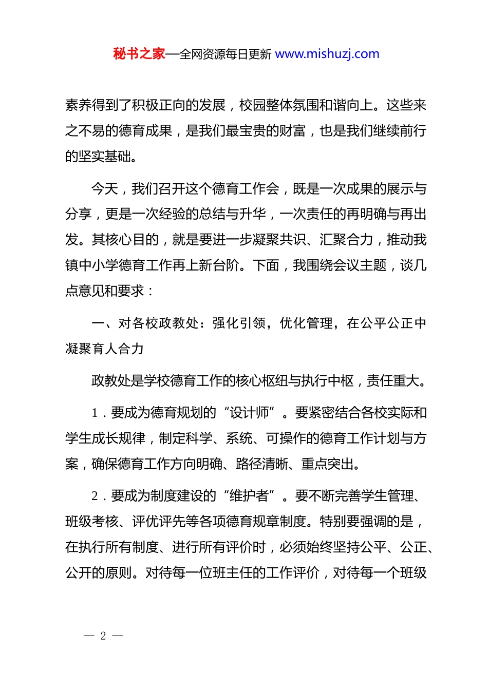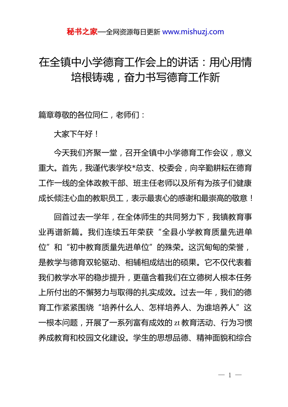 秘书之家—全网资源每日更新 www.mishuzj.com在全镇中小学德育工作会上的讲话:用心用情培根铸魂,奋力书写德育工作新篇章尊敬的各位同仁,老师们:大家下午好!今天我们齐聚一堂,召开全镇中小学德育工作会议,意义重大。首先,我谨代表学校*总支、校委会,向辛勤耕耘在德育工作一线的全体政教干部、班主任老师以及所有为孩子们健康成长倾注心血的教职员工,表示最衷心的感谢和最崇高的敬意!回首过去一学年,在全体师生的共同努力下,我镇教育事业再谱新篇。我们连续五年荣获“全县小学教育质量先进单位”和“初中教育质量先进单位”的殊荣。这沉甸甸的荣誉,是教学与德育双轮驱动、相辅相成结出的硕果。它不仅代表着我们教学水平的稳步提升,更蕴含着我们在立德树人根本任务上所付出的不懈努力与取得的扎实成效。过去一年,我们的德育工作紧紧围绕“培养什么人、怎样培养人、为谁培养人”这一根本问题,开展了一系列富有成效的 zt 教育活动、行为习惯养成教育和校园文化建设。学生的思想品德、精神面貌和综合— 1 —秘书之家—全网资源每日更新 www.mishuzj.com素养得到了积极正向的发展,校园整体氛围和谐向上。这些来之不易的德育成果,是我们最宝贵的财富,也是我们继续前行的坚实基础。今天,我们召开这个德育工作会,既是一次成果的展示与分享,更是一次经验的总结与升华,一次责任的再明确与再出发。其核心目的,就是要进一步凝聚共识、汇聚合力,推动我镇中小学德育工作再上新台阶。下面,我围绕会议主题,谈几点意见和要求:一、对各校政教处:强化引领,优化管理,在公平公正中凝聚育人合力政教处是学校德育工作的核心枢纽与执行中枢,责任重大。1.要成为德育规划的“设计师”。要紧密结合各校实际和学生成长规律,制定科学、系统、可操作的德育工作计划与方案,确保德育工作方向明确、路径清晰、重点突出。2.要成为制度建设的“维护者”。要不断完善学生管理、班级考核、评优评先等各项德育规章制度。特别要强调的是,在执行所有制度、进行所有评价时,必须始终坚持公平、公正、公开的原则。对待每一位班主任的工作评价,对待每一个班级— 2 —秘书之家—全网资源每日更新 www.mishuzj.com的考核评比,都要有统一的标准、透明的程序、客观的态度。公平公正是凝聚人心的基石,是激发活力的源泉。只有让每一位班主任都感受到被尊重、被平等对待,我们的德育队伍才能真正形成心往一处想、劲往一处使的强大合力。3.要成为班主任队伍的“服务员”与“指导员”。既要为班主任开展工作创造有利条件、提供必要支持、减轻不必要的负担,也要加强业务指导和培训,搭建交流学习的平台,帮助班主任尤其是年轻班主任提升专业能力和育人艺术。4.要成为协同育人的“联络员”。积极协调学校、家庭、社会(社区)等多方力量,构建更加完善的德育网络,形成全员、全过程、全方位的育人格局。二、对全体班主任:牢记使命,增强责任,在解决问题中提升育人本领班主任是学校德育工作的骨干力量,是学生健康成长的主要引领者。一个班级的风貌,很大程度上取决于班主任的工作状态与管理水平。1.要永葆一颗“责任心”。班主任工作琐碎而繁重,但意义非凡。希望大家深刻认识到肩负的育人使命,把班级当成自— 3 —秘书之家—全网资源每日更新 www.mishuzj.com己的家园来经营,把学生当成自己的孩子来关爱。责任心体现在日常管理的每一个细节中,体现在对学生思想波动的敏锐察觉中,体现在对每一个问题不回避、不推诿的积极应对中。2.要修炼一颗“仁爱心”。爱是教育的前提,没有爱就没有真正的教育。要关心每一位学生的全面发展,尊重学生的个体差异,善于发现学生的闪光点。特别是对学习、生活、心理上有困难的学生,要给予更多的耐心、细心和贴心,用爱温暖心灵,用信任点燃希望。3.要锤炼一颗“进取心”。新时代的学生特点在变化,德育工作面临新情况、新挑战。班主任不能满足于现状,要树立“在解决问题中不断进步”的理念。面对班级管理中的难题、学生成长中的困惑、家校沟通中的障碍,要主动思考、积极学习、勇于探索、善于总结。要把每一次问题的解决,都当作是一次...
