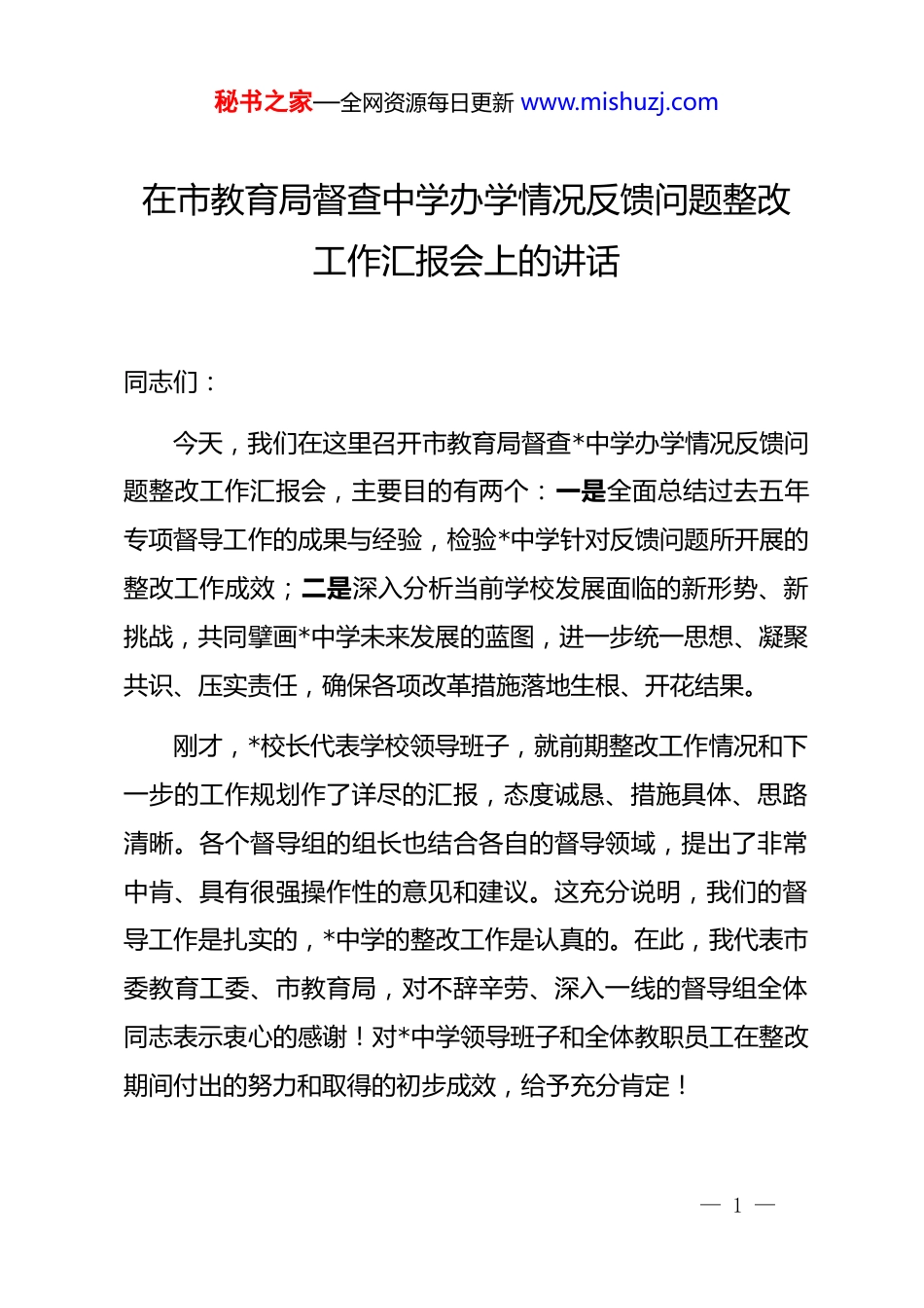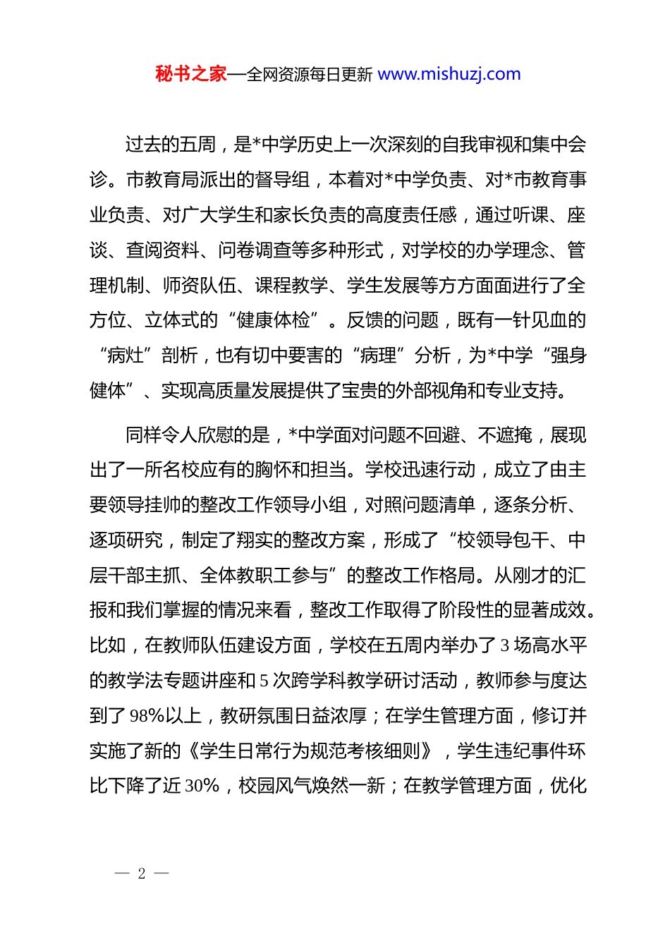 秘书之家—全网资源每日更新 www.mishuzj.com在市教育局督查中学办学情况反馈问题整改工作汇报会上的讲话同志们:今天,我们在这里召开市教育局督查*中学办学情况反馈问题整改工作汇报会,主要目的有两个:一是全面总结过去五年专项督导工作的成果与经验,检验*中学针对反馈问题所开展的整改工作成效;二是深入分析当前学校发展面临的新形势、新挑战,共同擘画*中学未来发展的蓝图,进一步统一思想、凝聚共识、压实责任,确保各项改革措施落地生根、开花结果。刚才,*校长代表学校领导班子,就前期整改工作情况和下一步的工作规划作了详尽的汇报,态度诚恳、措施具体、思路清晰。各个督导组的组长也结合各自的督导领域,提出了非常中肯、具有很强操作性的意见和建议。这充分说明,我们的督导工作是扎实的,*中学的整改工作是认真的。在此,我代表市委教育工委、市教育局,对不辞辛劳、深入一线的督导组全体同志表示衷心的感谢!对*中学领导班子和全体教职员工在整改期间付出的努力和取得的初步成效,给予充分肯定!— 1 —秘书之家—全网资源每日更新 www.mishuzj.com过去的五周,是*中学历史上一次深刻的自我审视和集中会诊。市教育局派出的督导组,本着对*中学负责、对*市教育事业负责、对广大学生和家长负责的高度责任感,通过听课、座谈、查阅资料、问卷调查等多种形式,对学校的办学理念、管理机制、师资队伍、课程教学、学生发展等方方面面进行了全方位、立体式的“健康体检”。反馈的问题,既有一针见血的“病灶”剖析,也有切中要害的“病理”分析,为*中学“强身健体”、实现高质量发展提供了宝贵的外部视角和专业支持。同样令人欣慰的是,*中学面对问题不回避、不遮掩,展现出了一所名校应有的胸怀和担当。学校迅速行动,成立了由主要领导挂帅的整改工作领导小组,对照问题清单,逐条分析、逐项研究,制定了翔实的整改方案,形成了“校领导包干、中层干部主抓、全体教职工参与”的整改工作格局。从刚才的汇报和我们掌握的情况来看,整改工作取得了阶段性的显著成效。比如,在教师队伍建设方面,学校在五周内举办了 3 场高水平的教学法专题讲座和 5 次跨学科教学研讨活动,教师参与度达到了 98%以上,教研氛围日益浓厚;在学生管理方面,修订并实施了新的《学生日常行为规范考核细则》,学生违纪事件环比下降了近 30%,校园风气焕然一新;在教学管理方面,优化— 2 —秘书之家—全网资源每日更新 www.mishuzj.com了集体备课流程,推行了“个人初备—集体研讨—二次备课—课后反思”的四步备课法,据初步统计,督导组在整改后期抽查的 30 节课中,优秀率比整改初期提升了超过 20 个百分点。这些数据和变化,充分证明了*中学领导班子是有战斗力的,全体教职工是顾全大局、勇于进取的。但是,同志们,我们必须清醒地认识到,五周的集中整改,仅仅是一个开始,是一场深刻变革的序幕。许多长期积累的深层次矛盾和结构性问题,不可能在短短几十天内得到根本解决。一些整改措施的效果,还需要时间的检验;一些已经建立起来的新机制,还需要在实践中不断完善。逆水行舟,一篙松劲退千寻。我们今天坐在这里,不是为了庆祝阶段性的胜利,而是为了吹响持续深化改革、全面提升办学水平的冲锋号。下面,我讲三点意见。一、提高站位,深化认识,深刻把握*中学改革发展的时代使命*中学作为我们*市基础教育的一面旗帜,承载着几代人的光荣与梦想,寄托着全市人民对优质教育的殷切期盼。办好*中学,不仅仅是学校自身发展的需要,更是关乎*市教育整体形象、关乎区域人才培养质量、关乎城市未来竞争力的重大战略问题。当前,教育领域的竞争日趋激烈,新高考改革的深入推进、育— 3 —秘书之家—全网资源每日更新 www.mishuzj.com人方式的深刻变革,都对普通高中的办学模式提出了前所未有的新要求。*中学如果不能顺应时代潮流,勇于自我革命,就必然会面临发展的瓶颈,甚至有被超越、被边缘化的风险。因此,学校全体干部教师必须站在全市教育发展大局的高度,重新审视自身的定位和责任。要深刻认识到,这次督导整改,不是一次简单的“纠错”,而是一次推动学校转型升级、...