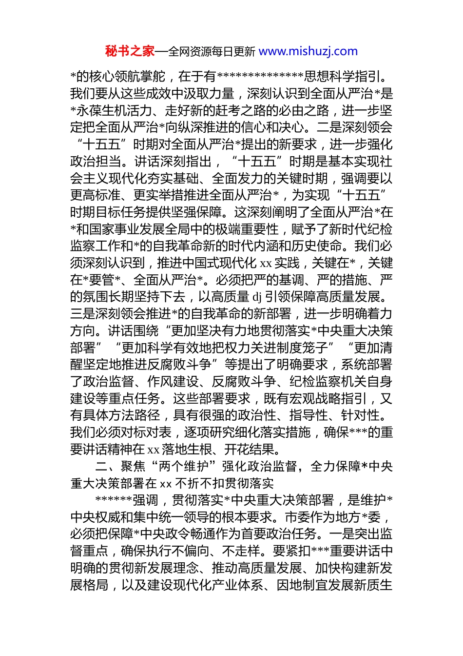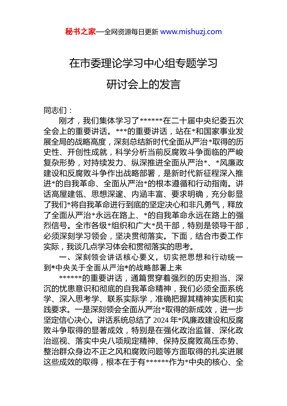秘书之家—全网资源每日更新 www.mishuzj.com在市委理论学习中心组专题学习研讨会上的发言同志们:刚才,我们集体学习了******在二十届中央纪委五次全会上的重要讲话。***的重要讲话,站在*和国家事业发展全局的战略高度,深刻总结新时代全面从严治*取得的历史性、开创性成就,科学分析当前反腐败斗争面临的严峻复杂形势,对持续发力、纵深推进全面从严治*、*风廉政建设和反腐败斗争作出战略部署,是新时代新征程深入推进*的自我革命、全面从严治*的根本遵循和行动指南。讲话高屋建瓴、思想深邃、内涵丰富、要求明确,充分彰显了我们*将自我革命进行到底的坚定决心和非凡勇气,释放了全面从严治*永远在路上、*的自我革命永远在路上的强烈信号。全市各级*组织和广大*员干部,特别是领导干部,必须深刻学习领会,坚决贯彻落实。下面,结合市委工作实际,我谈几点学习体会和贯彻落实的思考。一、深刻领会讲话核心要义,切实把思想和行动统一到*中央关于全面从严治*的战略部署上来******的重要讲话,通篇贯穿着强烈的历史担当、深沉的忧患意识和彻底的自我革命精神,我们必须全面系统学、深入思考学、联系实际学,准确把握其精神实质和实践要求。一是深刻领会全面从严治*取得的新成效,进一步坚定信心决心。讲话系统总结了 2024 年*风廉政建设和反腐败斗争取得的显著成效,特别是在强化政治监督、深化政治巡视、落实中央八项规定精神、保持反腐败高压态势、整治群众身边不正之风和腐败问题等方面取得的扎实进展这些成效的取得,根本在于有******作为*中央的核心、全秘书之家—全网资源每日更新 www.mishuzj.com*的核心领航掌舵,在于有**************思想科学指引。我们要从这些成效中汲取力量,深刻认识到全面从严治*是*永葆生机活力、走好新的赶考之路的必由之路,进一步坚定把全面从严治*向纵深推进的信心和决心。二是深刻领会“十五五”时期对全面从严治*提出的新要求,进一步强化政治担当。讲话深刻指出,“十五五”时期是基本实现社会主义现代化夯实基础、全面发力的关键时期,强调要以更高标准、更实举措推进全面从严治*,为实现“十五五”时期目标任务提供坚强保障。这深刻阐明了全面从严治*在*和国家事业发展全局中的极端重要性,赋予了新时代纪检监察工作和*的自我革命新的时代内涵和历史使命。我们必须深刻认识到,推进中国式现代化 xx 实践,关键在*,关键在*要管*、全面从严治*。必须把严的基调、严的措施、严的氛围长期坚持下去,以高质量 dj 引领保障高质量发展。三是深刻领会推进*的自我革命的新部署,进一步明确着力方向。讲话围绕“更加坚决有力地贯彻落实*中央重大决策部署”“更加科学有效地把权力关进制度笼子”“更加清醒坚定地推进反腐败斗争”等提出了明确要求,系统部署了政治监督、作风建设、反腐败斗争、纪检监察机关自身建设等重点任务。这些部署要求,既有宏观战略指引,又有具体方法路径,具有很强的政治性、指导性、针对性。我们必须对标对表,逐项研究细化落实措施,确保***的重要讲话精神在 xx 落地生根、开花结果。二、聚焦“两个维护”强化政治监督,全力保障*中央重大决策部署在 xx 不折不扣贯彻落实******强调,贯彻落实*中央重大决策部署,是维护*中央权威和集中统一领导的根本要求。市委作为地方*委,必须把保障*中央政令畅通作为首要政治任务。一是突出监督重点,确保执行不偏向、不走样。要紧扣***重要讲话中明确的贯彻新发展理念、推动高质量发展、加快构建新发展格局,以及建设现代化产业体系、因地制宜发展新质生秘书之家—全网资源每日更新 www.mishuzj.com产力、建设全国统一大市场、扩大高水平对外开放、扎实推进全体人民共同富裕、常态化防止返贫致贫、化解地方政府隐性债务、加强生态环境保护、统筹发展和安全等一系列重大战略部署和任务要求,结合我市“十四五”规划落实和“十五五”规划谋划,制定具体化、精准化、常态化的政治监督清单。要健全完善“清单管理、动态跟踪、限期办结、督查问责”的工作闭环,确保*中央各项决策部署在 xx 有部署、有检查、有落实、有成效。二是创新监督方式,提升监督质效。要综合运...