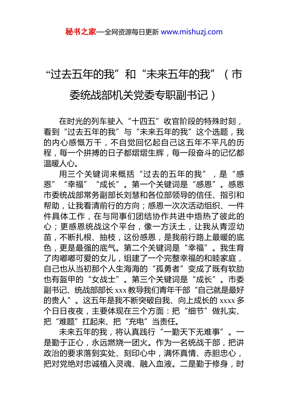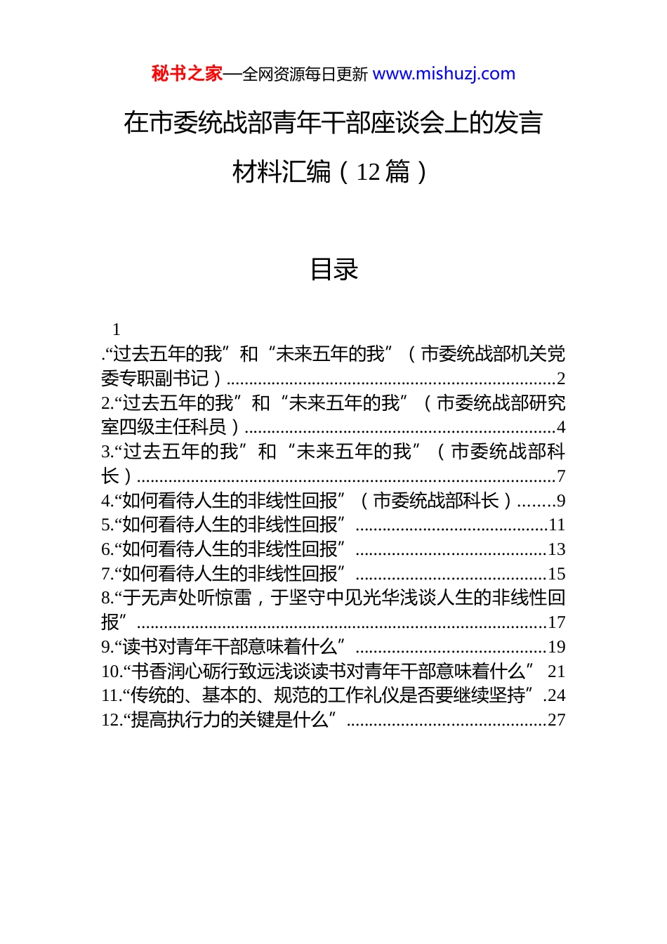 秘书之家—全网资源每日更新 www.mishuzj.com在市委统战部青年干部座谈会上的发言材料汇编(12 篇)目录1.“过去五年的我”和“未来五年的我”(市委统战部机关党委专职副书记).........................................................................22.“过去五年的我”和“未来五年的我”(市委统战部研究室四级主任科员).....................................................................43.“过去五年的我”和“未来五年的我”(市委统战部科长).............................................................................................74.“如何看待人生的非线性回报”(市委统战部科长)........95.“如何看待人生的非线性回报”...........................................116.“如何看待人生的非线性回报”..........................................137.“如何看待人生的非线性回报”..........................................158.“于无声处听惊雷,于坚守中见光华浅谈人生的非线性回报”...........................................................................................179.“读书对青年干部意味着什么”..........................................1910.“书香润心砺行致远浅谈读书对青年干部意味着什么” 2111.“传统的、基本的、规范的工作礼仪是否要继续坚持”.2412.“提高执行力的关键是什么”............................................27秘书之家—全网资源每日更新 www.mishuzj.com“过去五年的我”和“未来五年的我”(市委统战部机关党委专职副书记)在时光的列车驶入“十四五”收官阶段的特殊时刻,看到“过去五年的我”与“未来五年的我”这个选题,我的内心感慨万千,不自觉回忆起自己这五年不平凡的历程,每一个拼搏的日子都熠熠生辉,每一段奋斗的记忆都温暖人心。用三个关键词来概括“过去的五年的我”,是“感恩”“幸福”“成长”。第一个关键词是“感恩”。感恩市委统战部常务副部长刘慧和各位部领导的信任、指引和帮助,让我看清前行的方向;感恩一次次活动组织、一件件具体工作,在与同事们团结协作共进中焐热了彼此的心;更感恩统战这个平台,像一方沃土,让我从青涩幼苗,不断扎根、抽枝,这份感恩,是我前行路上最暖的底色,更是最强的底气。第二个关键词是“幸福”。我生育了肉嘟嘟可爱的女儿,组建了一个完整幸福的和睦家庭,自己也从当初那个人生海海的“孤勇者”变成了既有软肋也有盔甲的“女战士”。第三个关键词是“成长”。市委副书记、统战部部长 xxx 教导我们青年干部“自己就是最好的贵人”。这五年是我不断突破自我、向上成长的 xxxx 多个日日夜夜,主要体现在三个方面:把“细节”做扎实、把“难题”扛起来、把“充电”当责任。未来五年的我,将认真践行“一勤天下无难事”。一是勤于正心,永远燃烧一团火。作为一名统战干部,把讲政治的要求落到实处、刻印心中,满怀真情、赤胆忠心,把对党绝对忠诚植入灵魂、融入血液。二是勤于修身,时秘书之家—全网资源每日更新 www.mishuzj.com刻憋足一口气。永葆工作热情、干事激情、创业豪情。在干中学、在学中干,让追梦之路走得更快、更稳、更远。三是勤于奋斗,始终保持一股劲。要有干劲,拿出高效率、快节奏、扎实干、有作为的精神状态,发扬钉钉子精神,在每一项工作中倾己所有、力求最优。行之苟有恒,久久自芬芳。未来五年的我将继续为 xx统战事业贡献自己的一份光和热。秘书之家—全网资源每日更新 www.mishuzj.com“过去五年的我”和“未来五年的我”(市委统战部研究室四级主任科员)回望来时路,从初入职场的迷茫到逐渐明确方向,其间既有摸索中的曲折,也有成长中的喜悦。对比五年来的变化,我实现了从“被动适应”到“主动求索”的转变。我想用三句话来概括过去五年的历程。第一句话,安逸是成长最大的陷阱,主动求索才能实现价值突破。初到乡镇时,我对工作的理解停留在被动执行层面。尽管很快适应了岗位要求并能较好完成任务,但我意识到这种按部就班的工作模式正让我陷入舒适区。当我开始反问“工作的深层价值何在...