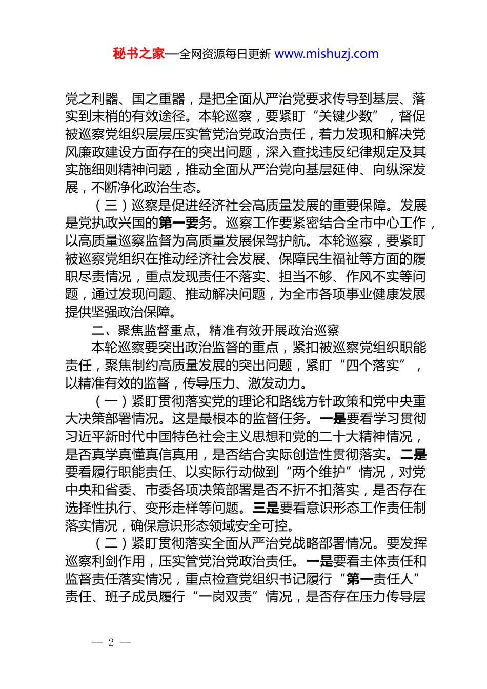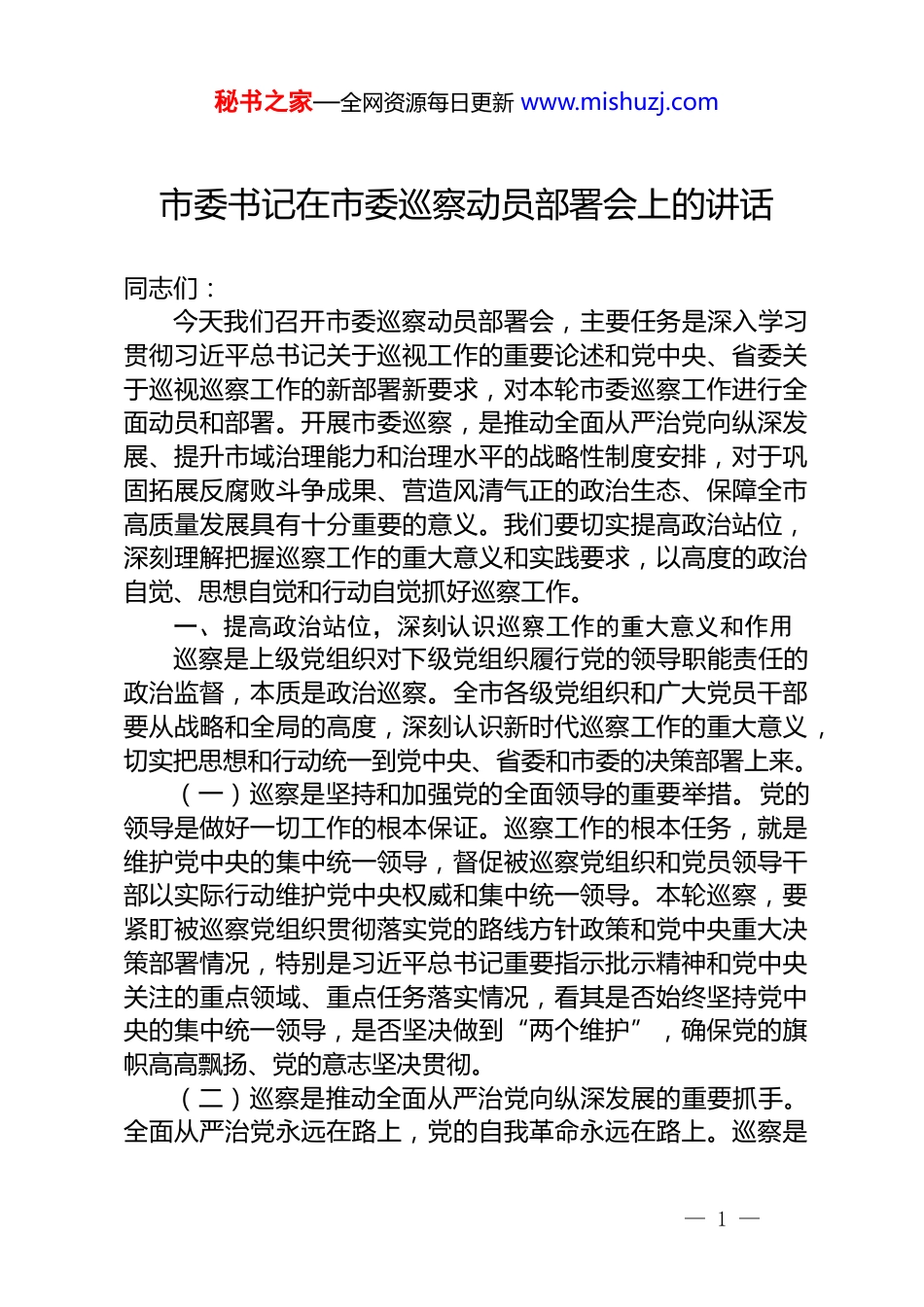 秘书之家—全网资源每日更新 www.mishuzj.com市委书记在市委巡察动员部署会上的讲话同志们:今天我们召开市委巡察动员部署会,主要任务是深入学习贯彻习近平总书记关于巡视工作的重要论述和党中央、省委关于巡视巡察工作的新部署新要求,对本轮市委巡察工作进行全面动员和部署。开展市委巡察,是推动全面从严治党向纵深发展、提升市域治理能力和治理水平的战略性制度安排,对于巩固拓展反腐败斗争成果、营造风清气正的政治生态、保障全市高质量发展具有十分重要的意义。我们要切实提高政治站位,深刻理解把握巡察工作的重大意义和实践要求,以高度的政治自觉、思想自觉和行动自觉抓好巡察工作。 一、提高政治站位,深刻认识巡察工作的重大意义和作用巡察是上级党组织对下级党组织履行党的领导职能责任的政治监督,本质是政治巡察。全市各级党组织和广大党员干部要从战略和全局的高度,深刻认识新时代巡察工作的重大意义,切实把思想和行动统一到党中央、省委和市委的决策部署上来。(一)巡察是坚持和加强党的全面领导的重要举措。党的领导是做好一切工作的根本保证。巡察工作的根本任务,就是维护党中央的集中统一领导,督促被巡察党组织和党员领导干部以实际行动维护党中央权威和集中统一领导。本轮巡察,要紧盯被巡察党组织贯彻落实党的路线方针政策和党中央重大决策部署情况,特别是习近平总书记重要指示批示精神和党中央关注的重点领域、重点任务落实情况,看其是否始终坚持党中央的集中统一领导,是否坚决做到“两个维护”,确保党的旗帜高高飘扬、党的意志坚决贯彻。(二)巡察是推动全面从严治党向纵深发展的重要抓手。全面从严治党永远在路上,党的自我革命永远在路上。巡察是— 1 —秘书之家—全网资源每日更新 www.mishuzj.com党之利器、国之重器,是把全面从严治党要求传导到基层、落实到末梢的有效途径。本轮巡察,要紧盯“关键少数”,督促被巡察党组织层层压实管党治党政治责任,着力发现和解决党风廉政建设方面存在的突出问题,深入查找违反纪律规定及其实施细则精神问题,推动全面从严治党向基层延伸、向纵深发展,不断净化政治生态。(三)巡察是促进经济社会高质量发展的重要保障。发展是党执政兴国的第一要务。巡察工作要紧密结合全市中心工作,以高质量巡察监督为高质量发展保驾护航。本轮巡察,要紧盯被巡察党组织在推动经济社会发展、保障民生福祉等方面的履职尽责情况,重点发现责任不落实、担当不够、作风不实等问题,通过发现问题、推动解决问题,为全市各项事业健康发展提供坚强政治保障。二、聚焦监督重点,精准有效开展政治巡察本轮巡察要突出政治监督的重点,紧扣被巡察党组织职能责任,聚焦制约高质量发展的突出问题,紧盯“四个落实”,以精准有效的监督,传导压力、激发动力。(一)紧盯贯彻落实党的理论和路线方针政策和党中央重大决策部署情况。这是最根本的监督任务。一是要看学习贯彻习近平新时代中国特色社会主义思想和党的二十大精神情况,是否真学真懂真信真用,是否结合实际创造性贯彻落实。二是要看履行职能责任、以实际行动做到“两个维护”情况,对党中央和省委、市委各项决策部署是否不折不扣落实,是否存在选择性执行、变形走样等问题。三是要看意识形态工作责任制落实情况,确保意识形态领域安全可控。(二)紧盯贯彻落实全面从严治党战略部署情况。要发挥巡察利剑作用,压实管党治党政治责任。一是要看主体责任和监督责任落实情况,重点检查党组织书记履行“第一责任人”责任、班子成员履行“一岗双责”情况,是否存在压力传导层— 2 —秘书之家—全网资源每日更新 www.mishuzj.com层递减、责任落实“上热下冷”现象。二是要看重点领域和关键环节廉洁风险防控情况,深入查找权力运行的风险点,严肃查处腐败问题。三是要看作风建设情况,持续纠治形式主义、官僚主义、享乐主义和奢靡之风,特别是对不作为、慢作为、乱作为等问题要坚决查处。(三)紧盯贯彻落实新时代党的组织路线情况。要加强组织建设,为事业发展提供坚强组织保证。一是要看领导班子建设情况,是否严格执行民主集中制,是否发挥整体合力。二是要看干部队...