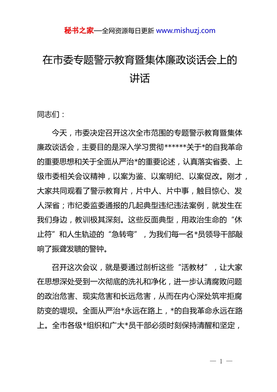 秘书之家—全网资源每日更新 www.mishuzj.com在市委专题警示教育暨集体廉政谈话会上的讲话同志们:今天,市委决定召开这次全市范围的专题警示教育暨集体廉政谈话会,主要目的是深入学习贯彻******关于*的自我革命的重要思想和关于全面从严治*的重要论述,认真落实省委、上级市委相关会议精神,以案为鉴、以案明纪、以案促改。刚才,大家共同观看了警示教育片,片中人、片中事,触目惊心、发人深省;市纪委监委通报的几起典型违纪违法案例,就发生在我们身边,教训极其深刻。这些反面典型,用政治生命的“休止符”和人生轨迹的“急转弯”,为我们每一名*员领导干部敲响了振聋发聩的警钟。召开这次会议,就是要通过剖析这些“活教材”,让大家在思想深处受到一次彻底的洗礼和净化,进一步认清腐败问题的政治危害、现实危害和长远危害,从而在内心深处筑牢拒腐防变的堤坝。全面从严治*永远在路上,*的自我革命永远在路上。全市各级*组织和广大*员干部必须时刻保持清醒和坚定,— 1 —秘书之家—全网资源每日更新 www.mishuzj.com持续释放全面从严、一严到底的强烈信号,以刀刃向内的勇气和刮骨疗毒的决心,坚定不移地推进*风廉政建设和反腐败斗争,为**市高质量发展提供坚强有力的政治和纪律保障。下面,结合今天的会议主题和当前的工作实际,我讲四点意见。一、铸牢绝对忠诚的政治品格始终把政治纪律挺在最前面d 的纪律是多方面的,但政治纪律是打头、管总的,是最重要、最根本、最关键的纪律。在所有纪律中,政治纪律是*员干部安身立命的“压舱石”。警示教育片中和通报案例里的那些“落马者”,他们走向腐化堕落的起点,无一不是从政治上出问题开始的。有的理想信念动摇,对*的创新理论学习不深、领悟不透,导致世界观、人生观、价值观发生严重扭曲;有的对*不忠诚、不老实,搞“两面派”,做“两面人”,当面一套、背后一套;有的无视*的政治纪律和政治规矩,在贯彻执行*中央和省市委决策部署上打折扣、搞变通、做选择,致使政令不畅、执行偏差。这些行为的本质,就是政治上的蜕化变质。对*绝对忠诚,是具体的、实践的,不是空洞的口号。检验是否忠诚,最直接的标尺就是看能否深刻领悟“两个确立”的决定性意义,能否增强“四个意识”、坚定“四个自信”、做到“两个维护”。这绝不能停留在口头表态上,而必须体现在— 2 —秘书之家—全网资源每日更新 www.mishuzj.com坚决贯彻*中央、省委和上级市委重大决策部署的具体行动上,体现在履职尽责、做好本职工作的实际成效上。当前,**市正处在转型升级、跨越发展的关键时期,无论是推动优秀传统文化创造性转化、创新性发展,还是加快新旧动能转换、构建现代化产业体系,抑或是深入实施乡村振兴战略、打造和美乡村,每一项工作都是重大的政治任务。全市各级领导干部必须站在政治和全局的高度来审视和推动工作,不折不扣地把上级的各项部署要求落到实处。要强化理论武装,不断夯实忠诚根基。思想上的滑坡是最危险的滑坡,信念上的动摇是最致命的动摇。必须坚持不懈用**************思想凝心铸魂,真正学出坚定信仰、学出绝对忠诚、学出使命担当。要把学习贯彻*的创新理论作为终身课题,读原著、学原文、悟原理,深刻把握其精神实质和实践要求,自觉做*的创新理论的坚定信仰者和忠实实践者。要通过学习,不断提高政治判断力、政治领悟力、政治执行力,善于从纷繁复杂的矛盾中把握政治逻辑,善于从倾向性、苗头性问题中发现政治端倪,确保在任何时候、任何情况下都同*中央保持高度一致。要严明政治规矩,坚决纠治落实偏差。纪律不严,规矩不— 3 —秘书之家—全网资源每日更新 www.mishuzj.com彰,是产生“七个有之”等问题的根源。必须把严守政治纪律和政治规矩摆在更加突出的位置,教育引导广大*员干部知敬畏、存戒惧、守底线。要坚决杜绝“上有政策、下有对策”的现象,对于中央和省市委明确的改革发展任务,必须闻令而动、听令而行,不允许搞变通、打折扣,更不允许合意的就执行、不合意的就搁置。市委将加大政治监督力度,对贯彻落实中央和省市委决策部署不力、责任悬空、执行棚架等问题,发现一起、查处一起,严肃追责...