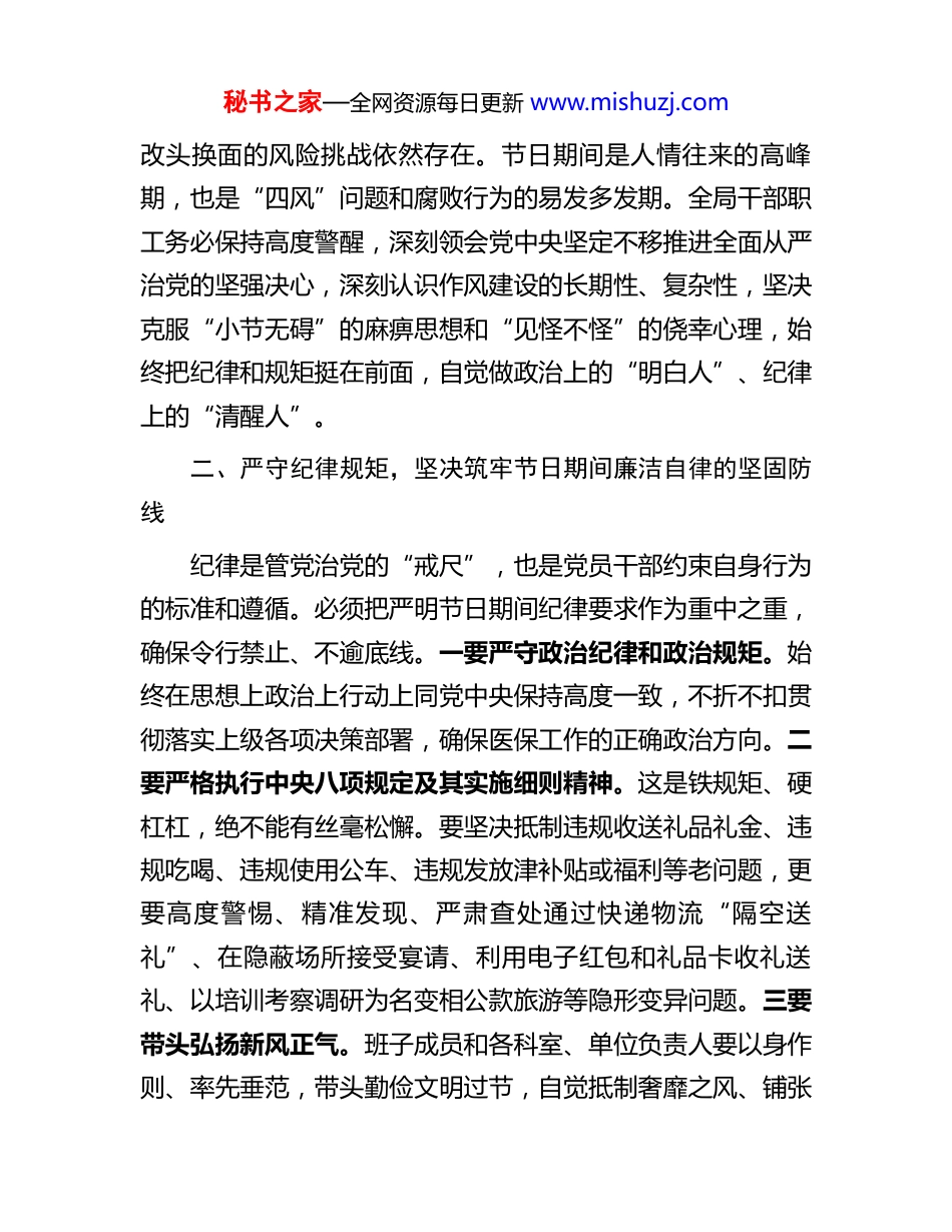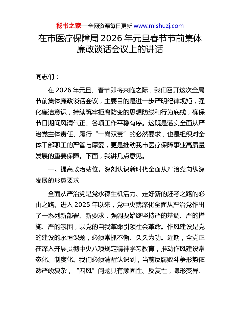 秘书之家—全网资源每日更新 www.mishuzj.com在市医疗保障局 2026 年元旦春节节前集体廉政谈话会议上的讲话同志们:在 2026 年元旦、春节即将来临之际,我们召开这次全局节前集体廉政谈话会议,主要目的是进一步严明纪律规矩,强化廉洁意识,持续筑牢拒腐防变的思想防线和行为底线,确保节日期间风清气正、各项工作平稳有序。这既是落实全面从严治党主体责任、履行“一岗双责”的必然要求,也是组织对全体干部职工的严管与厚爱,更是推动我市医疗保障事业高质量发展的重要保障。下面,我讲几点意见。一、提高政治站位,深刻认识新时代全面从严治党向纵深发展的形势要求全面从严治党是党永葆生机活力、走好新的赶考之路的必由之路。进入 2025 年以来,党中央就深化全面从严治党作出了一系列新部署、新要求,强调要始终坚持严的基调、严的措施、严的氛围,以党的自我革命引领社会革命。作风建设是党的建设的永恒课题,必须常抓不懈、久久为功。近期,全党正在深入开展贯彻中央八项规定精神学习教育,推动作风建设常态化、制度化。我们必须清醒认识到,当前反腐败斗争形势依然严峻复杂,“四风”问题具有顽固性、反复性,隐形变异、秘书之家—全网资源每日更新 www.mishuzj.com改头换面的风险挑战依然存在。节日期间是人情往来的高峰期,也是“四风”问题和腐败行为的易发多发期。全局干部职工务必保持高度警醒,深刻领会党中央坚定不移推进全面从严治党的坚强决心,深刻认识作风建设的长期性、复杂性,坚决克服“小节无碍”的麻痹思想和“见怪不怪”的侥幸心理,始终把纪律和规矩挺在前面,自觉做政治上的“明白人”、纪律上的“清醒人”。二、严守纪律规矩,坚决筑牢节日期间廉洁自律的坚固防线纪律是管党治党的“戒尺”,也是党员干部约束自身行为的标准和遵循。必须把严明节日期间纪律要求作为重中之重,确保令行禁止、不逾底线。一要严守政治纪律和政治规矩。始终在思想上政治上行动上同党中央保持高度一致,不折不扣贯彻落实上级各项决策部署,确保医保工作的正确政治方向。二要严格执行中央八项规定及其实施细则精神。这是铁规矩、硬杠杠,绝不能有丝毫松懈。要坚决抵制违规收送礼品礼金、违规吃喝、违规使用公车、违规发放津补贴或福利等老问题,更要高度警惕、精准发现、严肃查处通过快递物流“隔空送礼”、在隐蔽场所接受宴请、利用电子红包和礼品卡收礼送礼、以培训考察调研为名变相公款旅游等隐形变异问题。三要带头弘扬新风正气。班子成员和各科室、单位负责人要以身作则、率先垂范,带头勤俭文明过节,自觉抵制奢靡之风、铺张秘书之家—全网资源每日更新 www.mishuzj.com浪费,倡导清清爽爽的同志关系、规规矩矩的上下级关系,以优良党风政风引领社风民风。四要坚决杜绝酒驾醉驾等违纪违法行为。这不仅关乎个人安全,更关乎党纪国法、单位形象和家庭幸福,必须时刻警钟长鸣,做到开车不喝酒、喝酒不开车。三、聚焦主责主业,在履职尽责中践行医保为民的初心使命廉政建设与业务工作如同车之两轮、鸟之双翼,必须深度融合、相互促进。开展廉政谈话,根本目的之一是为了更好地保障人民群众的医保权益,提升服务效能。元旦春节期间,群众就医报销等医保服务需求依然旺盛。各科室、各单位要提前谋划、周密安排,确保节日期间医保政策不断档、经办服务不打烊。要充分利用数字化、信息化手段加强服务保障和风险防控。一方面,要加强医保信息平台运维保障,确保系统稳定、网络安全、数据畅通,为群众“网上办”、“掌上办”提供坚实支撑。另一方面,要依托智能监控、大数据分析等数字化工具,加强对定点医药机构诊疗行为和基金使用情况的实时监测与分析,提升打击欺诈骗保的精准性和效率,守好用好人民群众的“看病钱”“救命钱”。要畅通节日期间咨询投诉渠道,及时回应和解决群众在异地就医备案、门诊慢特病认定、医疗费用结算等方面遇到的“急难愁盼”问题。要特别关注老年群体、困难群众等特殊群体的医保需求,主动提供贴心便利服秘书之家—全网资源每日更新 www.mishuzj.com务。要以专业、高效、温暖的服务,让群众切实感受到医保政策的温度和力度,用实实在在的...