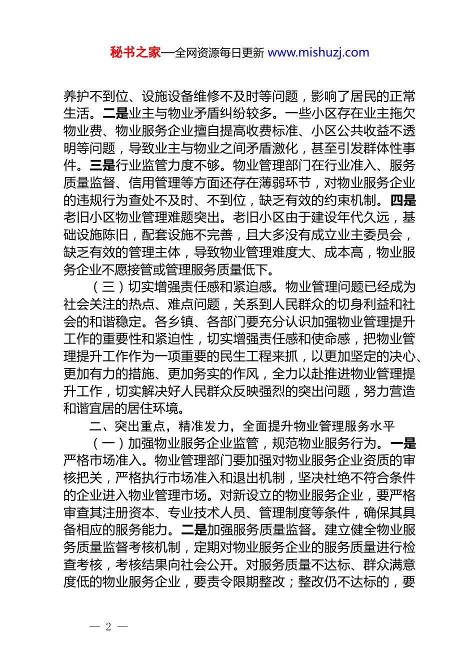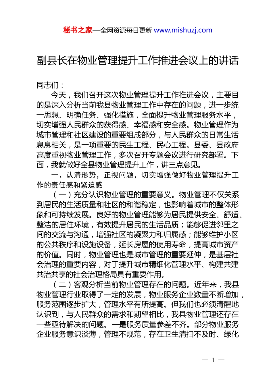 秘书之家—全网资源每日更新 www.mishuzj.com副县长在物业管理提升工作推进会议上的讲话同志们:今天,我们召开这次物业管理提升工作推进会议,主要目的是深入分析当前我县物业管理工作中存在的问题,进一步统一思想、明确任务、强化措施,全面提升物业管理服务水平,切实增强人民群众的获得感、幸福感和安全感。物业管理作为城市管理和社区建设的重要组成部分,与人民群众的日常生活息息相关,是一项重要的民生工程、民心工程。县委、县政府高度重视物业管理工作,多次召开专题会议进行研究部署。下面,我就做好全县物业管理提升工作,讲三点意见。一、认清形势,正视问题,切实增强做好物业管理提升工作的责任感和紧迫感(一)充分认识物业管理的重要意义。物业管理不仅关系到居民的生活质量和社区的和谐稳定,也影响着城市的整体形象和可持续发展。良好的物业管理能够为居民提供安全、舒适、整洁的居住环境,有效提升居民的生活品质;能够促进邻里之间的交流与沟通,增强社区的凝聚力和归属感;能够维护小区的公共秩序和设施设备,延长房屋的使用寿命,提高城市资产的价值。同时,物业管理也是城市管理的重要延伸,是基层社会治理的重要内容,对于提升城市精细化管理水平、构建共建共治共享的社会治理格局具有重要作用。(二)客观分析当前物业管理存在的问题。近年来,我县物业管理行业取得了一定的发展,物业服务企业数量不断增加,服务范围逐步扩大,管理水平有所提高。但我们也必须清醒地认识到,与人民群众的需求和期望相比,我县物业管理还存在一些亟待解决的问题。一是服务质量参差不齐。部分物业服务企业服务意识淡薄,管理不规范,存在卫生清扫不及时、绿化— 1 —秘书之家—全网资源每日更新 www.mishuzj.com养护不到位、设施设备维修不及时等问题,影响了居民的正常生活。二是业主与物业矛盾纠纷较多。一些小区存在业主拖欠物业费、物业服务企业擅自提高收费标准、小区公共收益不透明等问题,导致业主与物业之间矛盾激化,甚至引发群体性事件。三是行业监管力度不够。物业管理部门在行业准入、服务质量监督、信用管理等方面还存在薄弱环节,对物业服务企业的违规行为查处不及时、不到位,缺乏有效的约束机制。四是老旧小区物业管理难题突出。老旧小区由于建设年代久远,基础设施陈旧,配套设施不完善,且大多没有成立业主委员会,缺乏有效的管理主体,导致物业管理难度大、成本高,物业服务企业不愿接管或管理服务质量低下。(三)切实增强责任感和紧迫感。物业管理问题已经成为社会关注的热点、难点问题,关系到人民群众的切身利益和社会的和谐稳定。各乡镇、各部门要充分认识加强物业管理提升工作的重要性和紧迫性,切实增强责任感和使命感,把物业管理提升工作作为一项重要的民生工程来抓,以更加坚定的决心、更加有力的措施、更加务实的作风,全力以赴推进物业管理提升工作,切实解决好人民群众反映强烈的突出问题,努力营造和谐宜居的居住环境。二、突出重点,精准发力,全面提升物业管理服务水平(一)加强物业服务企业监管,规范物业服务行为。一是严格市场准入。物业管理部门要加强对物业服务企业资质的审核把关,严格执行市场准入和退出机制,坚决杜绝不符合条件的企业进入物业管理市场。对新设立的物业服务企业,要严格审查其注册资本、专业技术人员、管理制度等条件,确保其具备相应的服务能力。二是加强服务质量监督。建立健全物业服务质量监督考核机制,定期对物业服务企业的服务质量进行检查考核,考核结果向社会公开。对服务质量不达标、群众满意度低的物业服务企业,要责令限期整改;整改仍不达标的,要— 2 —秘书之家—全网资源每日更新 www.mishuzj.com依法依规清退出物业管理市场。三是强化信用管理。建立物业服务企业信用档案,将物业服务企业的基本信息、服务合同履行情况、投诉处理情况等纳入信用档案,作为企业资质升级、评先评优的重要依据。对信用良好的企业,给予表彰奖励和政策支持;对信用不良的企业,要列入重点监管对象,加大监督检查力度。(二)加强业主委员会建设,发挥业主自治作用。一是规范业主委员会组建。各乡镇要加...