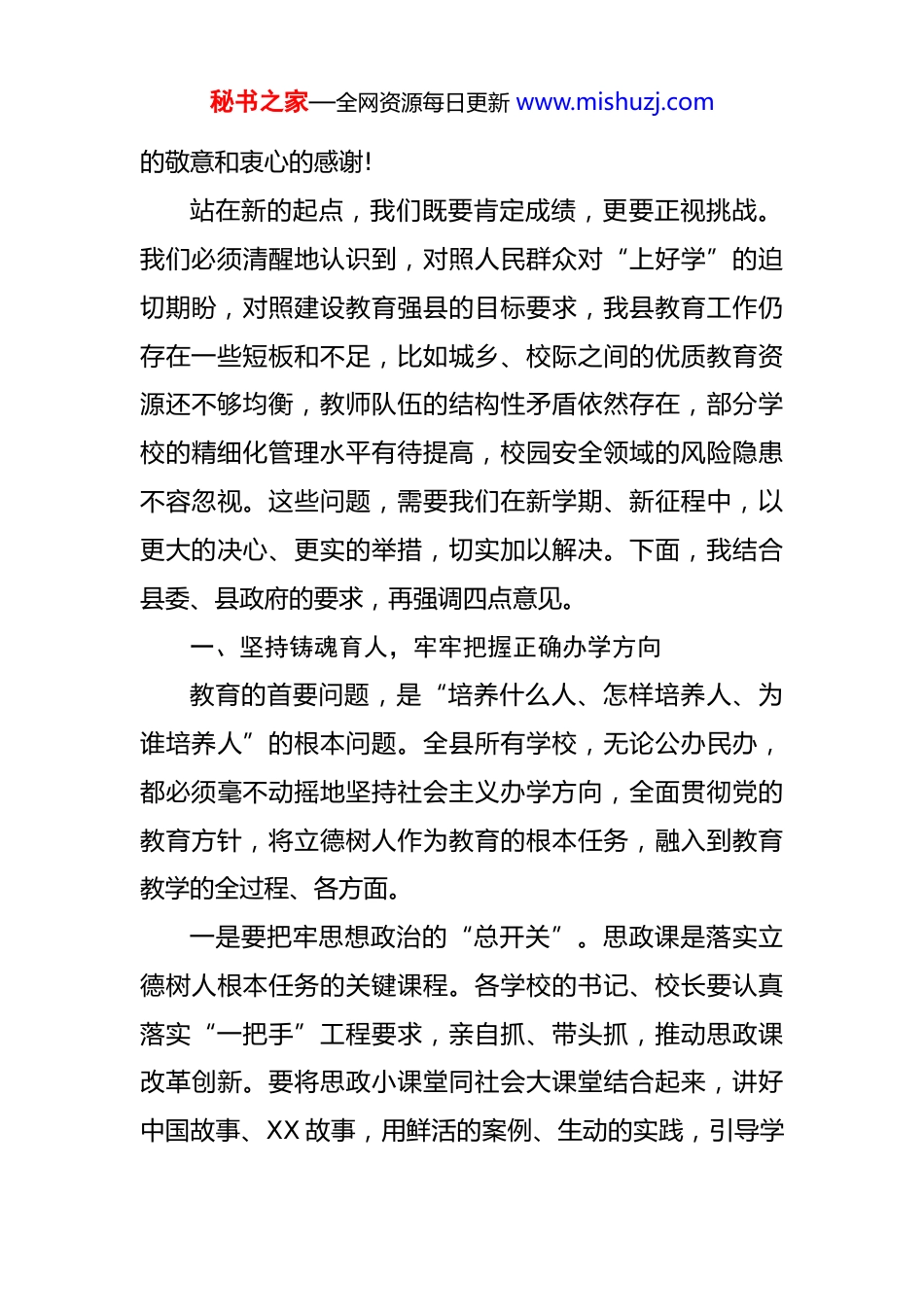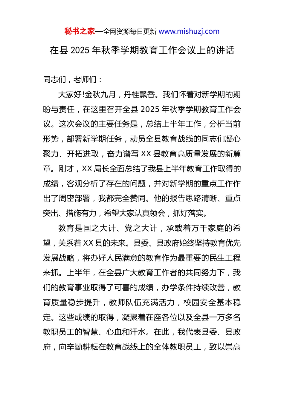 秘书之家—全网资源每日更新 www.mishuzj.com在县 2025 年秋季学期教育工作会议上的讲话 同志们,老师们:大家好!金秋九月,丹桂飘香。我们怀着对新学期的期盼与责任,在这里召开全县 2025 年秋季学期教育工作会议。这次会议的主要任务是,总结上半年工作,分析当前形势,部署新学期任务,动员全县教育战线的同志们凝心聚力、开拓进取,奋力谱写 XX 县教育高质量发展的新篇章。刚才,XX 局长全面总结了我县上半年教育工作取得的成绩,客观分析了存在的问题,并对新学期的重点工作作出了周密部署,我都完全赞同。他的报告思路清晰、重点突出、措施有力,希望大家认真领会,抓好落实。教育是国之大计、党之大计,承载着万千家庭的希望,关系着 XX 县的未来。县委、县政府始终坚持教育优先发展战略,将办好人民满意的教育作为最重要的民生工程来抓。上半年,在全县广大教育工作者的共同努力下,我们的教育事业取得了可喜的成绩,办学条件持续改善,教育质量稳步提升,教师队伍充满活力,校园安全基本稳定。这些成绩的取得,凝聚着在座各位以及全县一万多名教职员工的智慧、心血和汗水。在此,我代表县委、县政府,向辛勤耕耘在教育战线上的全体教职员工,致以崇高秘书之家—全网资源每日更新 www.mishuzj.com的敬意和衷心的感谢!站在新的起点,我们既要肯定成绩,更要正视挑战。我们必须清醒地认识到,对照人民群众对“上好学”的迫切期盼,对照建设教育强县的目标要求,我县教育工作仍存在一些短板和不足,比如城乡、校际之间的优质教育资源还不够均衡,教师队伍的结构性矛盾依然存在,部分学校的精细化管理水平有待提高,校园安全领域的风险隐患不容忽视。这些问题,需要我们在新学期、新征程中,以更大的决心、更实的举措,切实加以解决。下面,我结合县委、县政府的要求,再强调四点意见。一、坚持铸魂育人,牢牢把握正确办学方向教育的首要问题,是“培养什么人、怎样培养人、为谁培养人”的根本问题。全县所有学校,无论公办民办,都必须毫不动摇地坚持社会主义办学方向,全面贯彻党的教育方针,将立德树人作为教育的根本任务,融入到教育教学的全过程、各方面。一是要把牢思想政治的“总开关”。思政课是落实立德树人根本任务的关键课程。各学校的书记、校长要认真落实“一把手”工程要求,亲自抓、带头抓,推动思政课改革创新。要将思政小课堂同社会大课堂结合起来,讲好中国故事、XX 故事,用鲜活的案例、生动的实践,引导学秘书之家—全网资源每日更新 www.mishuzj.com生深刻理解党的领导、中国特色社会主义制度的优越性,厚植爱党、爱国、爱人民、爱社会主义的情感,让红色基因、革命薪火代代传承。同时,要深入推进课程思政建设,深挖各门学科中蕴含的思政元素,实现各类课程与思政课程同向同行,形成协同育人效应。二是要抓好学生发展的“全要素”。育人是育魂、育心、育才的统一。我们不能只盯着分数和升学率,而要着眼于学生的全面发展和终身发展。要积极培育和践行社会主义核心价值观,加强学生的品德修养、法治教育和心理健康教育,引导他们扣好人生的第一粒扣子。要加强体育锻炼,让孩子们在运动中享受乐趣、增强体质、健全人格、锤炼意志。要加强美育熏陶,提升学生的审美和人文素含。要加强劳动教育,引导学生崇尚劳动、尊重劳动,在实践中增长才干、磨炼意志。我们要培养的,是德智体美劳全面发展的社会主义建设者和接班人,这才是教育的初心和使命。三是要守好意识形态的“主阵地”。校园是知识传播的高地,也必须是意识形态安全的高地。各位校长、书记要切实担负起意识形态工作主体责任,加强对课堂教学、学术讲座、校园网络、学生社团等各类阵地的管理,坚决抵制各种错误思潮和有害信息的侵蚀。要教育引导广大教秘书之家—全网资源每日更新 www.mishuzj.com师严守政治纪律和政治规矩,在课堂内外、线上线下都做到言有所戒、行有所止,以身作则,为人师表,成为学生健康成长的可靠引路人。二、聚焦质量核心,全力提升教育教学水平教育质量是教育事业的生命线,是衡量一个地区教育发展水平的核心标志。我们要始终把提升质量作为教育改革发展的核...