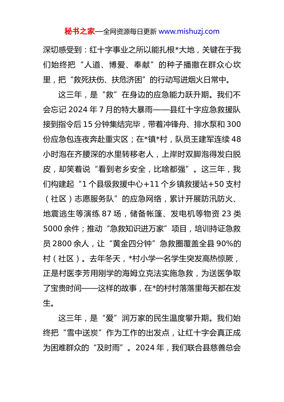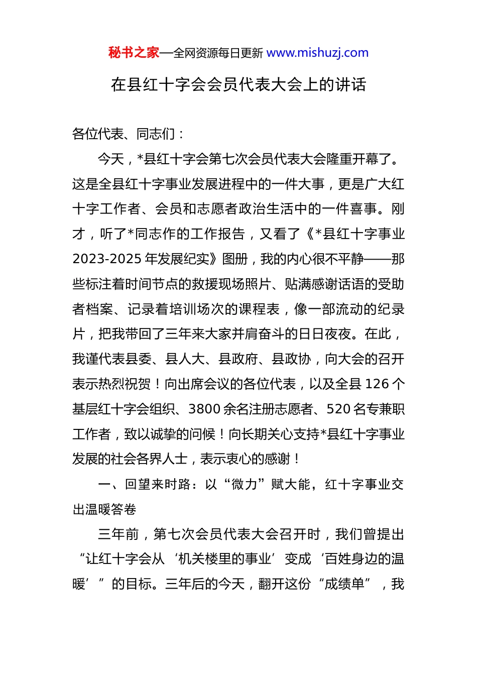 秘书之家—全网资源每日更新 www.mishuzj.com在县红十字会会员代表大会上的讲话 各位代表、同志们:今天,*县红十字会第七次会员代表大会隆重开幕了。这是全县红十字事业发展进程中的一件大事,更是广大红十字工作者、会员和志愿者政治生活中的一件喜事。刚才,听了*同志作的工作报告,又看了《*县红十字事业2023-2025 年发展纪实》图册,我的内心很不平静——那些标注着时间节点的救援现场照片、贴满感谢话语的受助者档案、记录着培训场次的课程表,像一部流动的纪录片,把我带回了三年来大家并肩奋斗的日日夜夜。在此,我谨代表县委、县人大、县政府、县政协,向大会的召开表示热烈祝贺!向出席会议的各位代表,以及全县 126 个基层红十字会组织、3800 余名注册志愿者、520 名专兼职工作者,致以诚挚的问候!向长期关心支持*县红十字事业发展的社会各界人士,表示衷心的感谢!一、回望来时路:以“微力”赋大能,红十字事业交出温暖答卷三年前,第七次会员代表大会召开时,我们曾提出“让红十字会从‘机关楼里的事业’变成‘百姓身边的温暖’”的目标。三年后的今天,翻开这份“成绩单”,我秘书之家—全网资源每日更新 www.mishuzj.com深切感受到:红十字事业之所以能扎根*大地,关键在于我们始终把“人道、博爱、奉献”的种子播撒在群众心坎里,把“救死扶伤、扶危济困”的行动写进烟火日常中。这三年,是“救”在身边的应急能力跃升期。我们不会忘记 2024 年 7 月的特大暴雨——县红十字应急救援队接到指令后 15 分钟集结完毕,带着冲锋舟、排水泵和 300份应急包连夜奔赴重灾区;在*镇*村,队员王建军连续 48小时泡在齐腰深的水里转移老人,上岸时双脚泡得发白脱皮,却笑着说“看到老乡安全,比啥都强”。这三年,我们构建起“1 个县级救援中心+11 个乡镇救援站+50 支村(社区)志愿服务队”的应急网络,累计开展防汛防火、地震逃生等演练 87 场,储备帐篷、发电机等物资 23 类5000 余件;推动“急救知识进万家”项目,培训持证急救员 2800 余人,让“黄金四分钟”急救圈覆盖全县 90%的村(社区)。去年冬天,*村小学一名学生突发高热惊厥,正是村医李芳用刚学的海姆立克法实施急救,为送医争取了宝贵时间——这样的故事,在*的村村落落里每天都在发生。这三年,是“爱”润万家的民生温度攀升期。我们始终把“雪中送炭”作为工作的出发点,让红十字会真正成为困难群众的“及时雨”。2024 年,我们联合县慈善总会秘书之家—全网资源每日更新 www.mishuzj.com发起“暖冬行动”,为全县 1200 户低保家庭、300 名困境儿童送去过冬物资,其中 78 岁的独居老人张桂英拉着志愿者的手说:“你们送来的电热毯,比我亲闺女想得还周到。”我们还创新“医疗救助+产业帮扶”模式,针对农村大病家庭推出“红十字健康包”(含常用药品、体检卡和种植技术手册),去年共发放 1500 份,帮助 32 户家庭通过种植高山蔬菜实现增收。更让我感动的是,全县造血干细胞捐献登记人数从 2022 年的 87 人增长到今年的 213人,成功捐献 12 例——每一例捐献背后,都是一位普通人的“生命托举”:比如县医院的护士小刘,为了捐献推迟了婚礼;外卖小哥老陈利用休息时间采集血样,说“能救人,比多跑几单有意义”。这些平凡人的善举,让“*温度”传得更远、更暖。这三年,是“联”聚合力的社会动员深化期。红十字事业不是“独角戏”,而是“大合唱”。我们坚持“开门办会”,让企业、乡贤、青少年都成为“出题人”“答题人”“阅卷人”。2024 年,我们联合县工商联开展“企业红十字日”活动,23 家企业现场捐赠款物 86 万元,其中*制衣公司不仅捐钱,还把闲置的缝纫机送到乡村红十字服务站,用于制作急救包;县实验中学把红十字课纳入校本课程,孩子们自己设计的“校园急救漫画手册”被省红十秘书之家—全网资源每日更新 www.mishuzj.com字会收录推广;我们还培育了“红领巾志愿者”“银龄互助队”等特色队伍,其中“五老”志愿者李奶奶牵头成立的“隔代关爱小组”,三年来陪伴照顾留守儿童 400 余人次——这些创新实践,让红十字会从“小众公益”变成了...