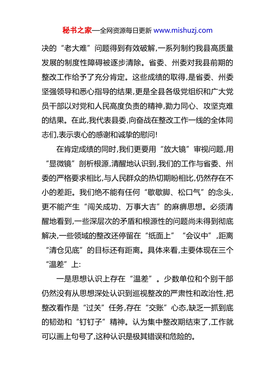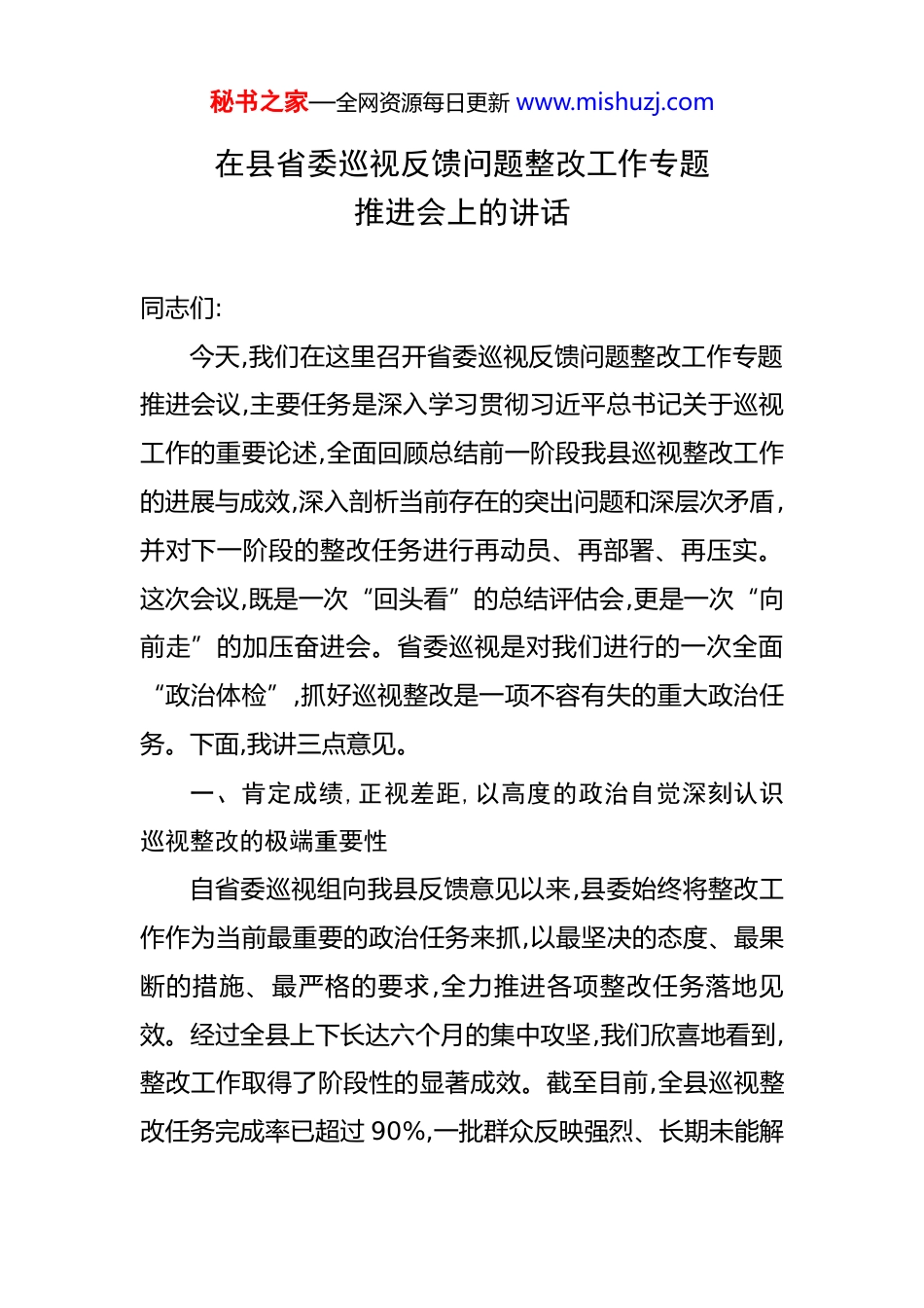 秘书之家—全网资源每日更新 www.mishuzj.com在县省委巡视反馈问题整改工作专题推进会上的讲话 同志们:今天,我们在这里召开省委巡视反馈问题整改工作专题推进会议,主要任务是深入学习贯彻习近平总书记关于巡视工作的重要论述,全面回顾总结前一阶段我县巡视整改工作的进展与成效,深入剖析当前存在的突出问题和深层次矛盾,并对下一阶段的整改任务进行再动员、再部署、再压实。这次会议,既是一次“回头看”的总结评估会,更是一次“向前走”的加压奋进会。省委巡视是对我们进行的一次全面“政治体检”,抓好巡视整改是一项不容有失的重大政治任务。下面,我讲三点意见。一、肯定成绩,正视差距,以高度的政治自觉深刻认识巡视整改的极端重要性自省委巡视组向我县反馈意见以来,县委始终将整改工作作为当前最重要的政治任务来抓,以最坚决的态度、最果断的措施、最严格的要求,全力推进各项整改任务落地见效。经过全县上下长达六个月的集中攻坚,我们欣喜地看到,整改工作取得了阶段性的显著成效。截至目前,全县巡视整改任务完成率已超过 90%,一批群众反映强烈、长期未能解秘书之家—全网资源每日更新 www.mishuzj.com决的“老大难”问题得到有效破解,一系列制约我县高质量发展的制度性障碍被逐步清除。省委、州委对我县前期的整改工作给予了充分肯定。这些成绩的取得,是省委、州委坚强领导和悉心指导的结果,更是全县各级党组织和广大党员干部以对党和人民高度负责的精神,勠力同心、攻坚克难的结果。在此,我代表县委,向奋战在整改工作一线的全体同志们,表示衷心的感谢和诚挚的慰问!在肯定成绩的同时,我们更要用“放大镜”审视问题,用“显微镜”剖析根源,清醒地认识到,我们的工作与省委、州委的严格要求相比,与人民群众的热切期盼相比,仍然存在不小的差距。我们绝不能有任何“歇歇脚、松口气”的念头,更不能产生“闯关成功、万事大吉”的麻痹思想。必须清醒地看到,一些深层次的矛盾和根源性的问题尚未得到彻底解决,一些领域的整改还停留在“纸面上”“会议中”,距离“清仓见底”的目标还有距离。具体来看,主要体现在三个“温差”上:一是思想认识上存在“温差”。少数单位和个别干部仍然没有从思想深处认识到巡视整改的严肃性和政治性,把整改看作是“过关”任务,存在“交账”心态,缺乏一抓到底的韧劲和“钉钉子”精神。认为集中整改期结束了,工作就可以画上句号了,这种认识是极其错误和危险的。秘书之家—全网资源每日更新 www.mishuzj.com二是责任传导上存在“温差”。压力传导层层递减的现象依然存在,“上热中温下冷”的问题没有从根本上扭转。有的单位主要负责同志满足于开会部署、批示文件,对重点难点问题缺乏靠前指挥、亲自督办的力度,责任链条未能真正压实到“最后一公里”。三是整改成效上存在“温差”。一些问题的整改措施不够精准,治标不治本。有的整改满足于“当下改”,缺乏“长久立”的机制建设考量;有的整改满足于解决表面问题,没有深入挖掘背后的体制机制漏洞。这些问题都警示我们,巡视整改是一场必须打赢的硬仗,任务依然艰巨繁重,我们必须以刀刃向内的勇气和自我革命的精神,将整改工作不断引向深入。二、提高站位,深化认识,以坚定的政治担当扛起巡视整改的重大政治责任抓好巡视整改,不仅仅是解决具体问题,更是一场深刻的政治检验。全县各级党组织和广大党员干部必须站在政治和全局的高度,进一步深化对巡视整改工作重大意义的理解和把握。第一,巡视整改是对政治忠诚的“试金石”。巡视是党之利剑、国之利器。省委巡视反馈的意见,代表的是省委的意见和权威,体现的是党中央的要求。能否不折不扣地抓好秘书之家—全网资源每日更新 www.mishuzj.com整改落实,是检验我们是否同以习近平同志为核心的党中央保持高度一致的直接体现,是检验我们“四个意识”强不强、“四个自信”牢不牢、“两个维护”做得好不好的重要标尺。我们必须把抓好巡视整改作为一项严肃的政治纪律和政治规矩,以实际行动诠释对党的绝对忠诚。任何的敷衍塞责、虚假整改,都是政治上的不成熟、不坚定。第二,巡视整改是推动高质量发展的“催化剂”。巡视反馈的问题,表面上看是工作中的具体偏差,但深层次上反映的是我们...