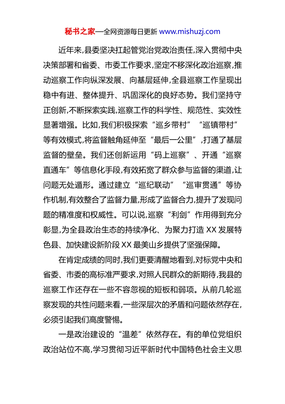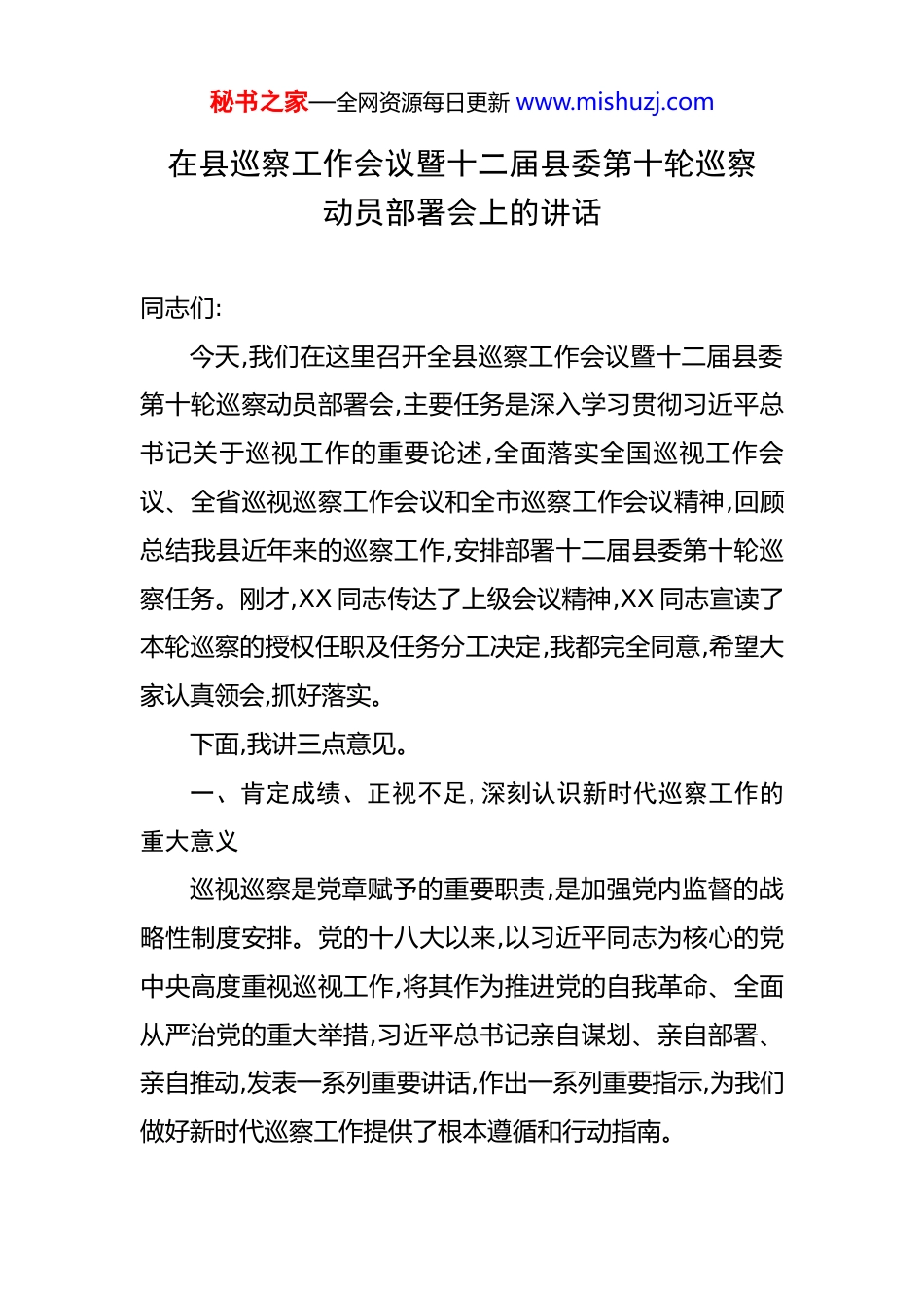 秘书之家—全网资源每日更新 www.mishuzj.com在县巡察工作会议暨十二届县委第十轮巡察动员部署会上的讲话 同志们:今天,我们在这里召开全县巡察工作会议暨十二届县委第十轮巡察动员部署会,主要任务是深入学习贯彻习近平总书记关于巡视工作的重要论述,全面落实全国巡视工作会议、全省巡视巡察工作会议和全市巡察工作会议精神,回顾总结我县近年来的巡察工作,安排部署十二届县委第十轮巡察任务。刚才,XX 同志传达了上级会议精神,XX 同志宣读了本轮巡察的授权任职及任务分工决定,我都完全同意,希望大家认真领会,抓好落实。下面,我讲三点意见。一、肯定成绩、正视不足,深刻认识新时代巡察工作的重大意义巡视巡察是党章赋予的重要职责,是加强党内监督的战略性制度安排。党的十八大以来,以习近平同志为核心的党中央高度重视巡视工作,将其作为推进党的自我革命、全面从严治党的重大举措,习近平总书记亲自谋划、亲自部署、亲自推动,发表一系列重要讲话,作出一系列重要指示,为我们做好新时代巡察工作提供了根本遵循和行动指南。秘书之家—全网资源每日更新 www.mishuzj.com近年来,县委坚决扛起管党治党政治责任,深入贯彻中央决策部署和省委、市委工作要求,坚定不移深化政治巡察,推动巡察工作向纵深发展、向基层延伸,全县巡察工作呈现出稳中有进、整体提升、巩固深化的良好态势。我们坚持守正创新,不断探索实践,巡察工作的科学性、规范性、实效性显著增强。比如,我们积极探索“巡乡带村”“巡镇带村”等有效模式,将监督触角延伸至“最后一公里”,打通了基层监督的壁垒。我们还创新运用“码上巡察”、开通“巡察直通车”等信息化手段,有效拓宽了群众参与监督的渠道,让问题无处遁形。通过建立“巡纪联动”“巡审贯通”等协作机制,有效整合了监督力量,形成了监督合力,提升了发现问题的精准度和权威性。可以说,巡察“利剑”作用得到充分彰显,为全县政治生态的持续净化、为聚力打造 XX 发展特色县、加快建设新阶段 XX 最美山乡提供了坚强保障。在肯定成绩的同时,我们更要清醒地看到,对标党中央和省委、市委的高标准严要求,对照人民群众的新期待,我县的巡察工作还存在一些不容忽视的短板和弱项。从前几轮巡察发现的共性问题来看,一些深层次的矛盾和问题依然存在,必须引起我们高度警惕。一是政治建设的“温差”依然存在。有的单位党组织政治站位不高,学习贯彻习近平新时代中国特色社会主义思秘书之家—全网资源每日更新 www.mishuzj.com想和党的二十大精神浮于表面、流于形式,未能真正做到学思用贯通、知信行统一,与上级决策部署在思想认识和行动落实上存在“温差”“落差”和“偏差”。有的单位党的领导核心作用发挥不充分,落实民主集中制、“三重一大”决策制度不严格,推动本地本单位高质量发展的思路不清、措施不力,存在重业务、轻政治的倾向。二是群众身边的“微腐败”依然易发多发。一些单位作风建设不扎实,形式主义、官僚主义问题禁而未绝,服务群众意识不强、效率不高,对群众急难愁盼问题推诿扯皮、敷衍塞责。有的领域廉洁风险依然突出,在工程项目建设、政府采购、惠民资金发放、集体“三资”管理等方面,仍然存在违规操作、优亲厚友、虚报冒领甚至侵占挪用的现象。这些问题虽然看似不大,但直接侵害群众的切身利益,严重损害党和政府的形象。三是基层党建的“短板”依然明显。有的基层党组织软弱涣散,政治功能和组织功能不强,党内政治生活不严肃、不规范,党员教育管理监督宽松软。有的单位选人用人视野不宽、程序不严,干部队伍建设缺乏长远规划。特别是一些被巡察单位对上一轮巡察反馈问题的整改,存在“纸面整改”“选择性整改”的现象,整改责任压得不实,长效机制建立不全,导致一些老问题反复出现、回潮反弹。秘书之家—全网资源每日更新 www.mishuzj.com这些问题的存在,充分说明我县全面从严治党永远在路上,党的自我革命永远在路上。全县各级党组织和广大党员干部必须保持清醒头脑,深刻认识巡察工作的长期性、复杂性、艰巨性,切实增强做好新时代巡察工作的政治自觉、思想自觉和行动自觉,以永远在路上的坚韧和执着,把利剑磨得更光更亮。二、聚焦重点、精准发力,高标准高质量完成本轮巡...
