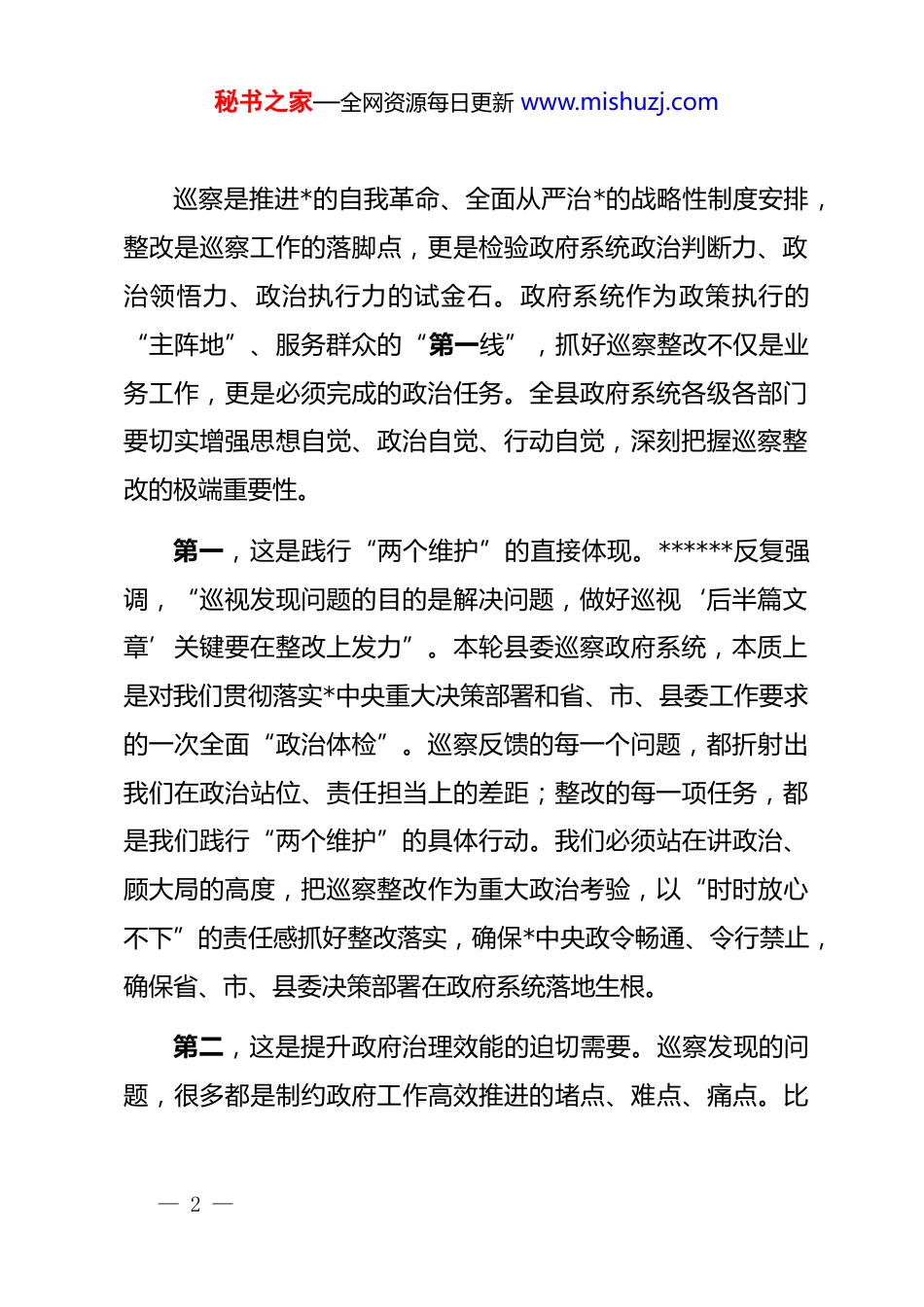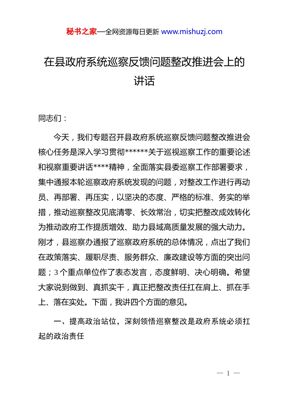 秘书之家—全网资源每日更新 www.mishuzj.com在县政府系统巡察反馈问题整改推进会上的讲话同志们:今天,我们专题召开县政府系统巡察反馈问题整改推进会核心任务是深入学习贯彻******关于巡视巡察工作的重要论述和视察重要讲话****精神,全面落实县委巡察工作部署要求,集中通报本轮巡察政府系统发现的问题,对整改工作进行再动员、再部署、再压实,以坚决的态度、严格的标准、务实的举措,推动巡察整改见底清零、长效常治,切实把整改成效转化为推动政府工作提质增效、助力县域高质量发展的强大动力。刚才,县巡察办通报了巡察政府系统的总体情况,点出了我们在政策落实、履职尽责、服务群众、廉政建设等方面的突出问题;3 个重点单位作了表态发言,态度鲜明、决心明确。希望大家说到做到、真抓实干,真正把整改责任扛在肩上、抓在手上、落在实处。下面,我讲四个方面的意见。一、提高政治站位,深刻领悟巡察整改是政府系统必须扛起的政治责任— 1 —秘书之家—全网资源每日更新 www.mishuzj.com巡察是推进*的自我革命、全面从严治*的战略性制度安排,整改是巡察工作的落脚点,更是检验政府系统政治判断力、政治领悟力、政治执行力的试金石。政府系统作为政策执行的“主阵地”、服务群众的“第一线”,抓好巡察整改不仅是业务工作,更是必须完成的政治任务。全县政府系统各级各部门要切实增强思想自觉、政治自觉、行动自觉,深刻把握巡察整改的极端重要性。第一,这是践行“两个维护”的直接体现。******反复强调,“巡视发现问题的目的是解决问题,做好巡视‘后半篇文章’关键要在整改上发力”。本轮县委巡察政府系统,本质上是对我们贯彻落实*中央重大决策部署和省、市、县委工作要求的一次全面“政治体检”。巡察反馈的每一个问题,都折射出我们在政治站位、责任担当上的差距;整改的每一项任务,都是我们践行“两个维护”的具体行动。我们必须站在讲政治、顾大局的高度,把巡察整改作为重大政治考验,以“时时放心不下”的责任感抓好整改落实,确保*中央政令畅通、令行禁止,确保省、市、县委决策部署在政府系统落地生根。第二,这是提升政府治理效能的迫切需要。巡察发现的问题,很多都是制约政府工作高效推进的堵点、难点、痛点。比— 2 —秘书之家—全网资源每日更新 www.mishuzj.com如,部分单位存在行政审批流程繁琐、政策落实“中梗阻”、项目建设推进滞后、资金使用监管不严等问题,这些问题直接影响政府执行力和公信力,阻碍县域高质量发展。我们要以巡察整改为契机,把解决具体问题与完善制度机制结合起来,把补齐短板弱项与提升治理能力结合起来,切实解决一批长期想解决而未解决的“老大难”问题,不断提升政府科学决策、精准施策、高效落实的能力水平,推动政府治理体系和治理能力现代化建设迈出新步伐。第三,这是践行以人民为中心发展思想的必然要求。巡察反馈的问题,大多与群众生产生活息息相关,比如老旧小区改造进度滞后、农村饮水安全保障不足、教育医疗资源均衡配置不够、政务服务态度生硬等。这些问题看似具体琐碎,却直接关系群众的获得感、幸福感、安全感,是检验我们是否真正把群众放在心上的“试金石”。我们必须牢固树立以人民为中心的发展思想,把巡察整改作为回应群众关切、解决群众诉求的重要抓手,用心用情用力解决好群众反映强烈的突出问题,让群众真正感受到巡察整改带来的新变化、新气象,不断厚植*执政的群众基础。第四,这是推进政府系统全面从严治*的重要举措。政府系— 3 —秘书之家—全网资源每日更新 www.mishuzj.com统掌握着大量公共资源和行政权力,是全面从严治*的重要阵地。巡察反馈的廉政风险点,比如工程招投标领域不规范、村级“三资”管理混乱、小微权力监督缺位、形式主义官僚主义仍有反弹等,暴露出我们在廉政风险防控上还存在漏洞。我们要以巡察整改为切入点,压实全面从严治*主体责任,强化对权力运行的制约和监督,坚决纠治不正之风,严肃查处违纪违法问题,营造风清气正的政治生态和干事创业的良好环境,锻造一支忠诚干净担当的政府干部队伍。二、坚持问题导向,客观正视巡察整改的成效与短板自本轮巡察启动...