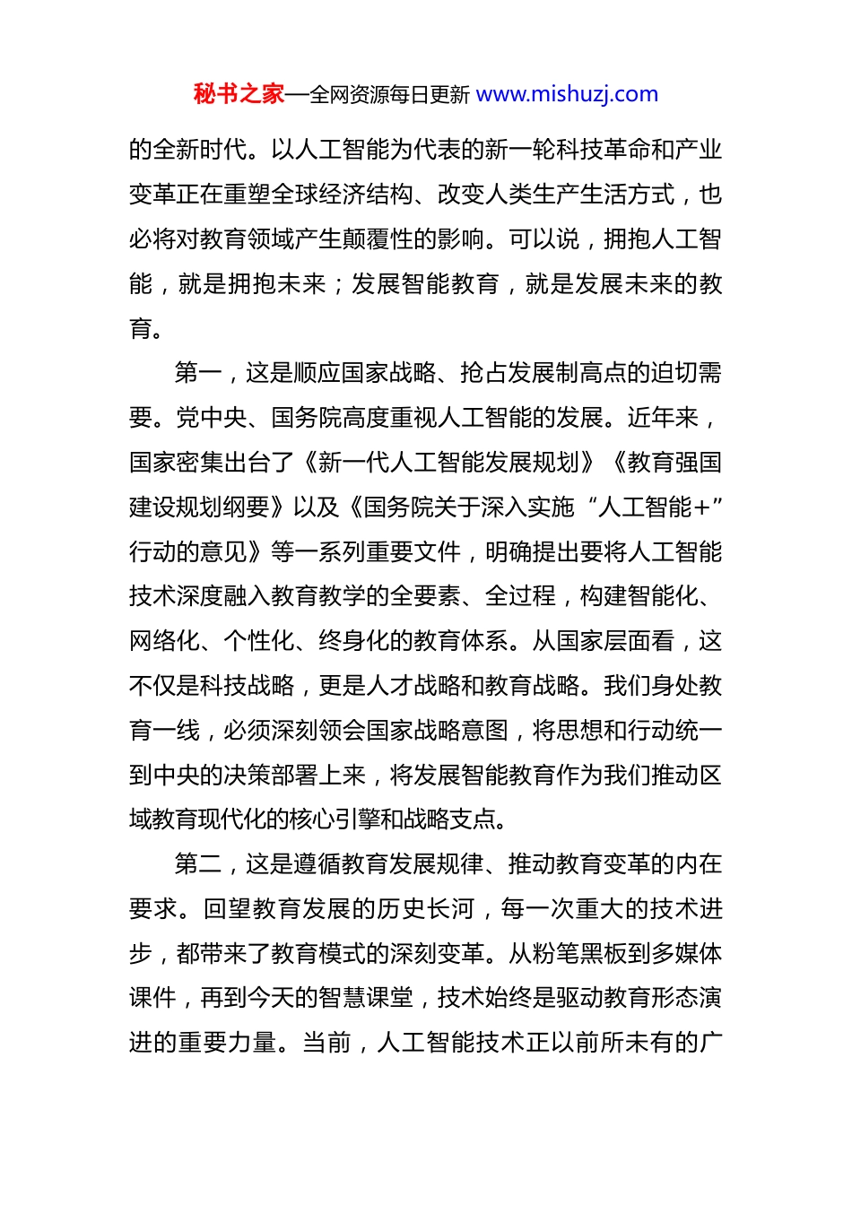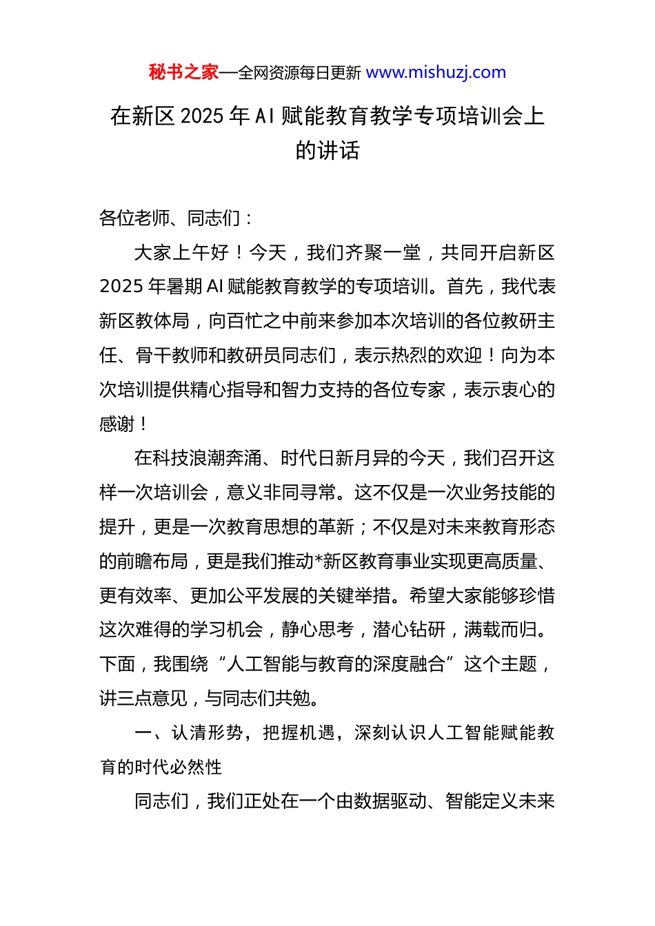 秘书之家—全网资源每日更新 www.mishuzj.com在新区 2025 年 AI 赋能教育教学专项培训会上的讲话 各位老师、同志们:大家上午好!今天,我们齐聚一堂,共同开启新区2025 年暑期 AI 赋能教育教学的专项培训。首先,我代表新区教体局,向百忙之中前来参加本次培训的各位教研主任、骨干教师和教研员同志们,表示热烈的欢迎!向为本次培训提供精心指导和智力支持的各位专家,表示衷心的感谢!在科技浪潮奔涌、时代日新月异的今天,我们召开这样一次培训会,意义非同寻常。这不仅是一次业务技能的提升,更是一次教育思想的革新;不仅是对未来教育形态的前瞻布局,更是我们推动*新区教育事业实现更高质量、更有效率、更加公平发展的关键举措。希望大家能够珍惜这次难得的学习机会,静心思考,潜心钻研,满载而归。下面,我围绕“人工智能与教育的深度融合”这个主题,讲三点意见,与同志们共勉。一、认清形势,把握机遇,深刻认识人工智能赋能教育的时代必然性同志们,我们正处在一个由数据驱动、智能定义未来秘书之家—全网资源每日更新 www.mishuzj.com的全新时代。以人工智能为代表的新一轮科技革命和产业变革正在重塑全球经济结构、改变人类生产生活方式,也必将对教育领域产生颠覆性的影响。可以说,拥抱人工智能,就是拥抱未来;发展智能教育,就是发展未来的教育。第一,这是顺应国家战略、抢占发展制高点的迫切需要。党中央、国务院高度重视人工智能的发展。近年来,国家密集出台了《新一代人工智能发展规划》《教育强国建设规划纲要》以及《国务院关于深入实施“人工智能+”行动的意见》等一系列重要文件,明确提出要将人工智能技术深度融入教育教学的全要素、全过程,构建智能化、网络化、个性化、终身化的教育体系。从国家层面看,这不仅是科技战略,更是人才战略和教育战略。我们身处教育一线,必须深刻领会国家战略意图,将思想和行动统一到中央的决策部署上来,将发展智能教育作为我们推动区域教育现代化的核心引擎和战略支点。第二,这是遵循教育发展规律、推动教育变革的内在要求。回望教育发展的历史长河,每一次重大的技术进步,都带来了教育模式的深刻变革。从粉笔黑板到多媒体课件,再到今天的智慧课堂,技术始终是驱动教育形态演进的重要力量。当前,人工智能技术正以前所未有的广秘书之家—全网资源每日更新 www.mishuzj.com度、深度和速度渗透到教育领域。根据相关研究机构预测,到 2025 年,中国 AI+教育的市场规模预计将突破700 亿元,到 2030 年,这一数字可能接近 3000 亿元。这背后反映的,是人工智能技术在提升教学效率、优化教学资源、实现因材施教等方面的巨大潜力。有数据显示,在部分试点项目中,人工智能的应用能够帮助教学效率提升超过 30%,学生作业完成度提升 25%。这充分说明,人工智能不是可有可无的“装饰品”,而是能够撬动教育质量整体跃升的“新杠杆”。我们必须清醒地认识到,固守传统的教学观念和方法,无异于在智能时代“刻舟求剑”,必将被时代所淘汰。第三,这是回应社会发展需求、培养未来人才的使命担当。我们今天的学生,是未来社会建设的主力军。他们未来所面临的社会,将是一个高度智能化、人机协同的社会。这对人才的知识结构、能力素养提出了全新的要求。我们的教育,不能只停留在知识的单向传授,更要着眼于学生创新精神、实践能力、协作能力和终身学习能力的培养。人工智能技术恰好为我们实现这一目标提供了有力的工具。它可以将教师从繁琐、重复的劳动中解放出来,有更多精力去关注学生的情感、品格和高阶思维能力的培养;它可以为每个学生构建个性化的学习路径和资源库,秘书之家—全网资源每日更新 www.mishuzj.com让“因材施教”的千年梦想照进现实。因此,推动 AI 赋能教育,本质上是落实立德树人根本任务,为国家培养能够适应未来、创造未来的创新型人才。这是我们每一位教育工作者义不容辞的时代责任。二、聚焦关键,精准发力,全面擘画我区 AI 教育应用的实践蓝图面对人工智能带来的机遇与挑战,我们不能只停留在思想认识层面,更要拿出切实可行的行动方案,将宏伟蓝图转化为我区教育发展的...