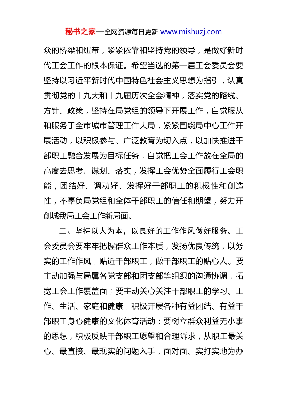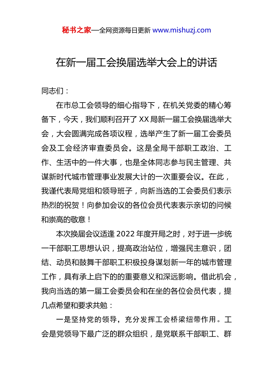 秘书之家—全网资源每日更新 www.mishuzj.com在新一届工会换届选举大会上的讲话同志们:在市总工会领导的细心指导下,在机关党委的精心筹备下,今天,我们顺利召开了 XX 局新一届工会换届选举大会,大会圆满完成各项议程,选举产生了新一届工会委员会及工会经济审查委员会。这是全局干部职工政治、工作、生活中的一件大事,也是全体同志参与民主管理、共谋新时代城市管理事业发展大计的一次重要会议。在此,我谨代表局党组和领导班子,向新当选的工会委员们表示热烈的祝贺!向参加会议的各位会员代表表示亲切的问候和崇高的敬意!本次换届会议适逢 2022 年度开局之时,对于进一步统一干部职工思想认识,提高政治站位,增强民主意识,团结、动员和鼓舞干部职工积极投身谋划新一年的城市管理工作,具有承上启下的的重要意义和深远影响。借此机会,我向当选的第一届工会委员会和在坐的各位会员代表,提几点希望和要求共勉:一是坚持党的领导,充分发挥工会桥梁纽带作用。工会是党领导下最广泛的群众组织,是党联系干部职工、群秘书之家—全网资源每日更新 www.mishuzj.com众的桥梁和纽带,紧紧依靠和坚持党的领导,是做好新时代工会工作的根本保证。希望当选的第一届工会委员会要坚持以习近平新时代中国特色社会主义思想为指引,认真贯彻党的十九大和十九届历次全会精神,落实党的路线、方针、政策,坚持在局党组的领导下开展工作,自觉服从和服务于全市城市管理工作大局,紧紧围绕局中心工作开展活动,以积极参与、广泛教育为切入点,以加快推进干部职工融合发展为目标任务,自觉把工会工作放在全局的高度去思考、谋划、落实,发挥工会优势全面履行工会职能,团结好、调动好、发挥好干部职工的积极性和创造性,不辜负局党组和全体干部职工的信任和期望,努力开创城我局工会工作新局面。二、坚持以人为本,以良好的工作作风做好服务。工会委员会要牢牢把握群众工作本质,发扬优良传统,以务实的工作作风,贴近干部职工,做干部职工的贴心人。要主动加强与局属各党支部和团支部等组织的沟通协调,拓宽工会工作覆盖面;要主动关心关注干部职工的学习、工作、生活、家庭和健康,积极开展各种有益团结、有益干部职工身心健康的文化体育活动;要树立群众利益无小事的思想,积极反映干部职工愿望和合理诉求,从职工最关心、最直接、最现实的问题入手,面对面、实打实地为办秘书之家—全网资源每日更新 www.mishuzj.com实事、解难事,实现好、维护好、发展好工会会员的合法权益,使工会组织真正成为“职工之家”。三、加强自身建设,积极引导职工参与民主管理。工会作为单位管理体制的重要组成部分,是协助局党组做好民主管理、加强干群沟通交流的重要渠道。新一届当选的工会委员会要尽快完善各项工会工作制度,统筹谋划开展工会工作,充分激发全体会员的参与热情、工作激情,引导大家积极为单位民主管理谏言献策,努力提高工会组织和动员干部职工的能力、协调利益关系的能力,不断增强工会的吸引力、感召力和凝聚力。同时,各位会员代表也要大力支持工会工作,切实发扬主人翁精神,多为工会工作出点子、提建议,引领带动全体会员,充分行使知情权、议事权,以实际行动发挥和体现民主管理、民主监督作用,共同努力营造积极向上的工作环境,推进模范机关建设,共同提高城市管理工作水平和质量。 同志们!让我们以昂扬向上的工作热情、与时俱进的精神状态,拼搏务实的工作作风,脚踏实地,真抓实干,务实创新、开拓进取,切实发挥工会作用,为 XXX 工作作出新的贡献,以实际行动迎接党的二十大胜利召开。谢谢大家!