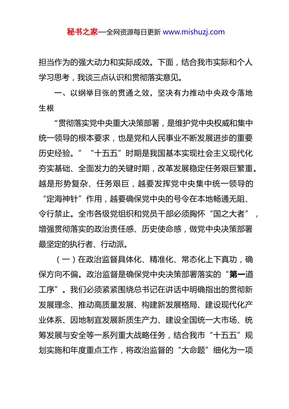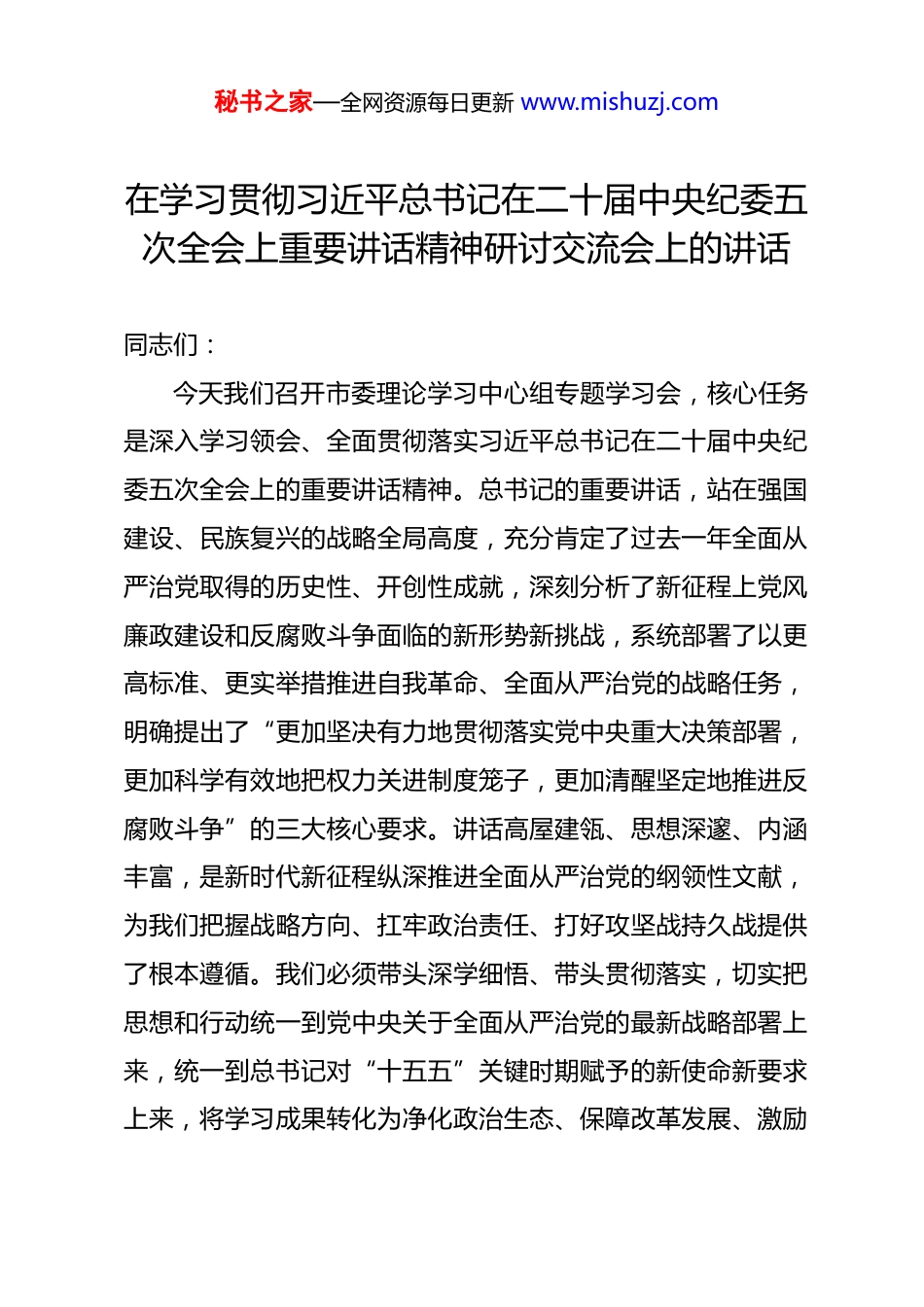 秘书之家—全网资源每日更新 www.mishuzj.com在学习贯彻习近平总书记在二十届中央纪委五次全会上重要讲话精神研讨交流会上的讲话 同志们:今天我们召开市委理论学习中心组专题学习会,核心任务是深入学习领会、全面贯彻落实习近平总书记在二十届中央纪委五次全会上的重要讲话精神。总书记的重要讲话,站在强国建设、民族复兴的战略全局高度,充分肯定了过去一年全面从严治党取得的历史性、开创性成就,深刻分析了新征程上党风廉政建设和反腐败斗争面临的新形势新挑战,系统部署了以更高标准、更实举措推进自我革命、全面从严治党的战略任务,明确提出了“更加坚决有力地贯彻落实党中央重大决策部署,更加科学有效地把权力关进制度笼子,更加清醒坚定地推进反腐败斗争”的三大核心要求。讲话高屋建瓴、思想深邃、内涵丰富,是新时代新征程纵深推进全面从严治党的纲领性文献,为我们把握战略方向、扛牢政治责任、打好攻坚战持久战提供了根本遵循。我们必须带头深学细悟、带头贯彻落实,切实把思想和行动统一到党中央关于全面从严治党的最新战略部署上来,统一到总书记对“十五五”关键时期赋予的新使命新要求上来,将学习成果转化为净化政治生态、保障改革发展、激励秘书之家—全网资源每日更新 www.mishuzj.com担当作为的强大动力和实际成效。下面,结合我市实际和个人学习思考,我谈三点认识和贯彻落实意见。一、以纲举目张的贯通之效,坚决有力推动中央政令落地生根“贯彻落实党中央重大决策部署,是维护党中央权威和集中统一领导的根本要求,也是党和人民事业不断发展进步的重要历史经验。”“十五五”时期是我国基本实现社会主义现代化夯实基础、全面发力的关键时期,改革发展稳定任务艰巨繁重。越是形势复杂、任务艰巨,越要发挥党中央集中统一领导的“定海神针”作用,越要确保党中央的号令在本地畅通无阻、令行禁止。全市各级党组织和党员干部必须胸怀“国之大者”,增强贯彻落实的政治责任感、历史使命感,做党中央决策部署最坚定的执行者、行动派。(一)在政治监督具体化、精准化、常态化上下真功,确保方向不偏。政治监督是确保党中央决策部署落实的“第一道工序”。我们必须紧紧围绕总书记在讲话中明确指出的贯彻新发展理念、推动高质量发展、构建新发展格局、建设现代化产业体系、因地制宜发展新质生产力、建设全国统一大市场、统筹发展与安全等一系列重大战略任务,结合我市“十五五”规划实施和年度重点工作,将政治监督的“大命题”细化为一项秘书之家—全网资源每日更新 www.mishuzj.com项具体的“任务书”和“检查单”。要坚决防止“上下一般粗”,杜绝机械照搬、盲目跟风,比如在发展新质生产力上,必须深入研究市情,找准自身优势与短板,走特色化、差异化发展之路,决不能为了追求“新潮”而将传统产业简单退出或不顾条件硬上项目。要探索建立“清单化+项目化+闭环化”的监督机制,用好巡视巡察、专项督查、审计监督等成果,对执行中的温差、偏差、落差问题及时校准,对搞变通、打折扣、做选择的行为坚决纠正,确保执行不偏向、不变通、不走样。(二)在树立践行正确政绩观上见真章,激励担当作为。贯彻落实的成效,最终要由人民群众来评判,用经得起历史检验的实绩来衡量。要教育引导广大干部深刻反思:工作重心是否始终聚焦于党的中心任务?谋划发展是否偏离了全心全意为人民服务的根本宗旨?推动工作是否脱离了本地区发展实际和群众真实需求?我们必须将树立和践行正确政绩观贯穿于干部选拔任用、考核评价、教育培训全过程。要结合地方换届工作,鲜明树立重实干、重实绩、重担当的用人导向,真正把那些政治坚定、对党忠诚、能力突出、作风扎实、清正廉洁,能够创造性落实党中央决策部署的干部选出来、用起来。要严格落实“三个区分开来”,精准运用“四种形态”,完善容错纠错机制,旗帜鲜明地为敢于担当、踏实做事、不谋私利的干部撑腰秘书之家—全网资源每日更新 www.mishuzj.com鼓劲,激发“闯”的精神、“创”的劲头、“干”的作风。(三)在服务保障国家战略全局上求真效,破除本位主义总书记强调要“牢固树立大局意识”。我市的发展必须自觉放在...