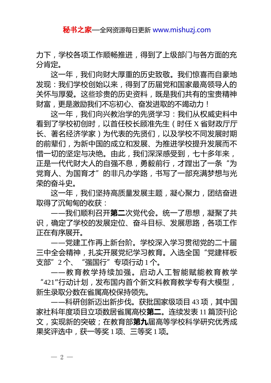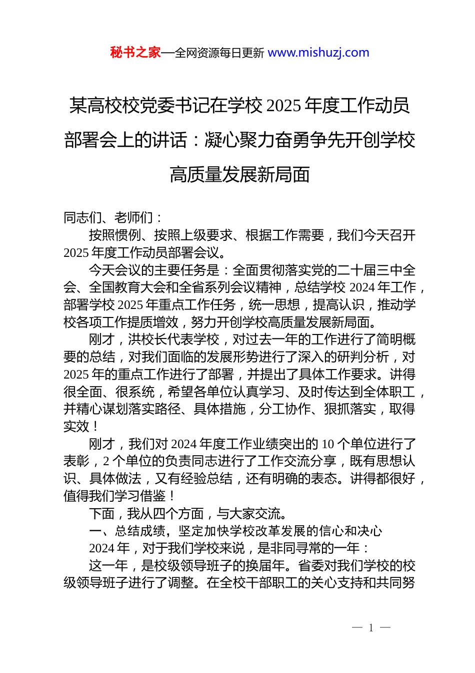 秘书之家—全网资源每日更新 www.mishuzj.com某高校校党委书记在学校 2025 年度工作动员部署会上的讲话:凝心聚力奋勇争先开创学校高质量发展新局面同志们、老师们:按照惯例、按照上级要求、根据工作需要,我们今天召开2025 年度工作动员部署会议。今天会议的主要任务是:全面贯彻落实党的二十届三中全会、全国教育大会和全省系列会议精神,总结学校 2024 年工作,部署学校 2025 年重点工作任务,统一思想,提高认识,推动学校各项工作提质增效,努力开创学校高质量发展新局面。刚才,洪校长代表学校,对过去一年的工作进行了简明概要的总结,对我们面临的发展形势进行了深入的研判分析,对2025 年的重点工作进行了部署,并提出了具体工作要求。讲得很全面、很系统,希望各单位认真学习、及时传达到全体职工,并精心谋划落实路径、具体措施,分工协作、狠抓落实,取得实效!刚才,我们对 2024 年度工作业绩突出的 10 个单位进行了表彰,2 个单位的负责同志进行了工作交流分享,既有思想认识、具体做法,又有经验总结,还有明确的表态。讲得都很好,值得我们学习借鉴!下面,我从四个方面,与大家交流。一、总结成绩,坚定加快学校改革发展的信心和决心2024 年,对于我们学校来说,是非同寻常的一年:这一年,是校级领导班子的换届年。省委对我们学校的校级领导班子进行了调整。在全校干部职工的关心支持和共同努— 1 —秘书之家—全网资源每日更新 www.mishuzj.com力下,学校各项工作顺畅推进,得到了上级部门与各方面的充分肯定。这一年,我们向财大厚重的历史致敬。我们惊喜而自豪地发现:我们学校创始以来,得到了历届党和国家最高领导人的关怀与厚爱。这些珍贵的历史资料,既是我们共有的宝贵精神财富,更是激励我们不忘初心、奋发进取的不竭动力!这一年,我们向兴教治学的先贤学习:我们从权威史料中看到了学校初创时,以首任校长顾准先生(时任 X 省财政厅厅长、著名经济学家)为代表的先贤们,以及学校不同发展时期的前辈们,为新中国的成立和发展、为推进学校提升发展而不惜一切的坚定与决绝。由此,我们深深感受到,七十多年来,正是一代代财大人的自强不息,勇毅前行,才蹚出了一条“为党育人、为国育才”的非凡办学路,书写了一部充满梦想与光荣的奋斗史。这一年,我们坚持高质量发展主题,凝心聚力,团结奋进取得了沉甸甸的收获:——我们顺利召开第二次党代会。统一了思想,凝聚了共识,确定了学校的发展定位、奋斗目标、发展思路,各项工作正在有序展开。——党建工作再上新台阶。学校深入学习贯彻党的二十届三中全会精神,扎实开展党纪学习教育。入选全国“党建样板支部”2 个、“强国行”专项行动 1 个。——教育教学持续加强。启动人工智能赋能教育教学“421”行动计划,发布国内首个新文科教育教学专有大模型,新生录取分数在省属高校保持领先。——科研创新迈出新步伐。获批国家级项目 43 项,其中国家社科年度项目立项数居省属高校第二。连续发表 11 篇顶刊论文,实现新的突破;在教育部第九届高等学校科学研究优秀成果奖评选中,获一等奖 1 项、三等奖 1 项。— 2 —秘书之家—全网资源每日更新 www.mishuzj.com——人事人才工作得到强化。完善评价机制及职称评审晋升体系,打造“海岱学者”工作品牌,引育国家级领军人才 4人,省部级领军人才 10 人。——学科建设跨出新高度。着力推进学科建设“出尖出峰”,新获批博士学位授权点 2 个。2024 软科中国最好学科排名,应用经济学进入前 8%。——学生思政工作扎实有效。召开第五届思想政治工作会议,全体辅导员老师辛勤努力,学生工作稳定有序,考研率、就业率稳步提高。毕业生在全国税务系统公务员招录中,连续5 年列全国高校第一。荣获中国国际大学生创新大赛、“挑战杯”“创青春”全国金奖 3 项。——国内外合作有新拓展。与法国高等对外贸易学院共同举办孔子学院正式揭牌,成为 X 省海外首所商务特色孔院。与法国、德国、韩国、我国香港、澳门的高校加强联动。与黑龙江省绥芬河市、上海财经大学、对外经济贸易大学,深圳市、X 省泰安市、临沂市、齐鲁...