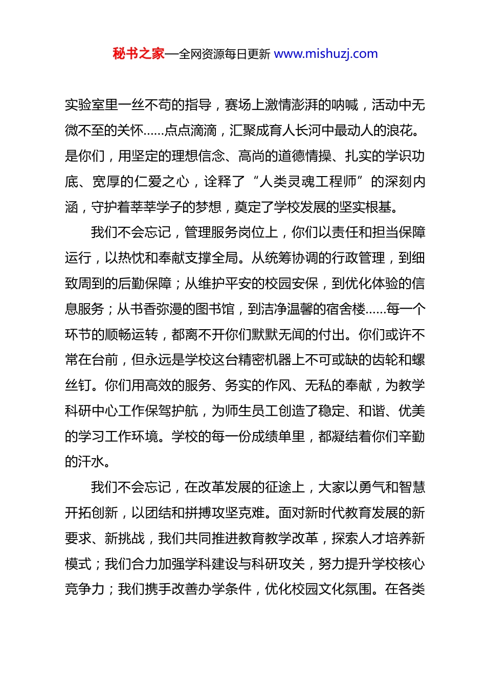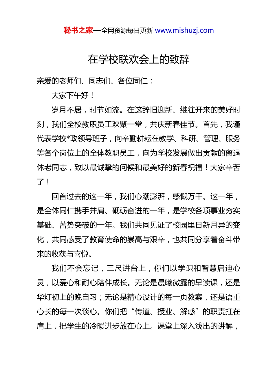 秘书之家—全网资源每日更新 www.mishuzj.com在学校联欢会上的致辞亲爱的老师们、同志们、各位同仁:大家下午好!岁月不居,时节如流。在这辞旧迎新、继往开来的美好时刻,我们全校教职员工欢聚一堂,共庆新春佳节。首先,我谨代表学校*政领导班子,向辛勤耕耘在教学、科研、管理、服务等各个岗位上的全体教职员工,向为学校发展做出贡献的离退休老同志,致以最诚挚的问候和最美好的新春祝福!大家辛苦了!回首过去的这一年,我们心潮澎湃,感慨万千。这一年,是全体同仁携手并肩、砥砺奋进的一年,是学校各项事业夯实基础、蓄势突破的一年。我们共同见证了校园里日新月异的变化,共同感受了教育使命的崇高与艰辛,也共同分享着奋斗带来的收获与喜悦。我们不会忘记,三尺讲台上,你们以学识和智慧启迪心灵,以爱心和耐心陪伴成长。无论是晨曦微露的早读课,还是华灯初上的晚自习;无论是精心设计的每一页教案,还是语重心长的每一次谈心。你们把“传道、授业、解惑”的职责扛在肩上,把学生的冷暖进步放在心上。课堂上深入浅出的讲解,秘书之家—全网资源每日更新 www.mishuzj.com实验室里一丝不苟的指导,赛场上激情澎湃的呐喊,活动中无微不至的关怀……点点滴滴,汇聚成育人长河中最动人的浪花。是你们,用坚定的理想信念、高尚的道德情操、扎实的学识功底、宽厚的仁爱之心,诠释了“人类灵魂工程师”的深刻内涵,守护着莘莘学子的梦想,奠定了学校发展的坚实根基。我们不会忘记,管理服务岗位上,你们以责任和担当保障运行,以热忱和奉献支撑全局。从统筹协调的行政管理,到细致周到的后勤保障;从维护平安的校园安保,到优化体验的信息服务;从书香弥漫的图书馆,到洁净温馨的宿舍楼……每一个环节的顺畅运转,都离不开你们默默无闻的付出。你们或许不常在台前,但永远是学校这台精密机器上不可或缺的齿轮和螺丝钉。你们用高效的服务、务实的作风、无私的奉献,为教学科研中心工作保驾护航,为师生员工创造了稳定、和谐、优美的学习工作环境。学校的每一份成绩单里,都凝结着你们辛勤的汗水。我们不会忘记,在改革发展的征途上,大家以勇气和智慧开拓创新,以团结和拼搏攻坚克难。面对新时代教育发展的新要求、新挑战,我们共同推进教育教学改革,探索人才培养新模式;我们合力加强学科建设与科研攻关,努力提升学校核心竞争力;我们携手改善办学条件,优化校园文化氛围。在各类秘书之家—全网资源每日更新 www.mishuzj.com评估检查中,大家全力以赴,展现了优良的校风;在重大活动赛事中,大家同心协力,赢得了广泛的赞誉;在日常工作的点滴改进中,大家建言献策,体现了主人翁的精神。正是这种“心往一处想、劲往一处使”的磅礴合力,推动着我们的学校在高质量发展的道路上稳步前行。老师们,同志们!过去一年的成绩,是大家一个字一个字写出来、一堂课一堂课上出来、一件事一件事干出来的。在此,我要再次向在座的每一位,并通过你们向你们的家人表示最衷心的感谢!感谢大家的理解支持、无私奉献和顽强拼搏!旧岁已展千重锦,新年再进百尺竿。展望即将到来的新年,我们既充满信心,也深知任重道远。教育是国之大计、*之大计,我们所从事的事业关乎国家未来和民族希望。当前,世界之变、时代之变、历史之变正以前所未有的方式展开,教育也面临着新的机遇与挑战。这就要求我们:要永葆立德树人的初心。始终牢记为*育人、为国育才的使命,将培育时代新人作为一切工作的出发点和落脚点,用**************思想铸魂育人,引导学生扣好人生第一粒扣子。要激发改革创新的锐气。紧跟教育发展前沿,深化教育教学改革,创新人才培养机制,优化内部治理体系,破除制约发展的障碍,让学校的办学活力充分涌流。秘书之家—全网资源每日更新 www.mishuzj.com要锤炼笃实深耕的韧劲。教育是“慢艺术”,需要静心守望;办学是系统工程,需要久久为功。我们要沉下心来,聚焦主业,狠抓落实,在内涵建设上下苦功夫、真功夫,不断提升办学品质和育人水平。要营造团结奋进的氛围。学校是我们共同的家园,发展是我们共同的责任。要继续发扬互帮互助、协同共进的优良传统,加强沟通,增进理解,...