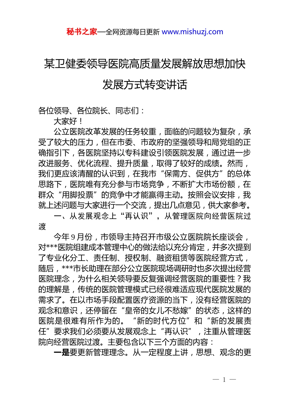 秘书之家—全网资源每日更新 www.mishuzj.com某卫健委领导医院高质量发展解放思想加快发展方式转变讲话各位领导、各位院长、同志们:大家好!公立医院改革发展的任务较重,面临的问题较为复杂,承受了较大的压力,但在市委、市政府的坚强领导和局党组的正确指引下,各医院坚持以专科建设引领医院发展,通过进一步改进服务、优化流程、提升质量,取得了较好的成绩。然而,我们更应该清醒的认识到,在我市“保需方、促供方”的总体思路下,医院唯有充分参与市场竞争,不断扩大市场份额,在群众“用脚投票”的竞争中才能赢得主动。按照会议安排,我就上述问题与大家进行一个交流,提出几点意见,供大家参考。一、从发展观念上“再认识”,从管理医院向经营医院过渡今年 9 月份,市领导主持召开市级公立医院院长座谈会,对***医院组建成本管理中心的做法给以充分肯定,并多次提到了专业化分工、责任制、授权制、融资租赁等医院经营方式,随后,***市长助理在部分公立医院现场调研时也多次提出经营医院理念,为什么相关领导要反复强调经营医院的重要性?我的理解是,传统的医院管理模式已经很难适应现代医院发展的需求了。在以市场手段配置医疗资源的当下,没有经营医院的观念和意识,还停留在“皇帝的女儿不愁嫁”的状态,这样的医院是很难有所作为的。“新的时代方位”和“新的发展责任”要求我们必须要从发展观念上“再认识”,注重从管理医院向经营医院过渡。主要包含以下三个方面的内容:一是要更新管理理念。从一定程度上讲,思想、观念的更— 1 —秘书之家—全网资源每日更新 www.mishuzj.com新和转变过程是很艰难的。这种意识形态的东西一旦形成要想改变很多时候都会“伤经动骨”。但一旦更新转变过后,往往会迎来平坦通途。“逆水行舟,百舸争流,不进则退,缓行亦退”,不转变就会被动,不更新就要落后,各市管公立医院要按照“思想再解放、观念再突破、发展再提速”的要求,大力实施加快发展、创新发展、融合发展、特色发展和精品发展“五大战略”,在提升医院凝聚力、供给力、服务力、竞争力、创新力、推动力六个方面狠下工夫,积极转变发展方式,树立以患者需求为导向的市场观,以市场化经营为手段,实现公立医院公益性。二是要更新能力体系。经营医院是一项系统工程,对很多医院而言,经营医院理念的更新将直接引发能力体系的重建,主要包括四种能力重建——决策能力、沟通能力、团队能力、执行能力。首先是决策能力重建。医院经营发展必然面对如总体目标确定、医疗市场拓展、医院资本运作等诸多战略决策,除了能决策以外,还要会决策、敢决策、决好策,这就对医院决策者的决策能力提出了更高的要求。其次是沟通能力重建。良好的沟通能力在任何领域都不可或缺,在医疗服务领域也不例外甚至更为重要。除了一般意义上的医患沟通、院科沟通、科室沟通外,媒体沟通、部门沟通、合作方沟通等在医院经营中将起到更为重要的作用。再次是团队能力重建。一方面,对医院团队的理解不应停留在医疗技术领域。临床科室是团队,后勤保障也是团队;另一方面,判断团队优劣的标准也应该有更综合化的经营指标。手术做得好、业务量高、创收能力强固然重要,但如果没有经营理念和成本意识,不具备团队经营能力,这样的团队也是不合格的。最后是执行能力重建。从某种意义上将,这是最重要的一种能力。执行力的强弱直接影响最终结果。过去,执行力不足在很多医院都不同程度的存在,原因是多方面的。但大多数时候是执行者心怀疑虑或抱有无所谓— 2 —秘书之家—全网资源每日更新 www.mishuzj.com的态度。对前者我们可以通过解疑释惑加以解决,对后者就要有严格的考核制度加以保证。三是更新知识结构。新医改实施以来,中央、部委、省、市陆续出台了很多相关政策和配套文件,指明了公立医院改革发展的方向,提供了良好的发展机遇。各医院必须要认真研究,深入分析,顺势而为,把医改特别是公立医院改革的精神吃准、吃透。积极学习现代医院财务管理、人力资源管理、市场营销、医事法律、文化建设等相关知识,积极更新知识结构,建立较为丰富的知识储备,适应公立医院改革发展的要求。二、...