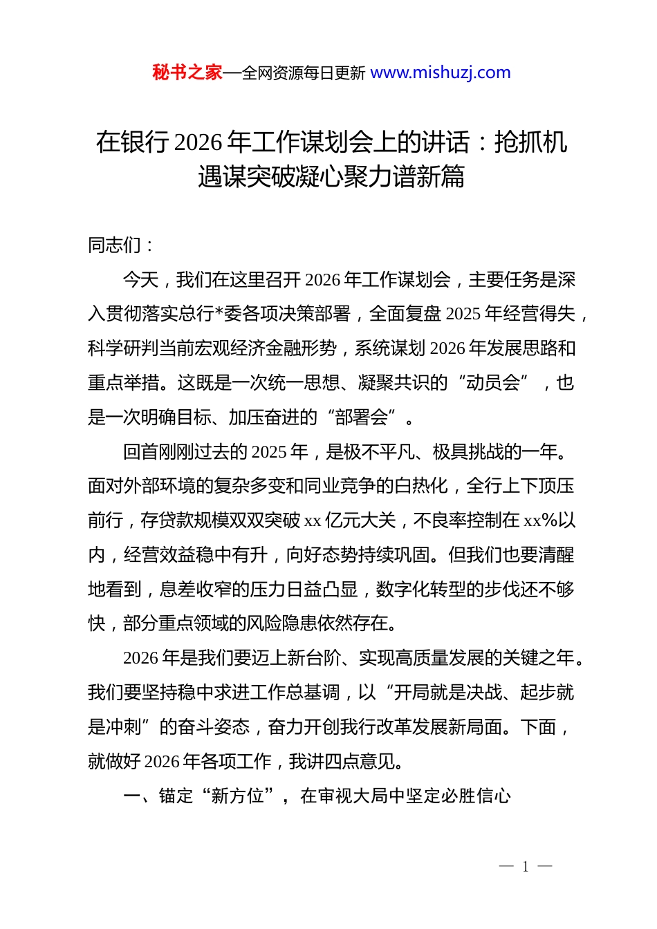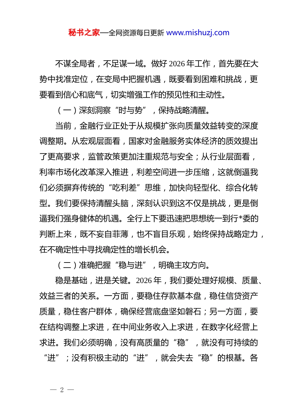 秘书之家—全网资源每日更新 www.mishuzj.com在银行 2026 年工作谋划会上的讲话:抢抓机遇谋突破凝心聚力谱新篇同志们:今天,我们在这里召开 2026 年工作谋划会,主要任务是深入贯彻落实总行*委各项决策部署,全面复盘 2025 年经营得失,科学研判当前宏观经济金融形势,系统谋划 2026 年发展思路和重点举措。这既是一次统一思想、凝聚共识的“动员会”,也是一次明确目标、加压奋进的“部署会”。回首刚刚过去的 2025 年,是极不平凡、极具挑战的一年。面对外部环境的复杂多变和同业竞争的白热化,全行上下顶压前行,存贷款规模双双突破 xx 亿元大关,不良率控制在 xx%以内,经营效益稳中有升,向好态势持续巩固。但我们也要清醒地看到,息差收窄的压力日益凸显,数字化转型的步伐还不够快,部分重点领域的风险隐患依然存在。2026 年是我们要迈上新台阶、实现高质量发展的关键之年。我们要坚持稳中求进工作总基调,以“开局就是决战、起步就是冲刺”的奋斗姿态,奋力开创我行改革发展新局面。下面,就做好 2026 年各项工作,我讲四点意见。一、锚定“新方位”,在审视大局中坚定必胜信心— 1 —秘书之家—全网资源每日更新 www.mishuzj.com不谋全局者,不足谋一域。做好 2026 年工作,首先要在大势中找准定位,在变局中把握机遇,既要看到困难和挑战,更要看到信心和底气,切实增强工作的预见性和主动性。(一)深刻洞察“时与势”,保持战略清醒。当前,金融行业正处于从规模扩张向质量效益转变的深度调整期。从宏观层面看,国家对金融服务实体经济的质效提出了更高要求,监管政策更加注重规范与安全;从行业层面看,利率市场化改革深入推进,利差空间进一步压缩,这就倒逼我们必须摒弃传统的“吃利差”思维,加快向轻型化、综合化转型。我们要保持清醒头脑,深刻认识到这不仅是挑战,更是倒逼我们强身健体的机遇。全行上下要迅速把思想统一到行*委的判断上来,既不妄自菲薄,也不盲目乐观,始终保持战略定力,在不确定性中寻找确定性的增长机会。(二)准确把握“稳与进”,明确主攻方向。稳是基础,进是关键。2026 年,我们要处理好规模、质量、效益三者的关系。一方面,要稳住存款基本盘,稳住信贷资产质量,稳住客户群体,确保经营底盘坚如磐石;另一方面,要在结构调整上求进,在中间业务收入上求进,在数字化经营上求进。我们必须明确,没有高质量的“稳”,就没有可持续的“进”;没有积极主动的“进”,就会失去“稳”的根基。各— 2 —秘书之家—全网资源每日更新 www.mishuzj.com部门、各支行要结合自身实际,制定具体可行的“作战图”,确保每一项指标都有人扛、每一项任务都能落地。(三)辩证看待“危与机”,厚植发展优势。风险与机遇往往并存。虽然经济下行压力给信贷资产质量带来一定考验,但国家在科技创新、绿色发展、乡村振兴等领域的政策红利也在持续释放。我们要善于从危机中捕捉商机,主动对接国家重大战略和地方发展规划,深耕细作本地市场。我们拥有长期深耕本地积累的人缘地缘优势,拥有决策链条短、服务效率高的机制优势,只要我们把这些优势转化为胜势,就一定能在激烈的市场竞争中立于不败之地。二、激活“新动能”,在转型攻坚中重塑竞争优势发展是解决一切问题的总钥匙,而转型则是打开这把锁的关键密码。2026 年,我们要坚持把业务发展作为第一要务,聚焦重点领域和薄弱环节,精准发力、持续用力,全面提升核心竞争力。(一)做强公司业务,打造“压舱石”。公司业务是全行发展的根基。我们要从单纯的资金提供商向综合金融服务商转变。首先,要聚焦“科技金融”和“绿色金融”两大文章,加大对专精特新企业、绿色制造企业的支持力度,创新“投贷联动”“知识产权质押”等产品模式,打通— 3 —秘书之家—全网资源每日更新 www.mishuzj.com服务实体经济的痛点堵点。其次,要深耕机构业务,紧盯财政、社保、医院、学校等源头性资金,通过提供现金管理、代发工资、智慧校园等一揽子服务,增强客户粘性,沉淀低成本资金。要建立分层分类的客户维护体系,对战略客户实行“一行一策”精准服务,确保存量不流失、增量有突...