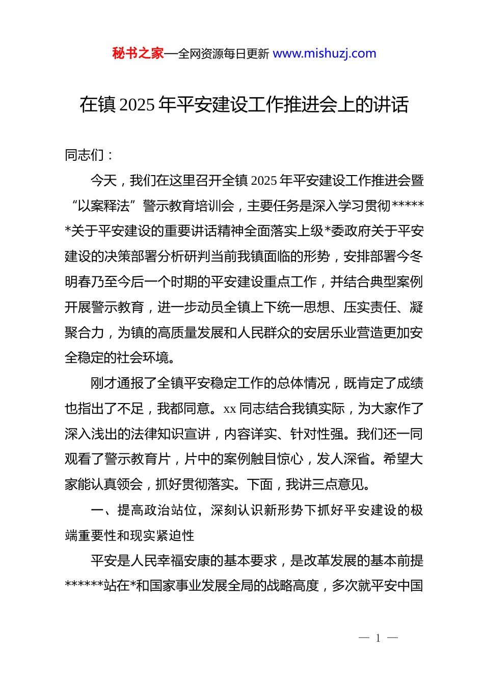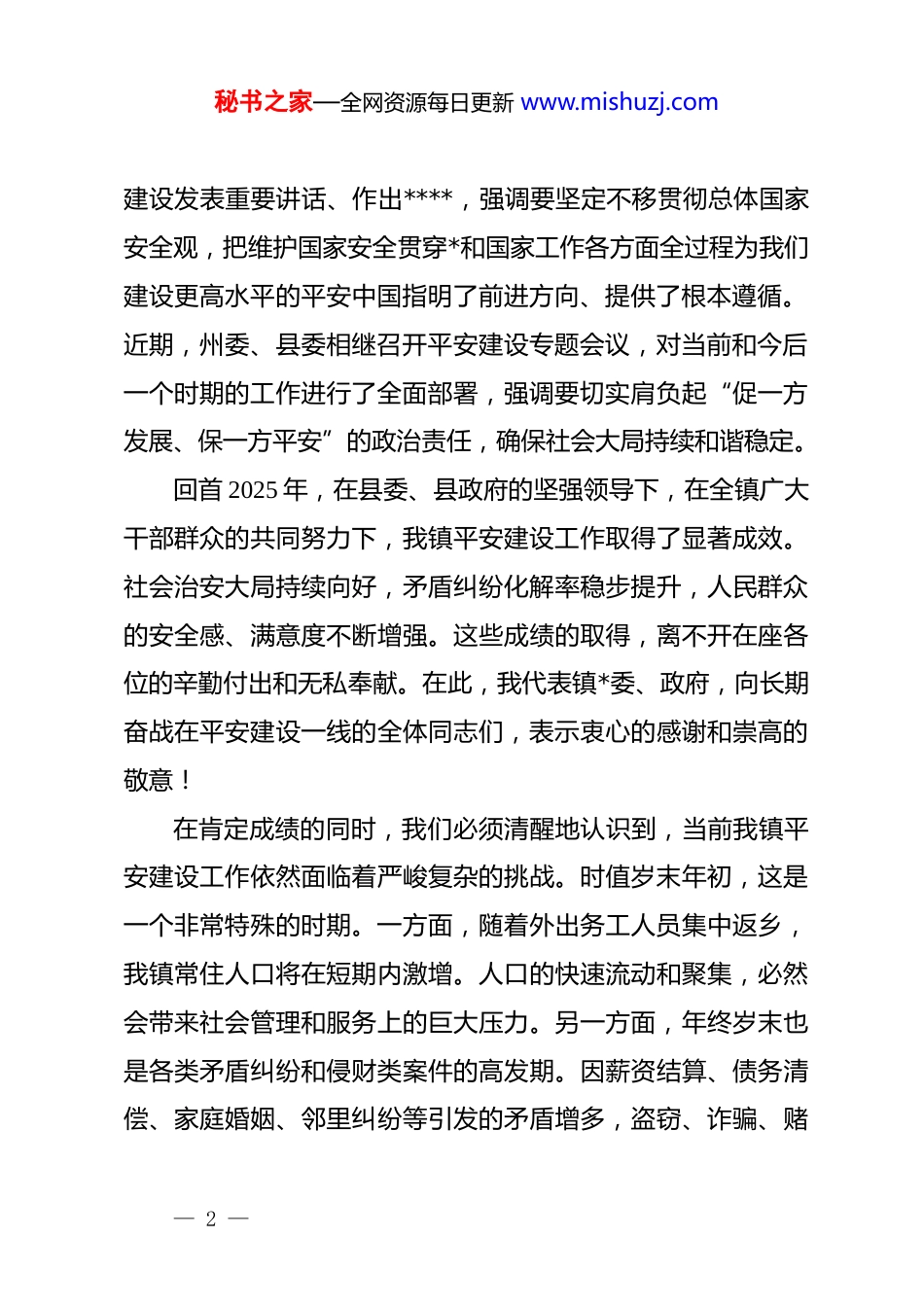 秘书之家—全网资源每日更新 www.mishuzj.com在镇 2025 年平安建设工作推进会上的讲话同志们:今天,我们在这里召开全镇 2025 年平安建设工作推进会暨“以案释法”警示教育培训会,主要任务是深入学习贯彻******关于平安建设的重要讲话精神全面落实上级*委政府关于平安建设的决策部署分析研判当前我镇面临的形势,安排部署今冬明春乃至今后一个时期的平安建设重点工作,并结合典型案例开展警示教育,进一步动员全镇上下统一思想、压实责任、凝聚合力,为镇的高质量发展和人民群众的安居乐业营造更加安全稳定的社会环境。刚才通报了全镇平安稳定工作的总体情况,既肯定了成绩也指出了不足,我都同意。xx 同志结合我镇实际,为大家作了深入浅出的法律知识宣讲,内容详实、针对性强。我们还一同观看了警示教育片,片中的案例触目惊心,发人深省。希望大家能认真领会,抓好贯彻落实。下面,我讲三点意见。一、提高政治站位,深刻认识新形势下抓好平安建设的极端重要性和现实紧迫性平安是人民幸福安康的基本要求,是改革发展的基本前提******站在*和国家事业发展全局的战略高度,多次就平安中国— 1 —秘书之家—全网资源每日更新 www.mishuzj.com建设发表重要讲话、作出****,强调要坚定不移贯彻总体国家安全观,把维护国家安全贯穿*和国家工作各方面全过程为我们建设更高水平的平安中国指明了前进方向、提供了根本遵循。近期,州委、县委相继召开平安建设专题会议,对当前和今后一个时期的工作进行了全面部署,强调要切实肩负起“促一方发展、保一方平安”的政治责任,确保社会大局持续和谐稳定。回首 2025 年,在县委、县政府的坚强领导下,在全镇广大干部群众的共同努力下,我镇平安建设工作取得了显著成效。社会治安大局持续向好,矛盾纠纷化解率稳步提升,人民群众的安全感、满意度不断增强。这些成绩的取得,离不开在座各位的辛勤付出和无私奉献。在此,我代表镇*委、政府,向长期奋战在平安建设一线的全体同志们,表示衷心的感谢和崇高的敬意!在肯定成绩的同时,我们必须清醒地认识到,当前我镇平安建设工作依然面临着严峻复杂的挑战。时值岁末年初,这是一个非常特殊的时期。一方面,随着外出务工人员集中返乡,我镇常住人口将在短期内激增。人口的快速流动和聚集,必然会带来社会管理和服务上的巨大压力。另一方面,年终岁末也是各类矛盾纠纷和侵财类案件的高发期。因薪资结算、债务清偿、家庭婚姻、邻里纠纷等引发的矛盾增多,盗窃、诈骗、赌— 2 —秘书之家—全网资源每日更新 www.mishuzj.com博等违法犯罪活动也可能出现反弹。这些潜在的风险隐患,如同潜藏在水下的暗礁,稍有不慎就可能引发事端,破坏我们来之不易的安定局面。因此,全镇上下必须牢固树立“万无一失”的底线思维和“一失万无”的风险意识,坚决克服麻痹思想、厌战情绪和侥幸心理。我们必须深刻认识到,抓平安建设就是抓发展、就是保民生。一个地方如果连最基本的平安都保证不了,那么经济发展、社会进步、民生改善都将无从谈起。全镇各办(中心)、各村(社区)、各单位要迅速把思想和行动统一到中央和省、州、县的决策部署上来,以最高的标准、最严的要求、最实的举措,全力以赴投入到平安建设工作中来,坚决筑牢 xx 镇安全稳定的“铜墙铁壁”。二、聚焦关键环节,以“七项专项行动”和“八个聚焦”为抓手,全面提升平安建设工作质效部署千万条,落实第一条。为有效应对当前复杂形势,确保全镇社会大局稳定,镇*委、政府研究决定,从现在开始,集中力量在全镇范围内深入开展“七项专项行动”,并要求全体干部在工作中紧紧围绕“八个聚焦”,精准发力,靶向施策。首先,我重点讲一下“七项专项行动”的具体部署:第一,深入开展矛盾纠纷大排查大化解专项行动。这是平— 3 —秘书之家—全网资源每日更新 www.mishuzj.com安建设的源头性、基础性工作。全镇 xx 个行政村和 1 个社区、260 余个村民小组的全体干部和 xx 名网格员要立即行动起来,深入田间地头、农户家中,对婚恋家庭、邻里关系、土地林权、劳资债务等各类矛盾纠 vực 进行“拉网式”“地毯式”排查。要建立台账,...