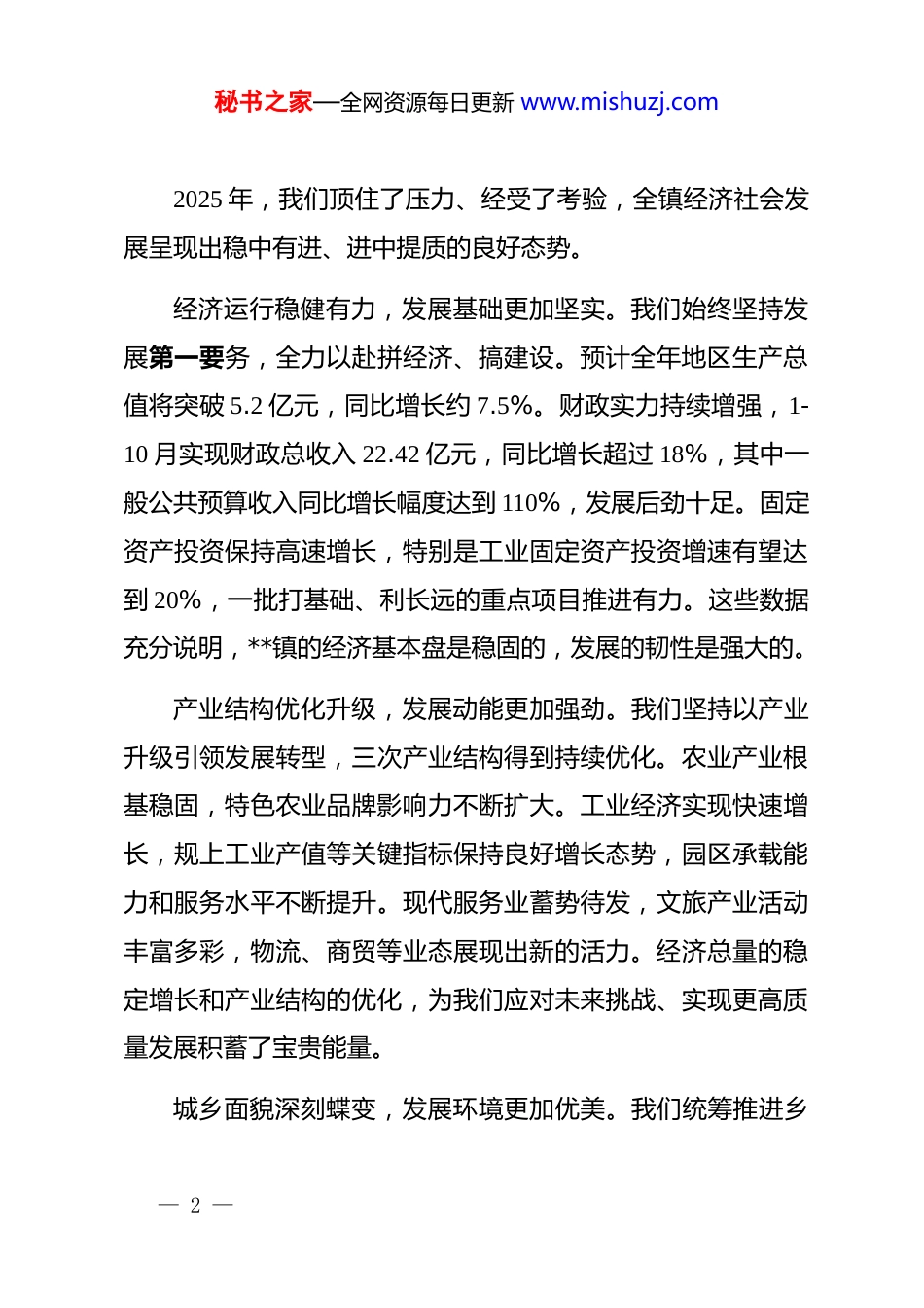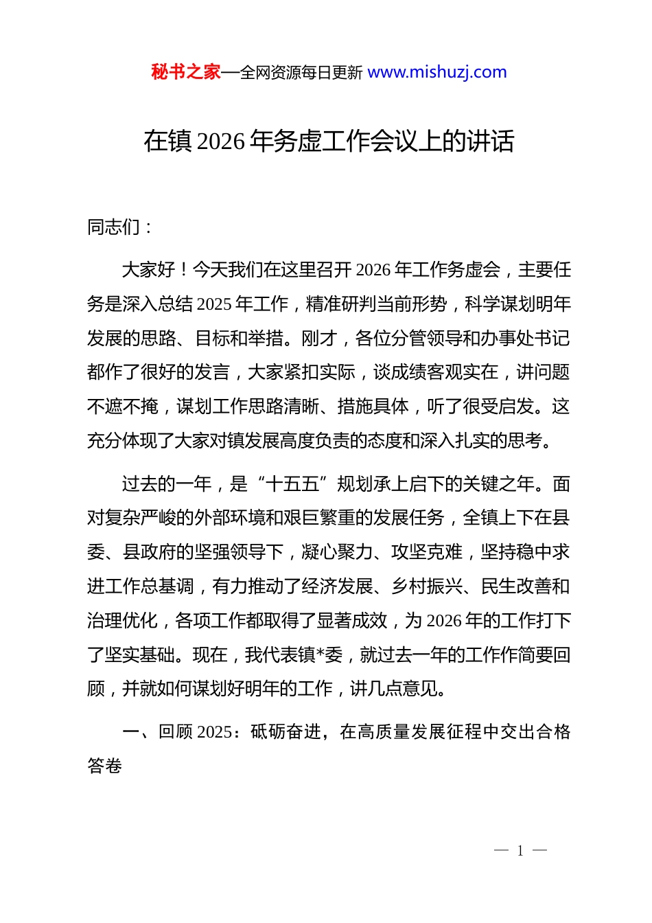 秘书之家—全网资源每日更新 www.mishuzj.com在镇 2026 年务虚工作会议上的讲话同志们:大家好!今天我们在这里召开 2026 年工作务虚会,主要任务是深入总结 2025 年工作,精准研判当前形势,科学谋划明年发展的思路、目标和举措。刚才,各位分管领导和办事处书记都作了很好的发言,大家紧扣实际,谈成绩客观实在,讲问题不遮不掩,谋划工作思路清晰、措施具体,听了很受启发。这充分体现了大家对镇发展高度负责的态度和深入扎实的思考。过去的一年,是“十五五”规划承上启下的关键之年。面对复杂严峻的外部环境和艰巨繁重的发展任务,全镇上下在县委、县政府的坚强领导下,凝心聚力、攻坚克难,坚持稳中求进工作总基调,有力推动了经济发展、乡村振兴、民生改善和治理优化,各项工作都取得了显著成效,为 2026 年的工作打下了坚实基础。现在,我代表镇*委,就过去一年的工作作简要回顾,并就如何谋划好明年的工作,讲几点意见。一、回顾 2025:砥砺奋进,在高质量发展征程中交出合格答卷— 1 —秘书之家—全网资源每日更新 www.mishuzj.com2025 年,我们顶住了压力、经受了考验,全镇经济社会发展呈现出稳中有进、进中提质的良好态势。经济运行稳健有力,发展基础更加坚实。我们始终坚持发展第一要务,全力以赴拼经济、搞建设。预计全年地区生产总值将突破 5.2 亿元,同比增长约 7.5%。财政实力持续增强,1-10 月实现财政总收入 22.42 亿元,同比增长超过 18%,其中一般公共预算收入同比增长幅度达到 110%,发展后劲十足。固定资产投资保持高速增长,特别是工业固定资产投资增速有望达到 20%,一批打基础、利长远的重点项目推进有力。这些数据充分说明,**镇的经济基本盘是稳固的,发展的韧性是强大的。产业结构优化升级,发展动能更加强劲。我们坚持以产业升级引领发展转型,三次产业结构得到持续优化。农业产业根基稳固,特色农业品牌影响力不断扩大。工业经济实现快速增长,规上工业产值等关键指标保持良好增长态势,园区承载能力和服务水平不断提升。现代服务业蓄势待发,文旅产业活动丰富多彩,物流、商贸等业态展现出新的活力。经济总量的稳定增长和产业结构的优化,为我们应对未来挑战、实现更高质量发展积蓄了宝贵能量。城乡面貌深刻蝶变,发展环境更加优美。我们统筹推进乡— 2 —秘书之家—全网资源每日更新 www.mishuzj.com村振兴和城镇品质提升,人居环境持续改善。乡村振兴战略深入实施,农村基础设施不断完善,农民人均可支配收入预计达到 2.68 万元,同比增长 7.8%,群众的获得感、幸福感显著增强。生态文明建设成效显著,河长制、森林防火等工作扎实推进,天更蓝、水更清、地更绿的生态画卷正在**大地徐徐展开。民生福祉持续增进,发展成果更加普惠。我们始终坚持以人民为中心的发展思想,用心用情用力解决群众急难愁盼问题。教育、医疗、养老等公共服务体系更加健全,社会保障网织得更密、扎得更牢。社会治理效能不断提升,平安**建设纵深推进,社会大局保持和谐稳定,为高质量发展营造了安全稳定的社会环境。在肯定成绩的同时,我们也要清醒地看到,发展道路上还面临不少困难和挑战。比如,经济总量还不够大,产业结构还需进一步优化;部分重点项目的推进速度有待加快;民生领域还有不少短板;少数干部的思想观念和能力作风与新时代新要求还不完全适应。对于这些问题,我们必须高度重视,在明年的工作中采取有力措施,切实加以解决。二、展望 2026:锚定目标,在现代化建设新征程中展现更大作为— 3 —秘书之家—全网资源每日更新 www.mishuzj.com2026 年,是实施“十五五”规划的开局之年,做好这一年的工作至关重要。我们要全面贯彻县委、县政府的决策部署,立足新发展阶段,贯彻新发展理念,构建新发展格局,以更加创新的思路、更加务实的举措,奋力开创**镇高质量发展新局面。下面,我重点强调五个方面的工作。(一)突出 dj 统领核心,凝聚团结奋进的强大合力。办好**的事情,关键在*。我们要始终把*的政治建设摆在首位,坚持不懈用***********思想凝心铸魂,深刻领悟“两个确立”的决定性意义,增强“四个意识”、...