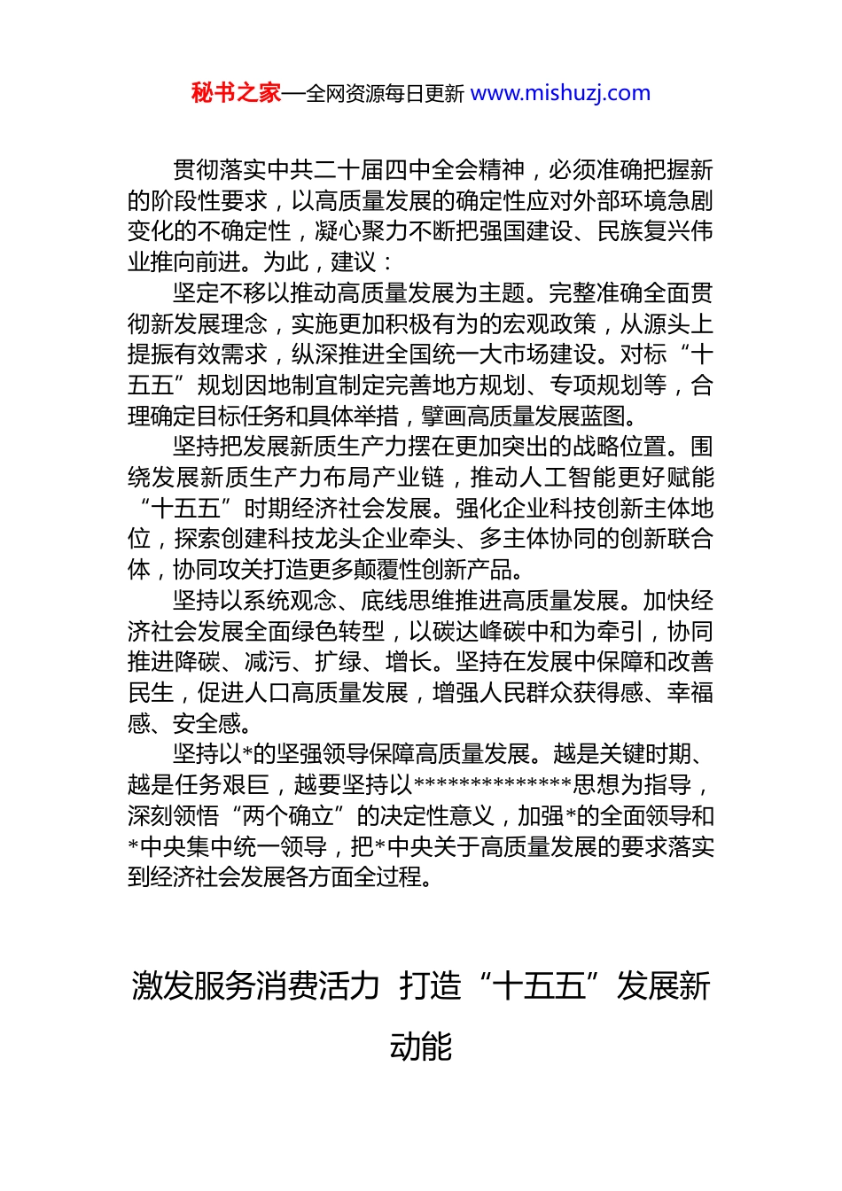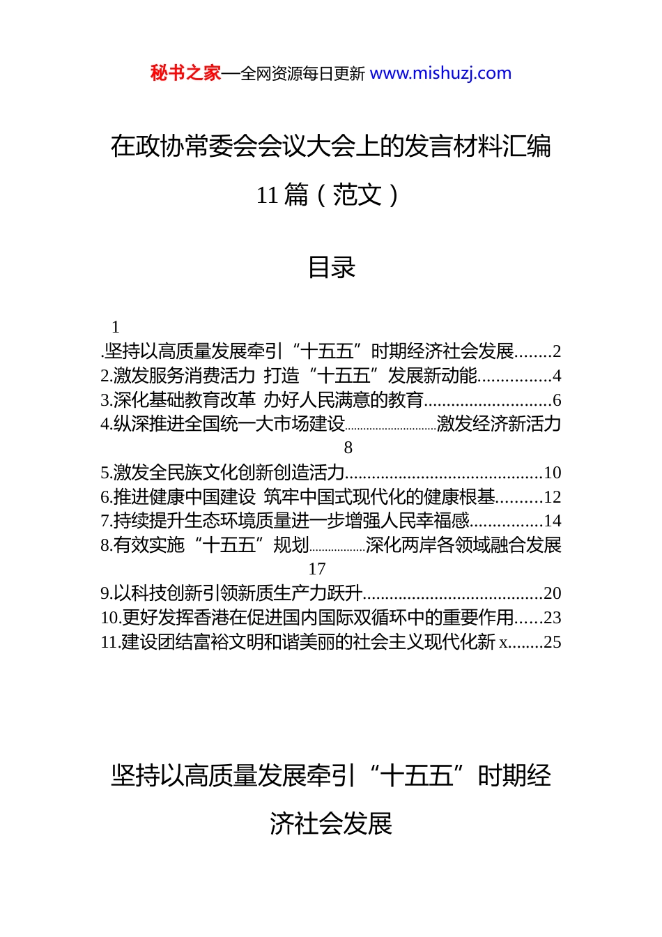 秘书之家—全网资源每日更新 www.mishuzj.com在政协常委会会议大会上的发言材料汇编11 篇(范文)目录1.坚持以高质量发展牵引“十五五”时期经济社会发展........22.激发服务消费活力 打造“十五五”发展新动能................43.深化基础教育改革 办好人民满意的教育............................64.纵深推进全国统一大市场建设..............................激发经济新活力85.激发全民族文化创新创造活力............................................106.推进健康中国建设 筑牢中国式现代化的健康根基..........127.持续提升生态环境质量进一步增强人民幸福感................148.有效实施“十五五”规划..................深化两岸各领域融合发展179.以科技创新引领新质生产力跃升........................................2010.更好发挥香港在促进国内国际双循环中的重要作用......2311.建设团结富裕文明和谐美丽的社会主义现代化新 x........25坚持以高质量发展牵引“十五五”时期经济社会发展秘书之家—全网资源每日更新 www.mishuzj.com贯彻落实中共二十届四中全会精神,必须准确把握新的阶段性要求,以高质量发展的确定性应对外部环境急剧变化的不确定性,凝心聚力不断把强国建设、民族复兴伟业推向前进。为此,建议:坚定不移以推动高质量发展为主题。完整准确全面贯彻新发展理念,实施更加积极有为的宏观政策,从源头上提振有效需求,纵深推进全国统一大市场建设。对标“十五五”规划因地制宜制定完善地方规划、专项规划等,合理确定目标任务和具体举措,擘画高质量发展蓝图。坚持把发展新质生产力摆在更加突出的战略位置。围绕发展新质生产力布局产业链,推动人工智能更好赋能“十五五”时期经济社会发展。强化企业科技创新主体地位,探索创建科技龙头企业牵头、多主体协同的创新联合体,协同攻关打造更多颠覆性创新产品。坚持以系统观念、底线思维推进高质量发展。加快经济社会发展全面绿色转型,以碳达峰碳中和为牵引,协同推进降碳、减污、扩绿、增长。坚持在发展中保障和改善民生,促进人口高质量发展,增强人民群众获得感、幸福感、安全感。坚持以*的坚强领导保障高质量发展。越是关键时期、越是任务艰巨,越要坚持以**************思想为指导,深刻领悟“两个确立”的决定性意义,加强*的全面领导和*中央集中统一领导,把*中央关于高质量发展的要求落实到经济社会发展各方面全过程。激发服务消费活力 打造“十五五”发展新动能秘书之家—全网资源每日更新 www.mishuzj.com中国国民*革命委员会坚决拥护中共中央决策部署,将深入学习贯彻中共二十届四中全会精神,为基本实现社会主义现代化取得决定性进展贡献智慧和力量。关于“十五五”时期促进消费和投资、供给和需求良性互动,增强国内大循环内生动力和可靠性等重要部署,我们建议:强化服务消费法治保障。完善以消费者权益保护法及其实施条例为核心的法律体系。完善数字消费、绿色消费健康消费、人工智能等新兴消费业态的法律法规,同步修订电子商务法、广告法等,构建统一法律框架。完善服务消费配套政策和标准体系。优化消费补贴发放机制,适时将文旅、体育、家政、培训等服务消费纳入支持范围。加快服务消费标准化建设,建立标准实施效果动态评估与快速修订机制,确保标准持续适配发展需求。创新服务消费场景和平台载体。紧扣数字化、绿色化、品质化发展潮流,进一步健全城乡服务消费网络及功能,着力推动线上线下深度融合与业态跨界融合,加快构建智慧商圈、智慧街区、智慧门店等消费新场景。丰富优质多元服务消费供给。顺应个性化消费新趋势,引导文化娱乐、旅游休闲、体育运动、餐饮购物等服务向创意性、沉浸式、定制化发展。深化基础教育改革 办好人民满意的教育中国民主同盟将把学习贯彻中共二十届四中全会精神作为当前和今后一个时期的重大政治任务,为“十五五”良好开局凝心聚力、作出贡献。加快基础教育改革,给社会减压、给家庭减负、给孩秘书之家—全网资源每日更新 www.mishuzj.com子松绑、为国家培养德智体美劳全面发展优秀人才,已成为“十五五”时期办好人民满意教育的重要内容...