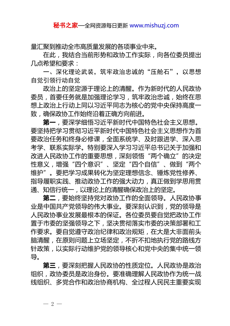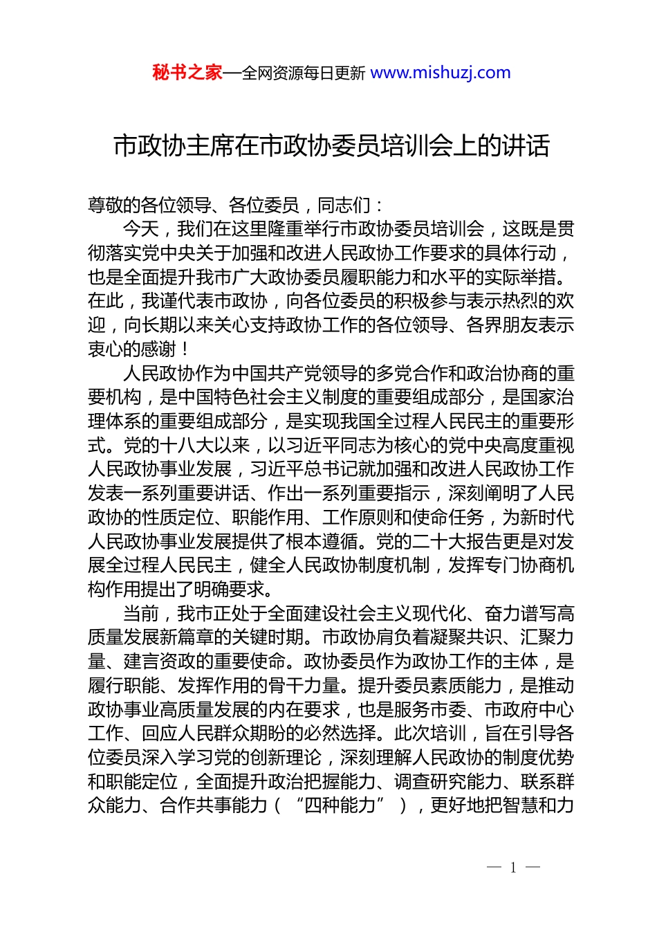 秘书之家—全网资源每日更新 www.mishuzj.com市政协主席在市政协委员培训会上的讲话尊敬的各位领导、各位委员,同志们:今天,我们在这里隆重举行市政协委员培训会,这既是贯彻落实党中央关于加强和改进人民政协工作要求的具体行动,也是全面提升我市广大政协委员履职能力和水平的实际举措。在此,我谨代表市政协,向各位委员的积极参与表示热烈的欢迎,向长期以来关心支持政协工作的各位领导、各界朋友表示衷心的感谢!人民政协作为中国共产党领导的多党合作和政治协商的重要机构,是中国特色社会主义制度的重要组成部分,是国家治理体系的重要组成部分,是实现我国全过程人民民主的重要形式。党的十八大以来,以习近平同志为核心的党中央高度重视人民政协事业发展,习近平总书记就加强和改进人民政协工作发表一系列重要讲话、作出一系列重要指示,深刻阐明了人民政协的性质定位、职能作用、工作原则和使命任务,为新时代人民政协事业发展提供了根本遵循。党的二十大报告更是对发展全过程人民民主,健全人民政协制度机制,发挥专门协商机构作用提出了明确要求。当前,我市正处于全面建设社会主义现代化、奋力谱写高质量发展新篇章的关键时期。市政协肩负着凝聚共识、汇聚力量、建言资政的重要使命。政协委员作为政协工作的主体,是履行职能、发挥作用的骨干力量。提升委员素质能力,是推动政协事业高质量发展的内在要求,也是服务市委、市政府中心工作、回应人民群众期盼的必然选择。此次培训,旨在引导各位委员深入学习党的创新理论,深刻理解人民政协的制度优势和职能定位,全面提升政治把握能力、调查研究能力、联系群众能力、合作共事能力(“四种能力”),更好地把智慧和力— 1 —秘书之家—全网资源每日更新 www.mishuzj.com量汇聚到推动全市高质量发展的各项事业中来。在此,我结合当前形势和政协工作实际,向各位委员提出几点希望和要求:一、深化理论武装,筑牢政治忠诚的“压舱石”,以思想自觉引领行动自觉政治上的坚定源于理论上的清醒。作为新时代的人民政协委员,首要任务就是加强理论学习,筑牢政治忠诚,始终在思想上政治上行动上同以习近平同志为核心的党中央保持高度一致,确保政协工作始终沿着正确方向前进。第一,要深学细悟习近平新时代中国特色社会主义思想。要坚持把学习贯彻习近平新时代中国特色社会主义思想作为首要政治任务和终身必修课,全面系统学、及时跟进学、深入思考学、联系实际学。特别要深入学习习近平总书记关于加强和改进人民政协工作的重要思想,深刻领悟“两个确立”的决定性意义,增强“四个意识”、坚定“四个自信”、做到“两个维护”。要把学习成果转化为坚定理想信念、锤炼党性修养、指导履职实践、推动政协工作的强大动力,真正做到学思用贯通、知信行统一,以理论上的清醒确保政治上的坚定。第二,要始终坚持党对政协工作的全面领导。人民政协事业是中国共产党领导的伟大事业。要深刻认识到,党的领导是人民政协事业发展最根本的保证。各位委员要自觉把政协工作置于市委的坚强领导之下,坚决贯彻落实市委的决策部署和工作要求。要自觉遵守政治纪律和政治规矩,在大是大非面前头脑清醒,在原则问题上立场坚定,不折不扣地执行党的路线方针政策,以实际行动维护党的领导核心和党中央的集中统一领导。第三,要深刻把握人民政协的性质定位。人民政协是政治组织,政协委员是政治身份。要准确理解人民政协作为统一战线组织、多党合作和政治协商机构、全过程人民民主重要实现— 2 —秘书之家—全网资源每日更新 www.mishuzj.com形式的深刻内涵。要牢记自己的政治责任,旗帜鲜明讲政治,善于从政治的高度观察问题、分析问题、解决问题,努力提高政治判断力、政治领悟力、政治执行力,确保在任何时候、任何情况下都始终与党同心同德、同向同行。二、聚焦主责主业,提升履职尽责的“宽肩膀”,以实干实效展现担当作为政协委员是荣誉,更是责任。高质量的履职能力是委员发挥作用、贡献力量的基础。各位委员要以本次培训为契机,全面提升履职尽责的各项本领,以扎实的作风和过硬的能力展现新时代政协委员的担当作为。第一,要提高政治...