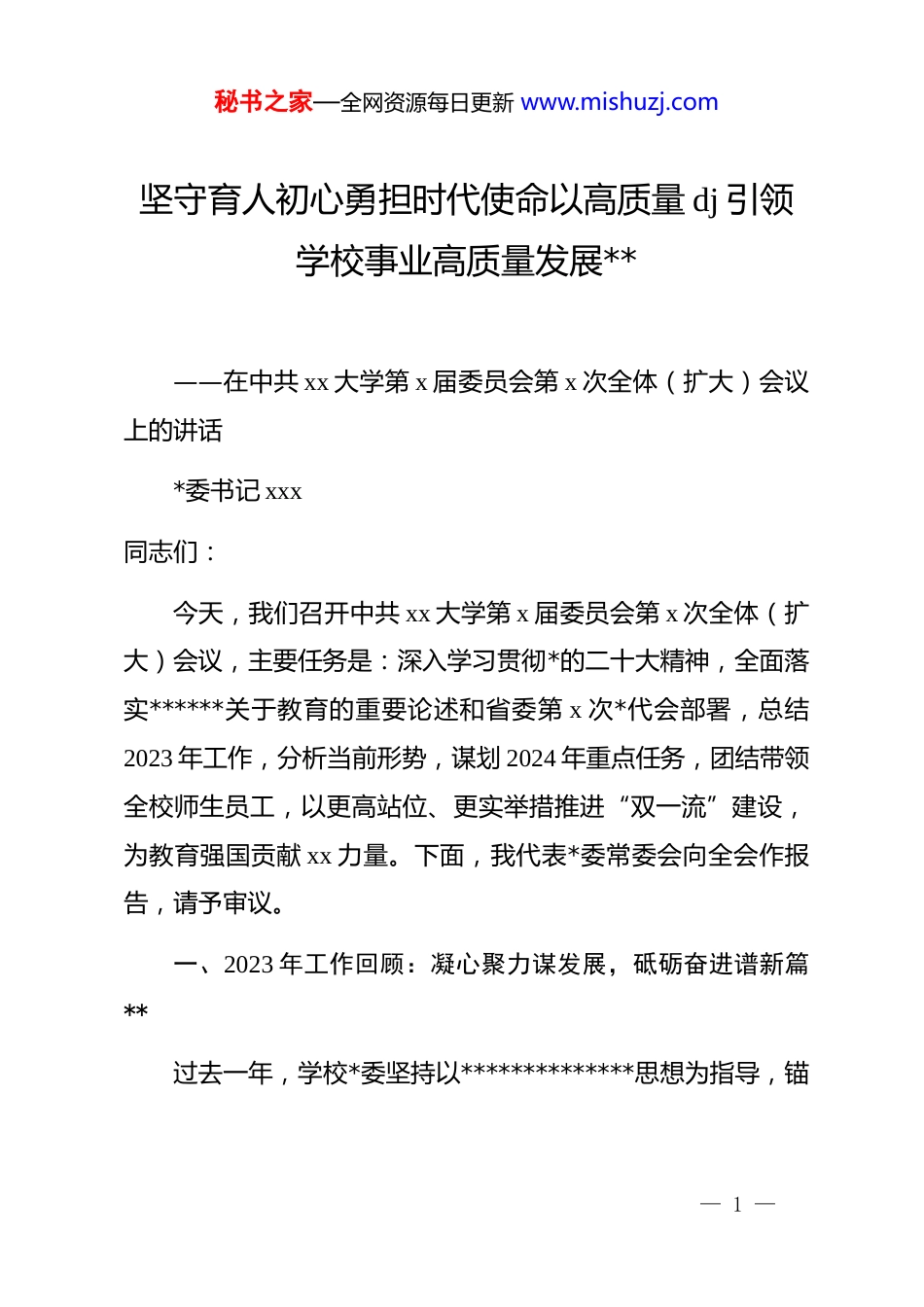秘书之家—全网资源每日更新 www.mishuzj.com坚守育人初心勇担时代使命以高质量 dj 引领学校事业高质量发展**——在中共 xx 大学第 x 届委员会第 x 次全体(扩大)会议上的讲话*委书记 xxx同志们:今天,我们召开中共 xx 大学第 x 届委员会第 x 次全体(扩大)会议,主要任务是:深入学习贯彻*的二十大精神,全面落实******关于教育的重要论述和省委第 x 次*代会部署,总结2023 年工作,分析当前形势,谋划 2024 年重点任务,团结带领全校师生员工,以更高站位、更实举措推进“双一流”建设,为教育强国贡献 xx 力量。下面,我代表*委常委会向全会作报告,请予审议。一、2023 年工作回顾:凝心聚力谋发展,砥砺奋进谱新篇**过去一年,学校*委坚持以**************思想为指导,锚— 1 —秘书之家—全网资源每日更新 www.mishuzj.com定“十四五”规划目标,统筹推进 dj 与事业发展,各项事业取得显著成效:(一)政治建设全面加强**1.深入学习贯彻*的二十大精神,开展专题学习研讨 x 场,实现*员干部培训全覆盖。2.高标准推进 zt 教育,整改师生关切问题 x 项,建立长效机制 x 项。3.严格落实意识形态责任制,完善“三审三校”制度,守牢校园舆论阵地。(二)立德树人成效显著**1.构建“大思政”格局,新增省级思政精品课 x 门,获全国思政课教学竞赛一等奖 x 项。2.深化“五育并举”,学生获国家级学科竞赛奖项 x 项,就业率达 xx%,创历史新高。(三)学科建设实现突破**1.新增 esi 全球前 1%学科 x 个,获批国家级重点研发计划项目 x 项。— 2 —秘书之家—全网资源每日更新 www.mishuzj.com2.引进高层次人才 x 人,培育“长江学者”x 名,师资队伍结构持续优化。(四)服务社会彰显担当**1.与 x 地市政府共建产业研究院 x 个,科技成果转化金额突破 x 亿元。2.开展乡村振兴对口帮扶,培训基层干部 x 人次,获评“全国社会实践先进单位”。(五)治理效能持续提升**1.完成校内巡察全覆盖,整改问题 x 项,风清气正的政治生态进一步巩固。2.推进“智慧校园”建设,师生办事“一网通办”覆盖率提升至 xx%。在肯定成绩的同时,我们也要清醒认识到:学科高峰数量不足、科研原创能力有待提升、管理精细化水平仍需加强……这些问题必须在新一年工作中重点突破。二、形势与任务:把握时代方位,扛起使命担当**当前,高等教育正处于“变局与机遇并存”的关键期:— 3 —秘书之家—全网资源每日更新 www.mishuzj.com从国家战略看,教育、科技、人才“三位一体”部署对高校提出更高要求;从区域发展看,我省“创新驱动”战略亟需高校提供智力支撑;从自身实际看,新一轮“双一流”建设竞争激烈,慢进则退、不进则汰。2024 年工作总体思路:以**************思想为指导,聚焦“立德树人”根本任务,实施“dj 领航、学科攀登、人才强校、治理增效”四大行动,奋力开创中国特色世界一流大学建设新局面。三、2024 年重点工作:锚定目标,攻坚突破**(一)以政治建设为统领,筑牢高质量发展根基**1.强化理论武装:开展“**************思想溯源工程”,建立领导干部领学、支部研学、*员践学机制。2.夯实基层 dj:实施教师*支部书记“双带头人”培育计划,打造 x 个全国样板*支部。3.深化全面从严治*:开展“作风建设年”活动,重点整治— 4 —秘书之家—全网资源每日更新 www.mishuzj.com学术不端、师德失范问题。(二)以立德树人为根本,培育时代新人**1.构建“大思政”体系:推动“课程思政”全覆盖,建设“红色校史馆”等实践育人基地。2.推进“新工科、新医科”建设:新增跨学科专业 x 个,与企业共建现代产业学院 x 个。(三)以学科建设为龙头,增强核心竞争力**1.实施“高峰学科攀登计划”:集中资源培育 x 个冲击 a+学科,布局人工智能、碳中和等新兴领域。2.打造国家级科研平台**:筹建“xx 国家重点实验室”,力争国家自然科学基金立项数增长 xx%。(四)以改革创新为动力,提升治理现代化水平**1.深化评价改革:建立“破五唯”人才评价体系,突出质量、贡献导向。2.优化资源配置:推进“...