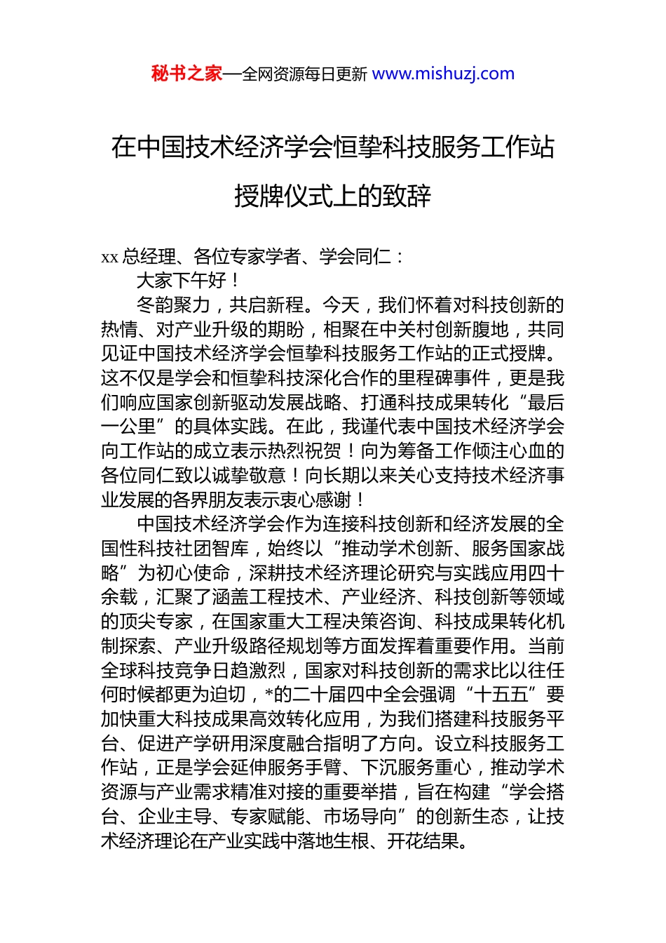 秘书之家—全网资源每日更新 www.mishuzj.com在中国技术经济学会恒挚科技服务工作站授牌仪式上的致辞xx 总经理、各位专家学者、学会同仁:大家下午好!冬韵聚力,共启新程。今天,我们怀着对科技创新的热情、对产业升级的期盼,相聚在中关村创新腹地,共同见证中国技术经济学会恒挚科技服务工作站的正式授牌。这不仅是学会和恒挚科技深化合作的里程碑事件,更是我们响应国家创新驱动发展战略、打通科技成果转化“最后一公里”的具体实践。在此,我谨代表中国技术经济学会向工作站的成立表示热烈祝贺!向为筹备工作倾注心血的各位同仁致以诚挚敬意!向长期以来关心支持技术经济事业发展的各界朋友表示衷心感谢!中国技术经济学会作为连接科技创新和经济发展的全国性科技社团智库,始终以“推动学术创新、服务国家战略”为初心使命,深耕技术经济理论研究与实践应用四十余载,汇聚了涵盖工程技术、产业经济、科技创新等领域的顶尖专家,在国家重大工程决策咨询、科技成果转化机制探索、产业升级路径规划等方面发挥着重要作用。当前全球科技竞争日趋激烈,国家对科技创新的需求比以往任何时候都更为迫切,*的二十届四中全会强调“十五五”要加快重大科技成果高效转化应用,为我们搭建科技服务平台、促进产学研用深度融合指明了方向。设立科技服务工作站,正是学会延伸服务手臂、下沉服务重心,推动学术资源与产业需求精准对接的重要举措,旨在构建“学会搭台、企业主导、专家赋能、市场导向”的创新生态,让技术经济理论在产业实践中落地生根、开花结果。秘书之家—全网资源每日更新 www.mishuzj.com选择与北京恒挚科技有限公司携手共建工作站,是学会经过审慎考察、基于战略契合的必然选择。恒挚科技作为一家年轻的高新技术企业,凭借其前瞻的战略布局、扎实的研发实力和高效的市场响应能力,在脑科学、神经管理、人因工程、仿真现实等多学科交叉领域迅速崛起,取得了令人瞩目的成绩。公司构建“研发-生产-销售-服务”一体化运营体系,与众多高校、科研院所建立合作关系,展现了极强的产学研协同能力和行业影响力。更为可贵的是,公司经营态势持续向好,拥有一支以核心技术人员为骨干的专业团队,为工作站的长效运营提供了坚实的人才资金与资源保障。我们有充分理由相信,凭借恒挚科技在技术研发、产业对接、平台运营等方面的突出优势,结合学会的学术资源、专家智库和行业影响力,双方必将实现优势互补、强强联合,共同打造科技服务工作站的标杆典范。站在新的发展起点,恒挚科技服务工作站的成立承载着多重使命和期待:一是打造“学术-产业”深度融合的对接枢纽。依托学会的专家资源,聚焦恒挚科技的核心业务领域,围绕脑科学技术产业化、人因工程创新应用、智能仿真设备研发等关键方向,开展定制化学术研究与技术攻关,推动前沿理论与产业需求精准匹配,实现“从实验室到生产线”的高效转化。二是构建“人才-项目”双向赋能的孵化平台。整合学会与企业的优质资源,建立“高校导师+产业导师”联合培养机制,开设技术转移实践课程,培养既懂技术又懂市场的复合型人才;同时,通过举办创新沙龙、项目路演、技术对接会等活动,孵化具有市场潜力的创新项目,为产业升级注入新动能。三是搭建“区域-全国”资源联动服务网络。立足北京、辐射全国,依托恒挚科技已有的合作渠道,链接更多高校秘书之家—全网资源每日更新 www.mishuzj.com科研院所、企业与投资机构,构建“政产学研金服用”协同创新网络,推动跨区域、跨领域的资源共享与合作共赢为新质生产力发展提供有力支撑。作为发起单位,中国技术经济学会将全力支持工作站的建设和发展。在此,我提出四点期望:第一,坚守战略定位,锚定服务导向。始终围绕国家科技创新与产业升级的核心需求,聚焦恒挚科技的主营业务和发展痛点,以解决实际问题为出发点,以成果转化为落脚点,让工作站成为企业创新发展的“智囊团”、产业升级的“助推器”。第二,强化学术赋能,提升服务质效。充分发挥学会的专家智库优势,组织技术经济领域的顶尖专家深度参与工作站建设,运用专业理论和方法,为企业提供技术评估决策咨询、风险研判等高质量服务...