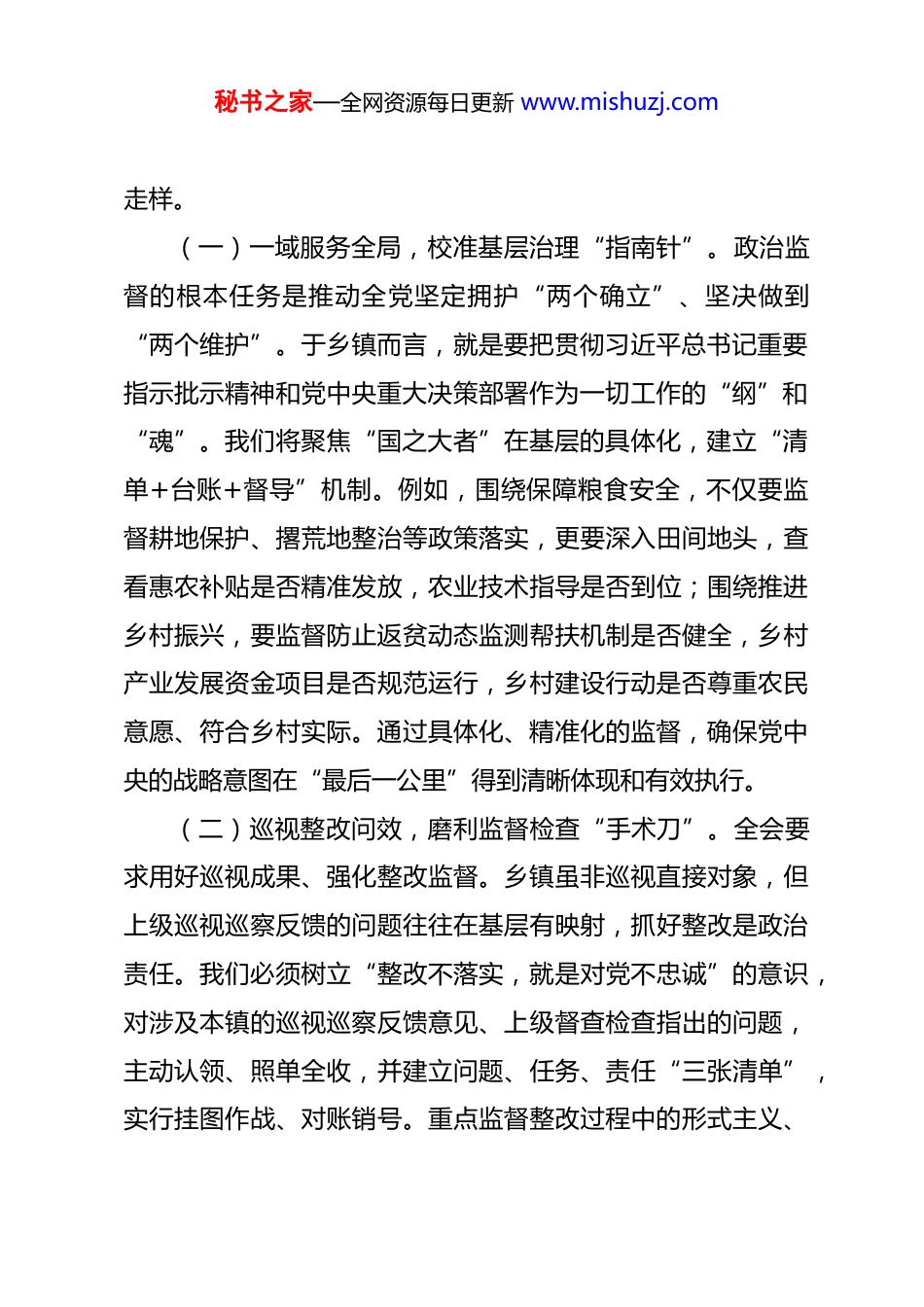 秘书之家—全网资源每日更新 www.mishuzj.com镇党委书记关于学习贯彻二十届中央纪委五次全会精神的研讨交流发言 同志们:二十届中央纪委五次全会是在我国迈上全面建设社会主义现代化国家新征程、向第二个百年奋斗目标进军的关键时刻召开的一次重要会议。习近平总书记发表的重要讲话,深刻阐述了党的自我革命的重要思想,科学研判了反腐败斗争面临的新形势新挑战,对持续发力、纵深推进全面从严治党作出战略部署,为新征程纪检监察工作高质量发展提供了根本遵循。作为镇党委书记,必须带头深入学习领会,坚决贯彻落实,切实将全会精神转化为推动本镇全面从严治党向纵深发展、保障经济社会高质量发展的具体行动和实际成效。下面,结合学习和工作实际,我谈几点认识和体会。一、以“舟水之喻”明鉴政治监督之要,校准基层发展“指南针”,确保党中央决策部署一贯到底习近平总书记反复强调,“政治监督是督促全党坚持党中央集中统一领导的有力举措”。全会将“更加坚决有力地贯彻落实党中央重大决策部署”置于突出位置,这就要求我们必须将强化政治监督作为首要职责,确保执行不偏向、不变通、不秘书之家—全网资源每日更新 www.mishuzj.com走样。(一)一域服务全局,校准基层治理“指南针”。政治监督的根本任务是推动全党坚定拥护“两个确立”、坚决做到“两个维护”。于乡镇而言,就是要把贯彻习近平总书记重要指示批示精神和党中央重大决策部署作为一切工作的“纲”和“魂”。我们将聚焦“国之大者”在基层的具体化,建立“清单+台账+督导”机制。例如,围绕保障粮食安全,不仅要监督耕地保护、撂荒地整治等政策落实,更要深入田间地头,查看惠农补贴是否精准发放,农业技术指导是否到位;围绕推进乡村振兴,要监督防止返贫动态监测帮扶机制是否健全,乡村产业发展资金项目是否规范运行,乡村建设行动是否尊重农民意愿、符合乡村实际。通过具体化、精准化的监督,确保党中央的战略意图在“最后一公里”得到清晰体现和有效执行。(二)巡视整改问效,磨利监督检查“手术刀”。全会要求用好巡视成果、强化整改监督。乡镇虽非巡视直接对象,但上级巡视巡察反馈的问题往往在基层有映射,抓好整改是政治责任。我们必须树立“整改不落实,就是对党不忠诚”的意识,对涉及本镇的巡视巡察反馈意见、上级督查检查指出的问题,主动认领、照单全收,并建立问题、任务、责任“三张清单”,实行挂图作战、对账销号。重点监督整改过程中的形式主义、秘书之家—全网资源每日更新 www.mishuzj.com官僚主义问题,坚决防止“纸面整改”“数字整改”。同时,举一反三,深挖问题背后的制度机制短板,推动以巡促改、以巡促建、以巡促治,将整改成效切实转化为治理效能。(三)紧扣发展要务,激活干事创业“动力源”。全会部署围绕贯彻新发展理念、推动高质量发展等任务加强监督。作为乡镇发展的“领头雁”,必须将政治监督融入经济社会发展全过程。我们将聚焦本镇“十五五”规划实施、重点项目推进、优化营商环境、生态环境保护、安全生产责任落实等关键领域,开展嵌入式监督。特别是在因地制宜发展新质生产力、盘活农村闲置资源资产、推动农文旅融合发展等方面,既要鼓励大胆探索、担当作为,也要严格防范廉政风险、决策风险。通过精准有效的监督,及时纠正偏差、清除障碍,为干部干事创业营造既风清气正又奋发有为的政治生态和发展环境。二、以“规矩绳墨”构筑制度约束之笼,扎紧基层权力“铁栅栏”,推动规范用权常态长效习近平总书记深刻指出,“把权力关进制度的笼子里,首先要建好笼子”。全会强调“更加科学有效地把权力关进制度笼子”,这要求我们必须将制度建设贯穿于管党治党、基层治理的各方面,确保权力在正确轨道上运行。(一)完善制度体系,织密权力运行“防护网”。“制度秘书之家—全网资源每日更新 www.mishuzj.com密而不繁、有效管用”是全会提出的明确要求。针对乡镇“麻雀虽小、五脏俱全”,权力运行点多面广的特点,我们将系统梳理现行规章制度,重点围绕“三重一大”决策、工程项目建设、农村“三资”管理、惠民惠农财政补贴资金发放、民政救助、行政审批与服务等关键环节...