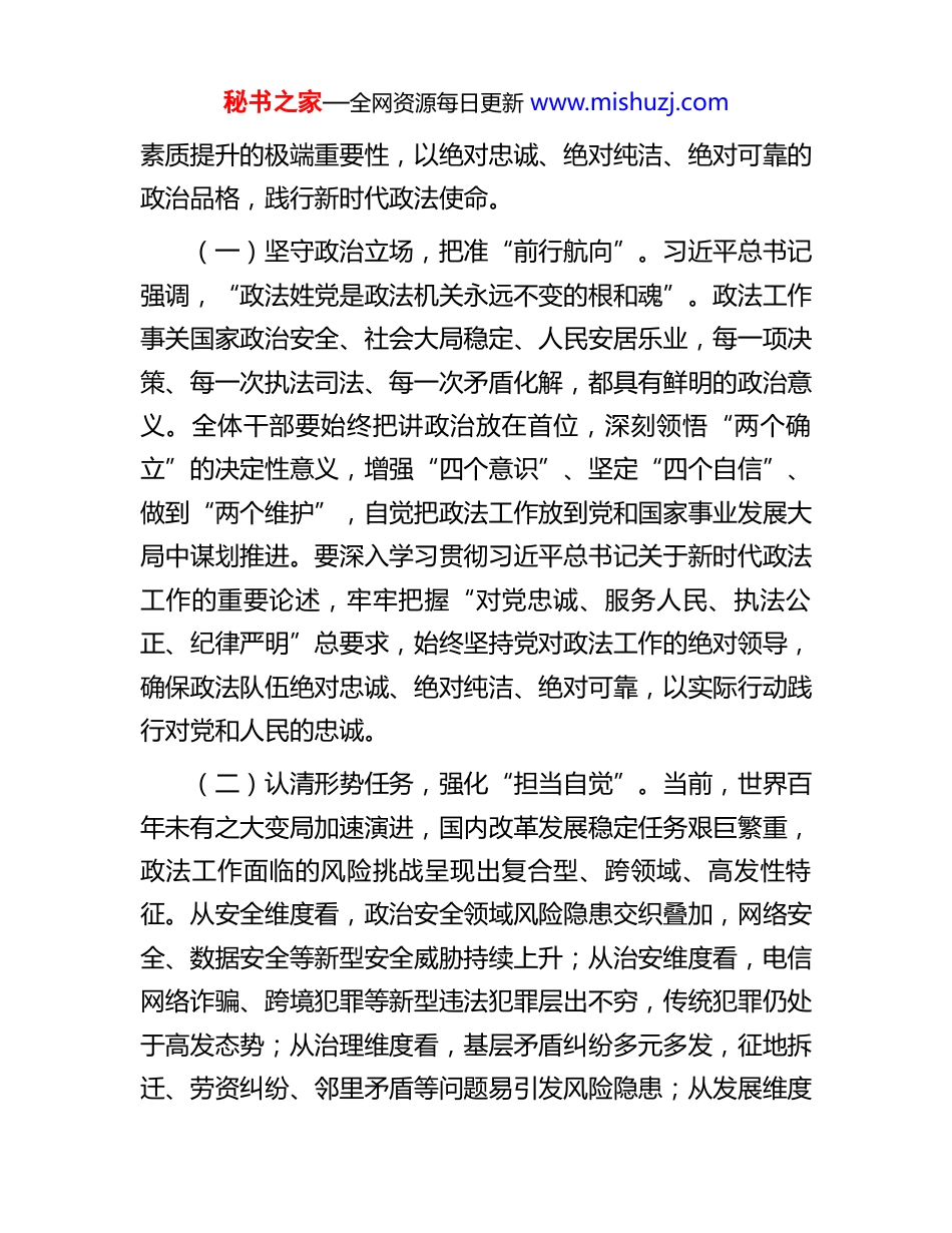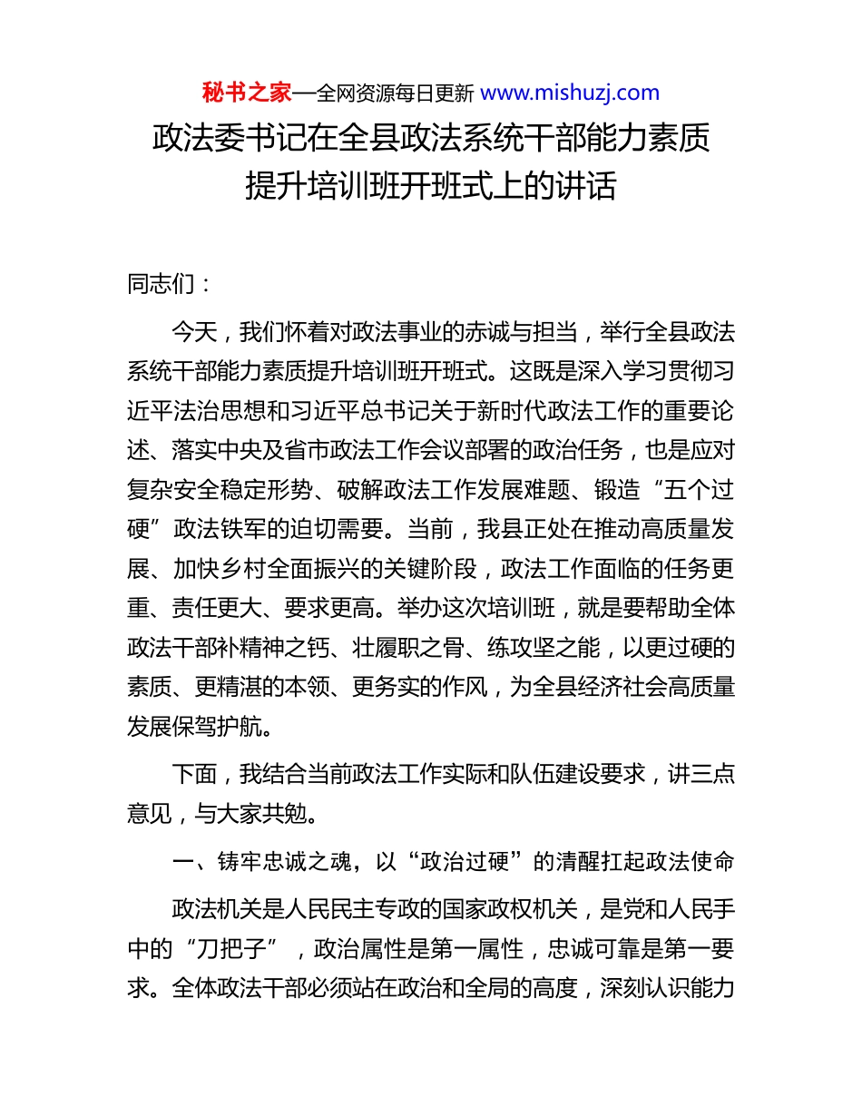 秘书之家—全网资源每日更新 www.mishuzj.com政法委书记在全县政法系统干部能力素质提升培训班开班式上的讲话同志们:今天,我们怀着对政法事业的赤诚与担当,举行全县政法系统干部能力素质提升培训班开班式。这既是深入学习贯彻习近平法治思想和习近平总书记关于新时代政法工作的重要论述、落实中央及省市政法工作会议部署的政治任务,也是应对复杂安全稳定形势、破解政法工作发展难题、锻造“五个过硬”政法铁军的迫切需要。当前,我县正处在推动高质量发展、加快乡村全面振兴的关键阶段,政法工作面临的任务更重、责任更大、要求更高。举办这次培训班,就是要帮助全体政法干部补精神之钙、壮履职之骨、练攻坚之能,以更过硬的素质、更精湛的本领、更务实的作风,为全县经济社会高质量发展保驾护航。下面,我结合当前政法工作实际和队伍建设要求,讲三点意见,与大家共勉。一、铸牢忠诚之魂,以“政治过硬”的清醒扛起政法使命政法机关是人民民主专政的国家政权机关,是党和人民手中的“刀把子”,政治属性是第一属性,忠诚可靠是第一要求。全体政法干部必须站在政治和全局的高度,深刻认识能力秘书之家—全网资源每日更新 www.mishuzj.com素质提升的极端重要性,以绝对忠诚、绝对纯洁、绝对可靠的政治品格,践行新时代政法使命。(一)坚守政治立场,把准“前行航向”。习近平总书记强调,“政法姓党是政法机关永远不变的根和魂”。政法工作事关国家政治安全、社会大局稳定、人民安居乐业,每一项决策、每一次执法司法、每一次矛盾化解,都具有鲜明的政治意义。全体干部要始终把讲政治放在首位,深刻领悟“两个确立”的决定性意义,增强“四个意识”、坚定“四个自信”、做到“两个维护”,自觉把政法工作放到党和国家事业发展大局中谋划推进。要深入学习贯彻习近平总书记关于新时代政法工作的重要论述,牢牢把握“对党忠诚、服务人民、执法公正、纪律严明”总要求,始终坚持党对政法工作的绝对领导,确保政法队伍绝对忠诚、绝对纯洁、绝对可靠,以实际行动践行对党和人民的忠诚。(二)认清形势任务,强化“担当自觉”。当前,世界百年未有之大变局加速演进,国内改革发展稳定任务艰巨繁重,政法工作面临的风险挑战呈现出复合型、跨领域、高发性特征。从安全维度看,政治安全领域风险隐患交织叠加,网络安全、数据安全等新型安全威胁持续上升;从治安维度看,电信网络诈骗、跨境犯罪等新型违法犯罪层出不穷,传统犯罪仍处于高发态势;从治理维度看,基层矛盾纠纷多元多发,征地拆迁、劳资纠纷、邻里矛盾等问题易引发风险隐患;从发展维度秘书之家—全网资源每日更新 www.mishuzj.com看,人民群众对公平正义、公共服务、安全保障的期待越来越高。面对新形势新任务,我们的政法干部队伍在风险洞察、应急处突、法治素养、群众工作等方面还存在一些短板。大家必须清醒认识到,能力不足是最大的风险,本领恐慌是最大的危机。唯有主动补短板、强弱项、提能力,才能在复杂局面中牢牢掌握主动权,真正扛起维护安全稳定、护航发展大局的政治责任。(三)践行人民至上,永葆“为民初心”。“江山就是人民,人民就是江山。”政法工作的根基在人民、力量在人民。从街头巷尾的巡逻防控到打击犯罪的雷霆行动,从司法为民的便民服务到矛盾纠纷的多元化解,每一项工作都连着民心、关乎民生。近年来,我们持续深化扫黑除恶专项斗争,破获了一批群众反映强烈的刑事案件;推进“一站式”矛盾纠纷调处中心建设,化解了一批信访积案和突出矛盾;深化政法领域“放管服”改革,推出了一批便民利企举措,群众安全感满意度持续提升。但我们也要看到,群众在安全保障、执法公正、服务效率等方面还有不少期盼。全体干部要始终坚守为民初心,把群众的“急难愁盼”作为工作的出发点和落脚点,主动深入基层、深入群众,倾听群众呼声、了解群众需求,用心用情用力解决好群众反映强烈的突出问题。要以“时时放心不下”的责任感,严厉打击侵害群众利益的违法犯罪,公正规范文明执法司法,让群众在每一起案件办理、每一件事情处理中都能感受秘书之家—全网资源每日更新 www.mishuzj.com到公平正义,不断增强群...