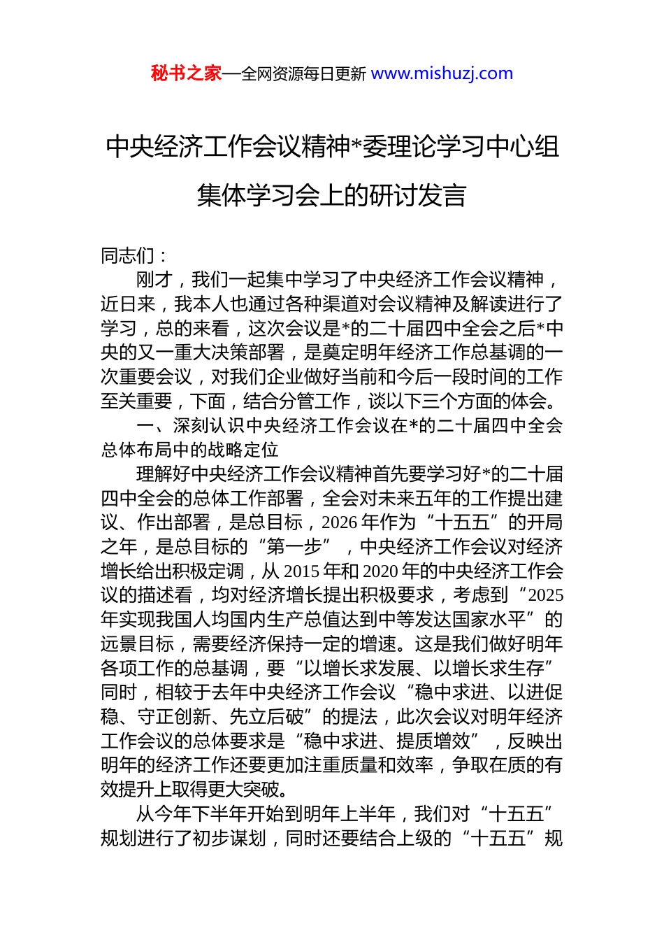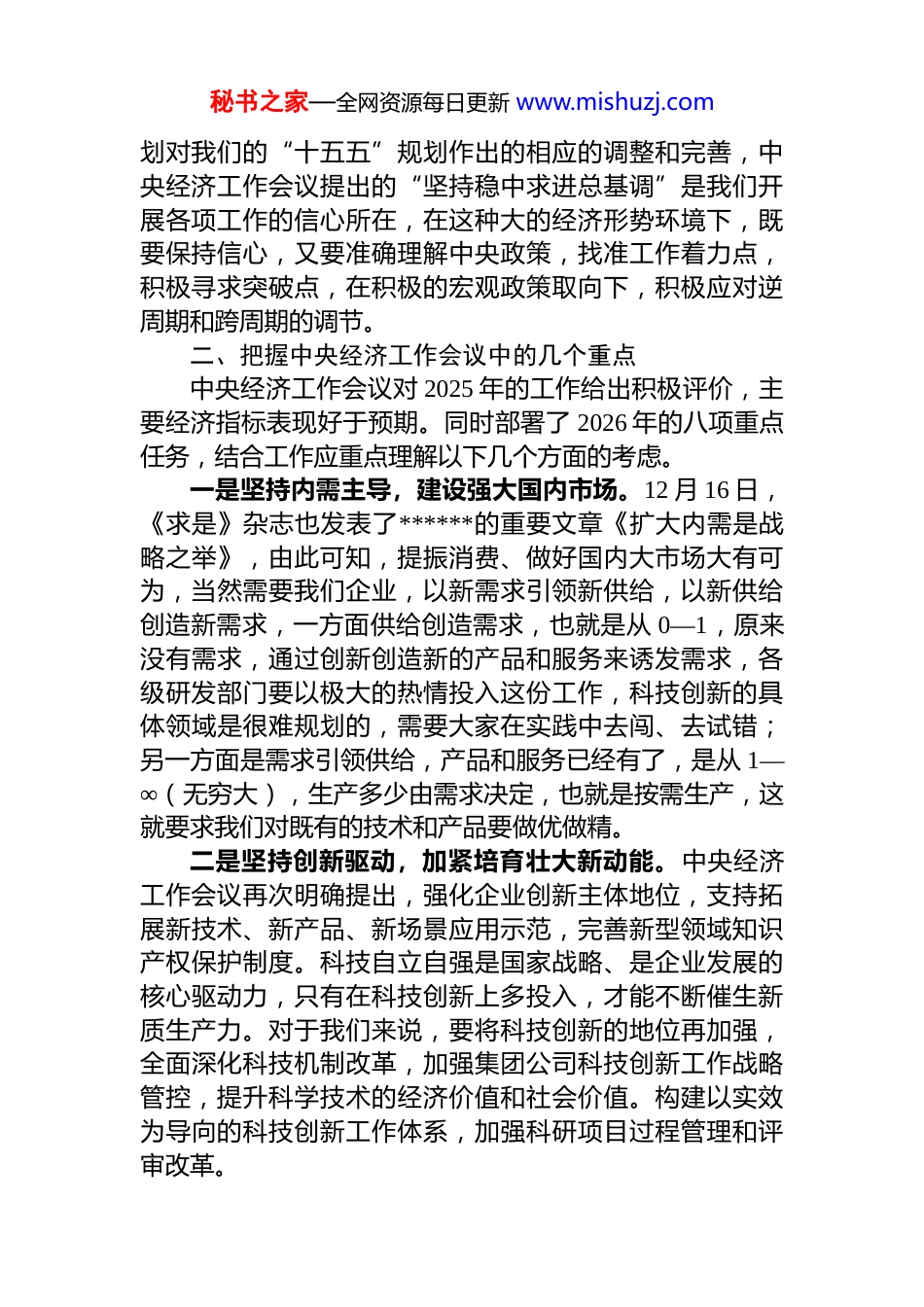 秘书之家—全网资源每日更新 www.mishuzj.com中央经济工作会议精神*委理论学习中心组集体学习会上的研讨发言同志们:刚才,我们一起集中学习了中央经济工作会议精神,近日来,我本人也通过各种渠道对会议精神及解读进行了学习,总的来看,这次会议是*的二十届四中全会之后*中央的又一重大决策部署,是奠定明年经济工作总基调的一次重要会议,对我们企业做好当前和今后一段时间的工作至关重要,下面,结合分管工作,谈以下三个方面的体会。一、深刻认识中央经济工作会议在*的二十届四中全会总体布局中的战略定位理解好中央经济工作会议精神首先要学习好*的二十届四中全会的总体工作部署,全会对未来五年的工作提出建议、作出部署,是总目标,2026 年作为“十五五”的开局之年,是总目标的“第一步”,中央经济工作会议对经济增长给出积极定调,从 2015 年和 2020 年的中央经济工作会议的描述看,均对经济增长提出积极要求,考虑到“2025年实现我国人均国内生产总值达到中等发达国家水平”的远景目标,需要经济保持一定的增速。这是我们做好明年各项工作的总基调,要“以增长求发展、以增长求生存”同时,相较于去年中央经济工作会议“稳中求进、以进促稳、守正创新、先立后破”的提法,此次会议对明年经济工作会议的总体要求是“稳中求进、提质增效”,反映出明年的经济工作还要更加注重质量和效率,争取在质的有效提升上取得更大突破。从今年下半年开始到明年上半年,我们对“十五五”规划进行了初步谋划,同时还要结合上级的“十五五”规秘书之家—全网资源每日更新 www.mishuzj.com划对我们的“十五五”规划作出的相应的调整和完善,中央经济工作会议提出的“坚持稳中求进总基调”是我们开展各项工作的信心所在,在这种大的经济形势环境下,既要保持信心,又要准确理解中央政策,找准工作着力点,积极寻求突破点,在积极的宏观政策取向下,积极应对逆周期和跨周期的调节。二、把握中央经济工作会议中的几个重点中央经济工作会议对 2025 年的工作给出积极评价,主要经济指标表现好于预期。同时部署了 2026 年的八项重点任务,结合工作应重点理解以下几个方面的考虑。一是坚持内需主导,建设强大国内市场。12 月 16 日,《求是》杂志也发表了******的重要文章《扩大内需是战略之举》,由此可知,提振消费、做好国内大市场大有可为,当然需要我们企业,以新需求引领新供给,以新供给创造新需求,一方面供给创造需求,也就是从 0—1,原来没有需求,通过创新创造新的产品和服务来诱发需求,各级研发部门要以极大的热情投入这份工作,科技创新的具体领域是很难规划的,需要大家在实践中去闯、去试错;另一方面是需求引领供给,产品和服务已经有了,是从 1—∞(无穷大),生产多少由需求决定,也就是按需生产,这就要求我们对既有的技术和产品要做优做精。二是坚持创新驱动,加紧培育壮大新动能。中央经济工作会议再次明确提出,强化企业创新主体地位,支持拓展新技术、新产品、新场景应用示范,完善新型领域知识产权保护制度。科技自立自强是国家战略、是企业发展的核心驱动力,只有在科技创新上多投入,才能不断催生新质生产力。对于我们来说,要将科技创新的地位再加强,全面深化科技机制改革,加强集团公司科技创新工作战略管控,提升科学技术的经济价值和社会价值。构建以实效为导向的科技创新工作体系,加强科研项目过程管理和评审改革。秘书之家—全网资源每日更新 www.mishuzj.com三是坚持“双碳”引领,推动全面绿色转型。绿色发展是高质量发展的底色,近期国家发展和改革工作会议、全国能源工作会议陆续在北京召开,提出“稳步实施碳排放总量和强度双控制度,完善配套制度,强化评价考核,严控新增‘两高’项目。”同时,把能源目标与“五位一体”“四个全面”深度融合,“建设能源强国”与构建现代产业体系、推动经济结构优化、守住安全底线等紧密结合,承担起服务高质量发展、统筹高水平安全、牵引全面绿色转型的符合功能。作为能源行业企业,要持续在“绿色”上做文章,在积极稳妥推进碳达峰上积极作为,从源头上做到降碳减碳。三、切实谋划好 2026 ...
