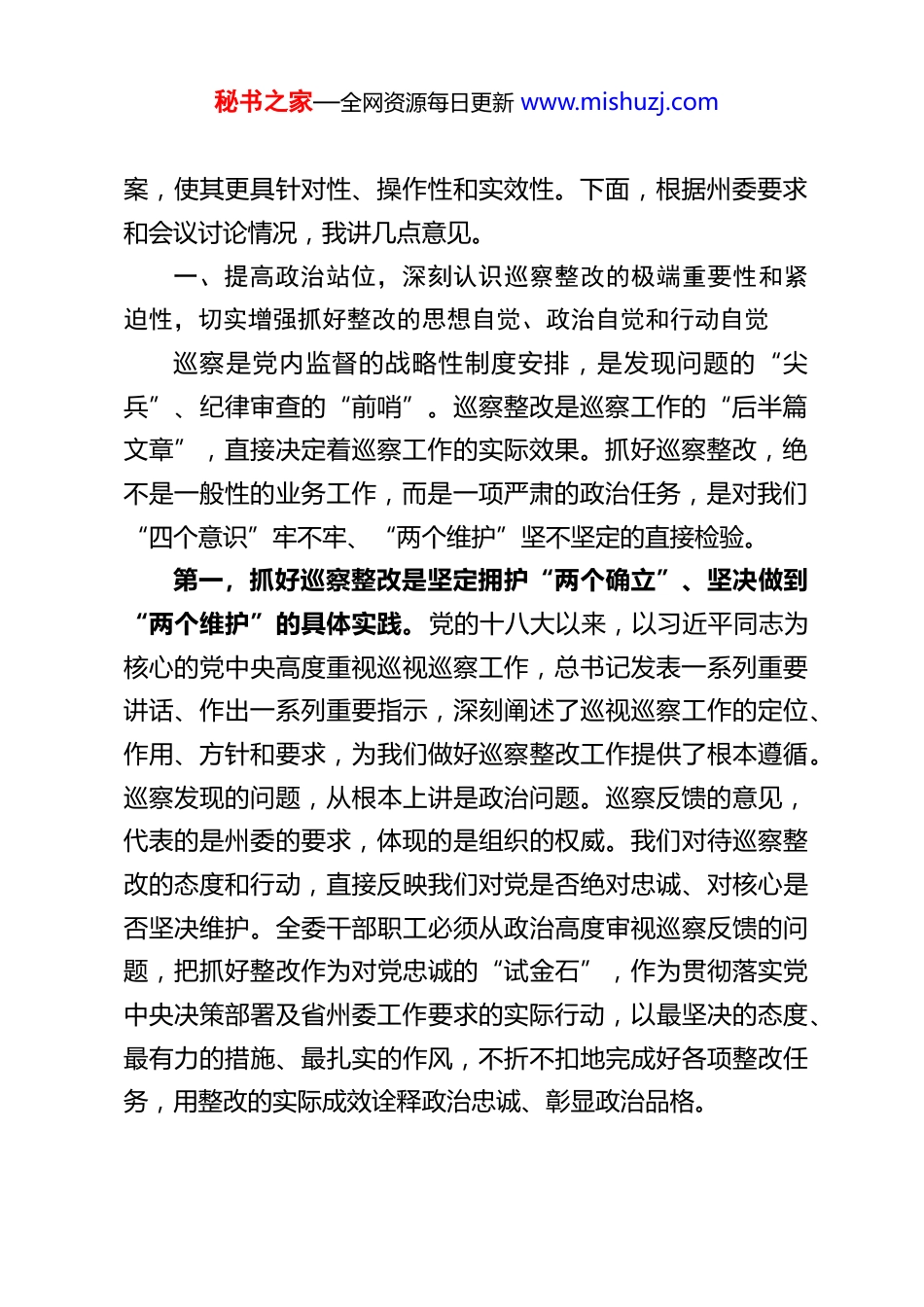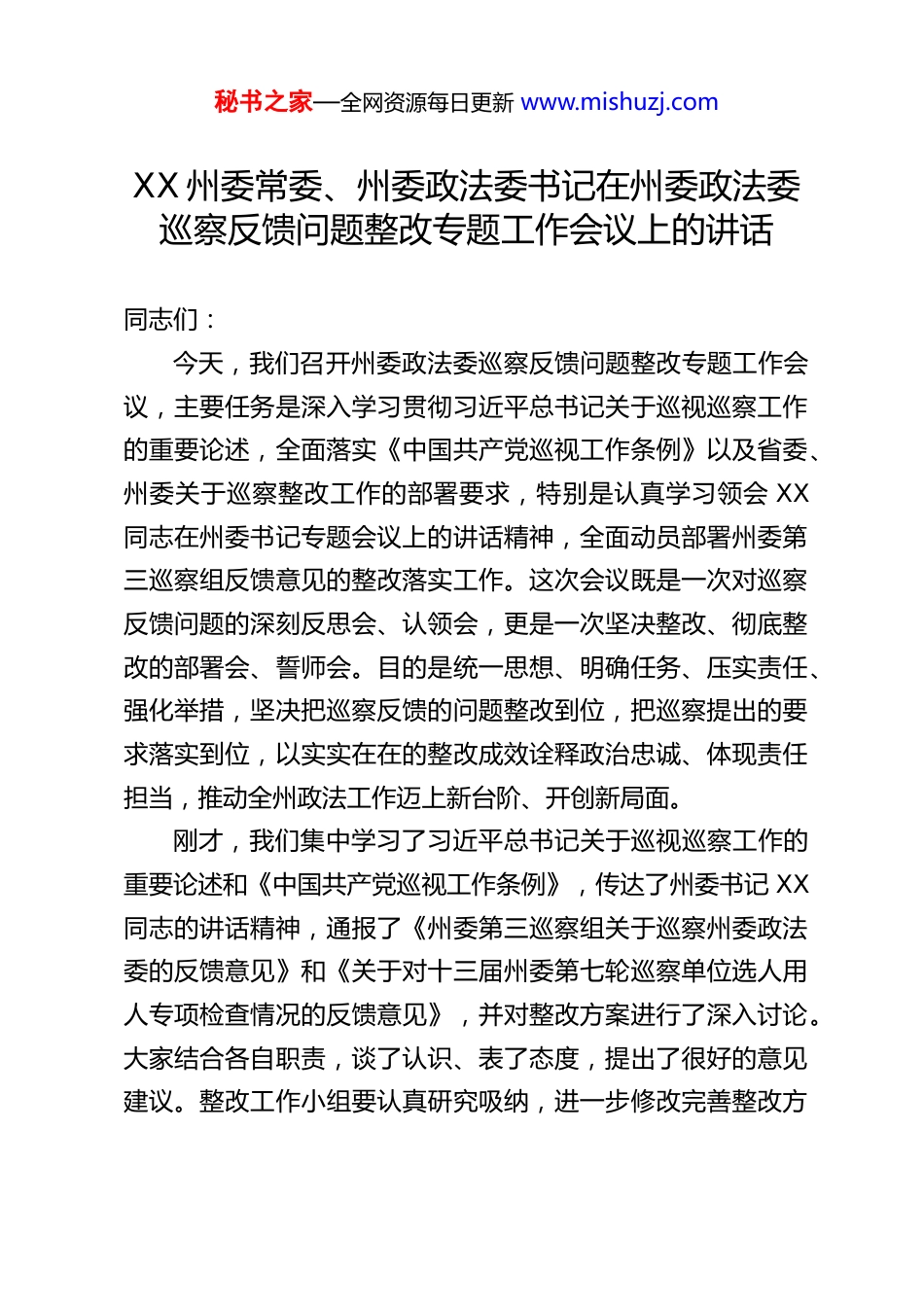 秘书之家—全网资源每日更新 www.mishuzj.comXX 州委常委、州委政法委书记在州委政法委巡察反馈问题整改专题工作会议上的讲话同志们:今天,我们召开州委政法委巡察反馈问题整改专题工作会议,主要任务是深入学习贯彻习近平总书记关于巡视巡察工作的重要论述,全面落实《中国共产党巡视工作条例》以及省委、州委关于巡察整改工作的部署要求,特别是认真学习领会 XX同志在州委书记专题会议上的讲话精神,全面动员部署州委第三巡察组反馈意见的整改落实工作。这次会议既是一次对巡察反馈问题的深刻反思会、认领会,更是一次坚决整改、彻底整改的部署会、誓师会。目的是统一思想、明确任务、压实责任、强化举措,坚决把巡察反馈的问题整改到位,把巡察提出的要求落实到位,以实实在在的整改成效诠释政治忠诚、体现责任担当,推动全州政法工作迈上新台阶、开创新局面。刚才,我们集中学习了习近平总书记关于巡视巡察工作的重要论述和《中国共产党巡视工作条例》,传达了州委书记 XX同志的讲话精神,通报了《州委第三巡察组关于巡察州委政法委的反馈意见》和《关于对十三届州委第七轮巡察单位选人用人专项检查情况的反馈意见》,并对整改方案进行了深入讨论。大家结合各自职责,谈了认识、表了态度,提出了很好的意见建议。整改工作小组要认真研究吸纳,进一步修改完善整改方秘书之家—全网资源每日更新 www.mishuzj.com案,使其更具针对性、操作性和实效性。下面,根据州委要求和会议讨论情况,我讲几点意见。一、提高政治站位,深刻认识巡察整改的极端重要性和紧迫性,切实增强抓好整改的思想自觉、政治自觉和行动自觉巡察是党内监督的战略性制度安排,是发现问题的“尖兵”、纪律审查的“前哨”。巡察整改是巡察工作的“后半篇文章”,直接决定着巡察工作的实际效果。抓好巡察整改,绝不是一般性的业务工作,而是一项严肃的政治任务,是对我们“四个意识”牢不牢、“两个维护”坚不坚定的直接检验。第一,抓好巡察整改是坚定拥护“两个确立”、坚决做到“两个维护”的具体实践。党的十八大以来,以习近平同志为核心的党中央高度重视巡视巡察工作,总书记发表一系列重要讲话、作出一系列重要指示,深刻阐述了巡视巡察工作的定位、作用、方针和要求,为我们做好巡察整改工作提供了根本遵循。巡察发现的问题,从根本上讲是政治问题。巡察反馈的意见,代表的是州委的要求,体现的是组织的权威。我们对待巡察整改的态度和行动,直接反映我们对党是否绝对忠诚、对核心是否坚决维护。全委干部职工必须从政治高度审视巡察反馈的问题,把抓好整改作为对党忠诚的“试金石”,作为贯彻落实党中央决策部署及省州委工作要求的实际行动,以最坚决的态度、最有力的措施、最扎实的作风,不折不扣地完成好各项整改任务,用整改的实际成效诠释政治忠诚、彰显政治品格。秘书之家—全网资源每日更新 www.mishuzj.com第二,抓好巡察整改是推动全面从严管党治警向纵深发展锻造过硬政法铁军的重要契机。政法机关是党和人民掌握的“刀把子”,必须坚持更高的标准、更严的要求。此次巡察反馈的问题,既有党建工作方面的不足,也有作风建设方面的短板;既有业务工作中的偏差,也有选人用人方面的隐忧。这些问题客观存在,有的还比较突出,暴露出我们在管党治警责任落实、内部管理监督、干部教育培养等方面还存在薄弱环节。如果我们对这些问题视而不见、讳疾忌医,或者整改不力、敷衍了事,就会滋生更大的风险隐患,损害政法机关的形象和公信力,甚至影响政法事业的健康发展。我们必须以此次巡察整改为契机,发扬彻底的自我革命精神,敢于刮骨疗毒、壮士断腕,把严的主基调长期坚持下去,一体推进不敢腐、不能腐、不想腐体制机制建设,下大气力解决突出问题,纯洁干部队伍,优化政治生态,努力锻造一支党和人民信得过、靠得住、能放心的 XX 政法铁军。第三,抓好巡察整改是破解发展难题、提升履职能力、推动 XX 政法工作高质量发展的强大动力。巡察的目的在于发现问题、形成震慑,推动改革、促进发展。反馈指出的问题,既是工作中的痛点、堵点、难点,也是我们改进工作、提升水平的突破口和着力点。当...