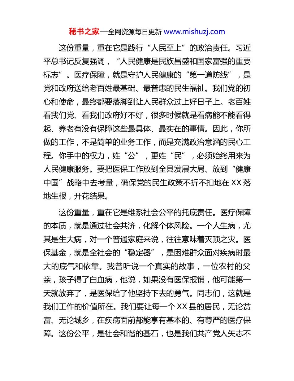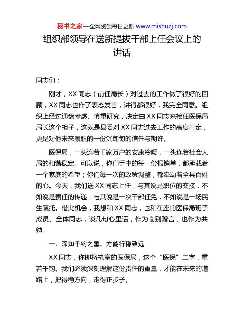 秘书之家—全网资源每日更新 www.mishuzj.com组织部领导在送新提拔干部上任会议上的讲话同志们:刚才,XX 同志(前任局长)对过去的工作做了很好的回顾,XX 同志也作了表态发言,讲得都很好,我完全同意。组织上经过通盘考虑、慎重研究,决定由 XX 同志来接任医保局局长这个担子,这既是县委对 XX 同志过去工作的高度肯定,更是对他未来履职的一份沉甸甸的信任与期许。医保局,一头连着千家万户的安康冷暖,一头连着社会大局的和谐稳定。可以说,你们手中的每一份报销单,都承载着一个家庭的希望;你们每一次的政策调整,都牵动着全县百姓的心。今天,我们送 XX 同志上任,与其说是职位的交接,不如说是责任的传递;与其说是一次干部任免,不如说是一场民生嘱托。借此机会,我想和 XX 同志,也和在座的医保局班子成员、全体同志,谈几句心里话,作为临别赠言,也作为共勉。一、深知千钧之重,方能行稳致远XX 同志,你即将执掌的医保局,这个“医保”二字,重若千钧。我们必须深刻理解这份责任的重量,才能在未来的道路上,把得稳方向,走得正步子。秘书之家—全网资源每日更新 www.mishuzj.com这份重量,重在它是践行“人民至上”的政治责任。习近平总书记反复强调,“人民健康是民族昌盛和国家富强的重要标志”。医疗保障,就是守护人民健康的“第一道防线”,是党和政府送给老百姓最基础、最普惠的民生福祉。我们党的初心和使命,最终都要落脚到让人民群众过上好日子上。老百姓看我们党、看我们政府好不好,很多时候就是看病能不能看得起、养老有没有保障这些最具体、最实在的事情。因此,你所做的工作,不是简单的业务工作,而是充满政治意涵的民心工程。你手中的权力,姓“公”,更姓“民”,必须始终用来为人民健康服务。要把医保工作放到全县发展大局、放到“健康中国”战略中去考量,确保党的民生政策不折不扣地在 XX 落地生根,开花结果。这份重量,重在它是维系社会公平的托底责任。医疗保障的本质,就是通过社会共济,化解个体风险。一个人生病,尤其是生大病,对一个普通家庭来说,往往意味着灭顶之灾。医保基金,就是全社会的“稳定器”,是困难群众面对疾病时最大的底气和依靠。我曾听说一个真实的故事,一位农村的父亲,孩子得了白血病,他说,如果没有医保报销,他可能第一天就放弃了,是医保给了他坚持下去的勇气。同志们,这就是我们工作的价值所在。我们要让每一个 XX 县的居民,无论贫富、无论城乡,在疾病面前都能享有基本的、有尊严的医疗保障。这份公平,是社会和谐的基石,也是我们共产党人矢志不秘书之家—全网资源每日更新 www.mishuzj.com渝的追求。这份重量,重在它是应对时代挑战的发展责任。当前,我们正处在人口老龄化加速、医疗技术日新月异、群众健康需求日益增长的交汇期。如何用有限的医保基金,满足人民群众对新药、好药的期盼?如何深化“三医联动”改革,撬动医疗服务的供给侧结构性改革?如何应对数字化浪潮,推动“智慧医保”建设,让服务更便捷?这些都是摆在你面前的时代考题。这份责任,要求你不能只做一个“守门员”,更要做一个“开拓者”,在守住基金安全底线的同时,不断推动我县医保事业向着更高质量、更有效率、更可持续的方向发展。二、勇挑千斤之担,方能不负众望明白了肩上的分量,关键就要看如何去“担”。希望 XX同志到了新岗位后,能尽快转换角色,以“一日无为、三日不安”的责任感,迅速打开工作局面。一是要把好政治“方向盘”,做对党忠诚的“明白人”。医保工作政策性极强,必须时刻与党中央的决策部署对标对表。要持续深入学习习近平新时代中国特色社会主义思想,特别是总书记关于医疗保障工作的重要论述和指示批示精神,完整、准确、全面地理解和把握国家医保制度改革的顶层设计和战略意图。无论是药品集中采购、支付方式改革,还是异地就医直接结算,都要坚决执行,不能有任何的摇摆和变秘书之家—全网资源每日更新 www.mishuzj.com通。要善于从政治上看问题,不断提高政治判断力、政治领悟力、政治执行力,确保医保工作的航船始终沿着正确的方向前进。二是要算好民心“一本账”,做服务群众的...