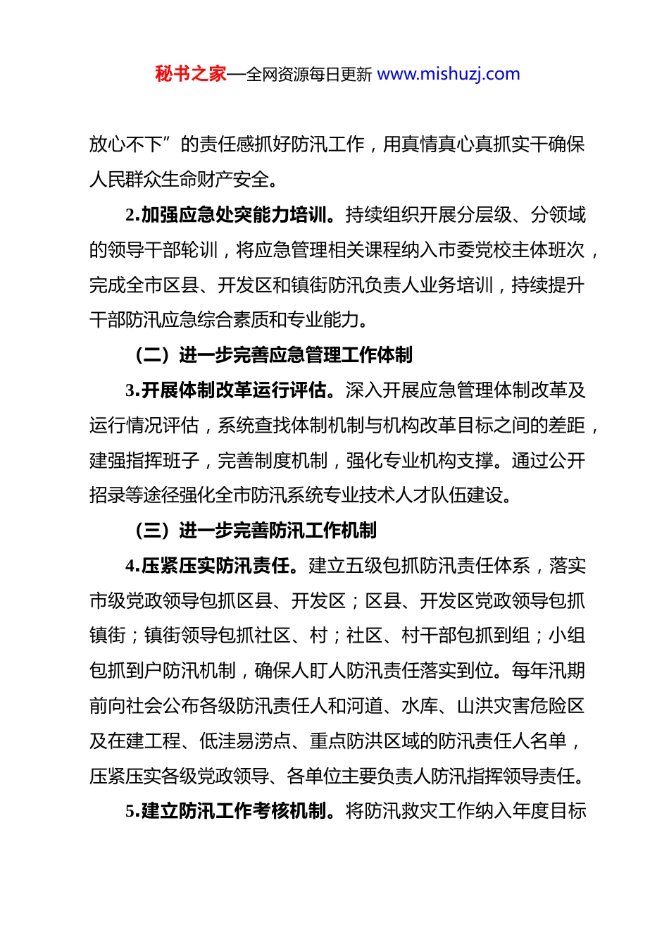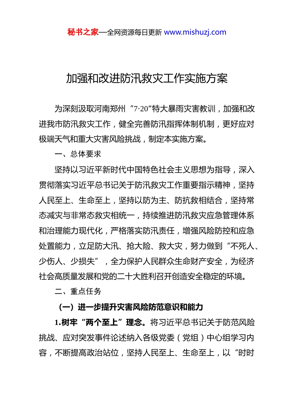 秘书之家—全网资源每日更新 www.mishuzj.com加强和改进防汛救灾工作实施方案为深刻汲取河南郑州“7·20”特大暴雨灾害教训,加强和改进我市防汛救灾工作,健全完善防汛指挥体制机制,更好应对极端天气和重大灾害风险挑战,制定本实施方案。一、总体要求坚持以习近平新时代中国特色社会主义思想为指导,深入贯彻落实习近平总书记关于防汛救灾工作重要指示精神,坚持人民至上、生命至上,坚持以防为主、防抗救相结合,坚持常态减灾与非常态救灾相统一,持续推进防汛救灾应急管理体系和治理能力现代化,严格落实防汛责任,增强风险防控和应急处置能力,立足防大汛、抢大险、救大灾,努力做到“不死人、少伤人、少损失”,全力保护人民群众生命财产安全,为经济社会高质量发展和党的二十大胜利召开创造安全稳定的环境。二、重点任务(一)进一步提升灾害风险防范意识和能力1.树牢“两个至上”理念。将习近平总书记关于防范风险挑战、应对突发事件论述纳入各级党委(党组)中心组学习内容,不断提高政治站位,坚持人民至上、生命至上,以“时时秘书之家—全网资源每日更新 www.mishuzj.com放心不下”的责任感抓好防汛工作,用真情真心真抓实干确保人民群众生命财产安全。2.加强应急处突能力培训。持续组织开展分层级、分领域的领导干部轮训,将应急管理相关课程纳入市委党校主体班次,完成全市区县、开发区和镇街防汛负责人业务培训,持续提升干部防汛应急综合素质和专业能力。(二)进一步完善应急管理工作体制3.开展体制改革运行评估。深入开展应急管理体制改革及运行情况评估,系统查找体制机制与机构改革目标之间的差距,建强指挥班子,完善制度机制,强化专业机构支撑。通过公开招录等途径强化全市防汛系统专业技术人才队伍建设。(三)进一步完善防汛工作机制4.压紧压实防汛责任。建立五级包抓防汛责任体系,落实市级党政领导包抓区县、开发区;区县、开发区党政领导包抓镇街;镇街领导包抓社区、村;社区、村干部包抓到组;小组包抓到户防汛机制,确保人盯人防汛责任落实到位。每年汛期前向社会公布各级防汛责任人和河道、水库、山洪灾害危险区及在建工程、低洼易涝点、重点防洪区域的防汛责任人名单,压紧压实各级党政领导、各单位主要负责人防汛指挥领导责任。5.建立防汛工作考核机制。将防汛救灾工作纳入年度目标秘书之家—全网资源每日更新 www.mishuzj.com责任考核内容,强化各级各部门职责落实,推动各项工作任务开展。6.完善灾情报送考核机制。建立基层灾害信息员管理考核机制,实行灾情信息“先报后核”快报机制,加强对镇(街办)、村(社区)两级灾害信息员的日常管理和定期考核,严格工作要求,严肃工作纪律,确保灾害发生时人员在岗在位、通讯畅通,信息报送及时准确,坚决杜绝迟报、瞒报、漏报、虚报等问题发生。(四)进一步提升监测预警能力7.精细实施监测预报。市气象局加强短临天气预报,提高暴雨预报延长期和精准度。建立健全极端天气和重大风险研判机制,确保遇有重要预警信息能立即研判,及时发布。进一步提升气象预报水平,提高暴雨、洪水、地质灾害、城市内涝监测预报能力和短期、临近预报精准度,关键时段实行 24 小时滚动研判预报,对严重受灾区实行重点监测预报和点对点研判指导。8.加强预警应急响应。按照“归口预警、快速发布、统一响应、共同应对”原则,各级气象、水务、资源规划、住建、城管等部门要加强气象灾害、水库河道、山洪灾害、地质灾害、城市洪涝灾害的监测预报预警,第一时间通过多种渠道发布预秘书之家—全网资源每日更新 www.mishuzj.com警信息,迅速组织本系统响应,并报告同级党委政府和防汛抗旱指挥部;各级各部门要快速高效采取“撤、封、管、停、疏”等应急措施,提前组织危险区域群众转移避险,将工作做在成灾之前。(五)进一步提升应急预案执行能力9.加强预案体系建设。加快修订防汛总体预案,编制防汛专项预案和基层单位预案。制定防汛紧急避险安置、山洪灾害防御、地质灾害防御、城市防洪排涝、防汛电力保障、防汛通信保障、防汛交通保障、消防救援队伍洪涝灾害救援等专项预案,制定水库汛期调度运用计划和防御洪水...