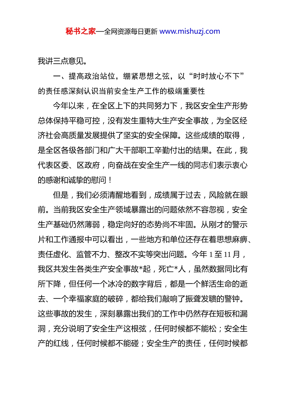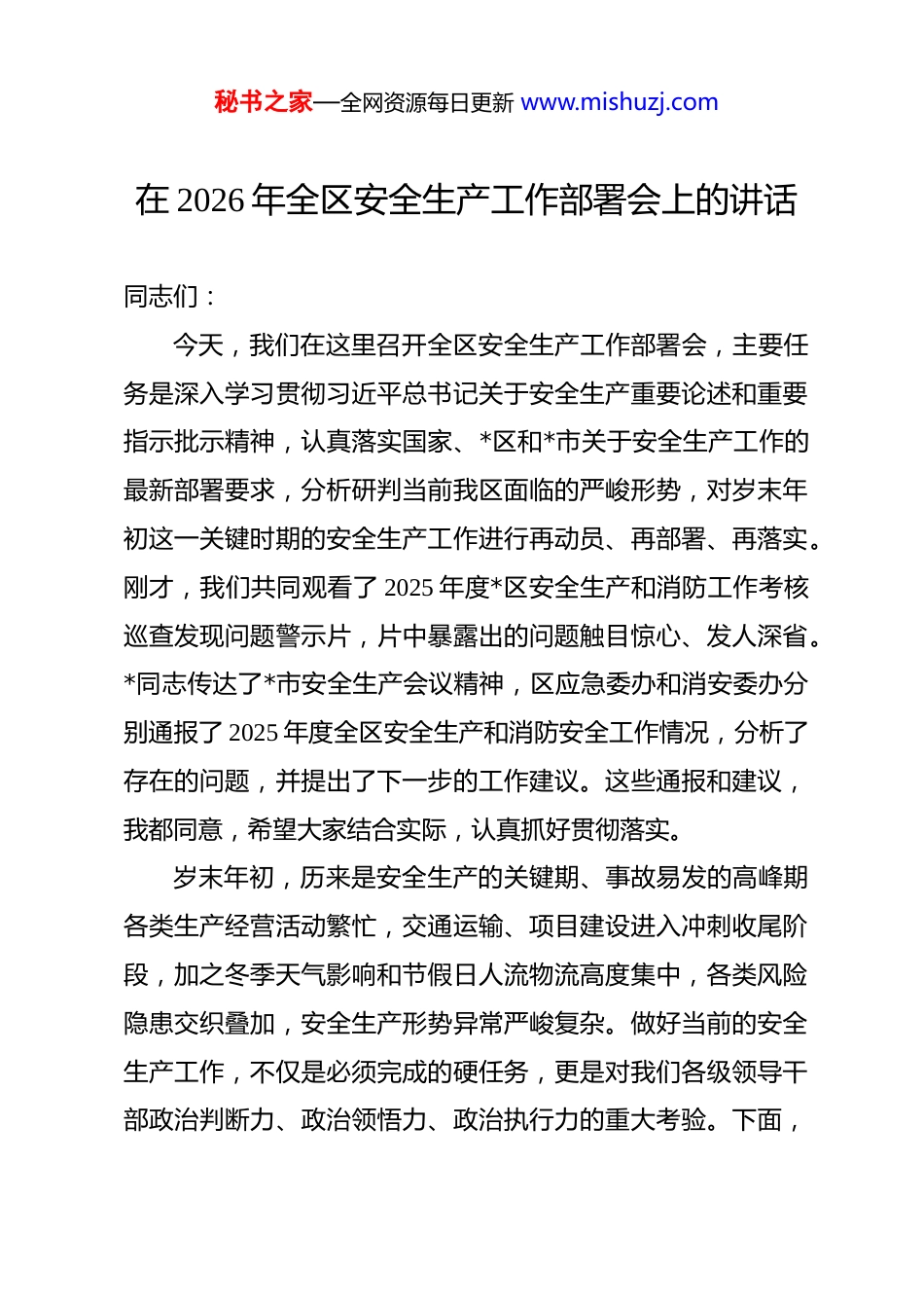 秘书之家—全网资源每日更新 www.mishuzj.com在 2026 年全区安全生产工作部署会上的讲话 同志们:今天,我们在这里召开全区安全生产工作部署会,主要任务是深入学习贯彻习近平总书记关于安全生产重要论述和重要指示批示精神,认真落实国家、*区和*市关于安全生产工作的最新部署要求,分析研判当前我区面临的严峻形势,对岁末年初这一关键时期的安全生产工作进行再动员、再部署、再落实。刚才,我们共同观看了 2025 年度*区安全生产和消防工作考核巡查发现问题警示片,片中暴露出的问题触目惊心、发人深省。*同志传达了*市安全生产会议精神,区应急委办和消安委办分别通报了 2025 年度全区安全生产和消防安全工作情况,分析了存在的问题,并提出了下一步的工作建议。这些通报和建议,我都同意,希望大家结合实际,认真抓好贯彻落实。岁末年初,历来是安全生产的关键期、事故易发的高峰期各类生产经营活动繁忙,交通运输、项目建设进入冲刺收尾阶段,加之冬季天气影响和节假日人流物流高度集中,各类风险隐患交织叠加,安全生产形势异常严峻复杂。做好当前的安全生产工作,不仅是必须完成的硬任务,更是对我们各级领导干部政治判断力、政治领悟力、政治执行力的重大考验。下面,秘书之家—全网资源每日更新 www.mishuzj.com我讲三点意见。一、提高政治站位,绷紧思想之弦,以“时时放心不下”的责任感深刻认识当前安全生产工作的极端重要性今年以来,在全区上下的共同努力下,我区安全生产形势总体保持平稳可控,没有发生重特大生产安全事故,为全区经济社会高质量发展提供了坚实的安全保障。这些成绩的取得,是全区各级各部门和广大干部职工辛勤付出的结果。在此,我代表区委、区政府,向奋战在安全生产一线的同志们表示衷心的感谢和诚挚的慰问!但是,我们必须清醒地看到,成绩属于过去,风险就在眼前。当前我区安全生产领域暴露出的问题依然不容忽视,安全生产基础仍然薄弱,稳定向好的态势尚不牢固。从刚才的警示片和工作通报中可以看出,一些地方和单位还存在着思想麻痹、责任虚化、监管不力、整改不实等突出问题。今年 1 至 11 月,我区共发生各类生产安全事故*起,死亡*人,虽然数据同比有所下降,但任何一个冰冷的数字背后,都是一个鲜活生命的逝去、一个幸福家庭的破碎,都给我们敲响了振聋发聩的警钟。这些事故的发生,深刻暴露出我们的工作中仍然存在短板和漏洞,充分说明了安全生产这根弦,任何时候都不能松;安全生产的红线,任何时候都不能碰;安全生产的责任,任何时候都秘书之家—全网资源每日更新 www.mishuzj.com不能推。全区各级各部门必须深刻认识到,抓安全生产就是抓发展、抓民生、抓稳定。安全是发展的前提,没有安全,一切发展都无从谈起。一个地方如果安全事故频发,不仅会严重影响人民群众的生命财产安全,更会严重损害党委、政府的公信力,破坏来之不易易的良好发展环境。我们必须坚决克服麻痹思想和侥幸心理,不能有“年关已近、歇歇脚”的懈怠,更不能有“事故不会发生在我这里”的幻想。要深刻汲取区内外各类事故的惨痛教训,真正把别人的事故当成自己的事故来对待,把隐患当成事故来处理,以对党和人民高度负责的精神,切实增强“时时放心不下”的责任感和紧迫感,以“人民至上、生命至上”的高度自觉,坚决扛起防范化解重大安全风险的政治责任,把安全生产工作抓得紧而又紧、实而又实。二、聚焦重点领域,采取超常举措,以“钉钉子”的精神全面打赢岁末年初安全防范攻坚战岁末年初历来是安全生产的“大考”期。面对严峻复杂的形势,我们必须坚持问题导向、目标导向、结果导向,紧盯重点行业领域和薄弱环节,采取更有力、更精准、更管用的措施,开展系统性、地毯式的风险隐患排查整治,确保不留死角、不留盲区,坚决防范遏制重特大事故发生。(一)要坚决守住渔港渔船和城市危房安全“生命线”。秘书之家—全网资源每日更新 www.mishuzj.com这两项工作直接关乎人民群众的生命安全,是天大的事,必须作为重中之重来抓。今天会前,我专门到*作业区和*内港进行了实地督导检查,发现仍有部分渔船存在安全设施配备不齐、救生设备老化等问题...