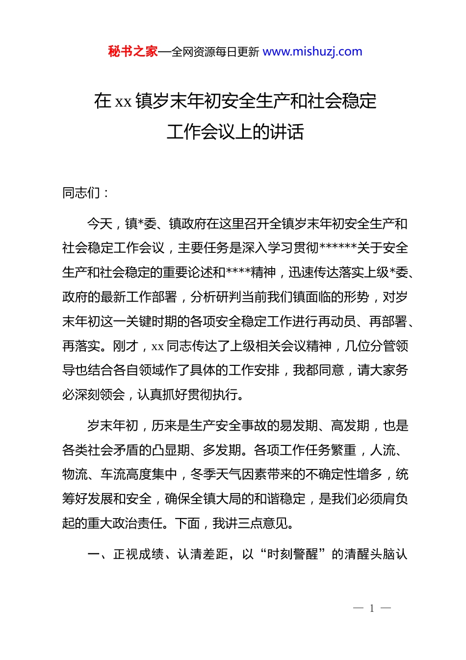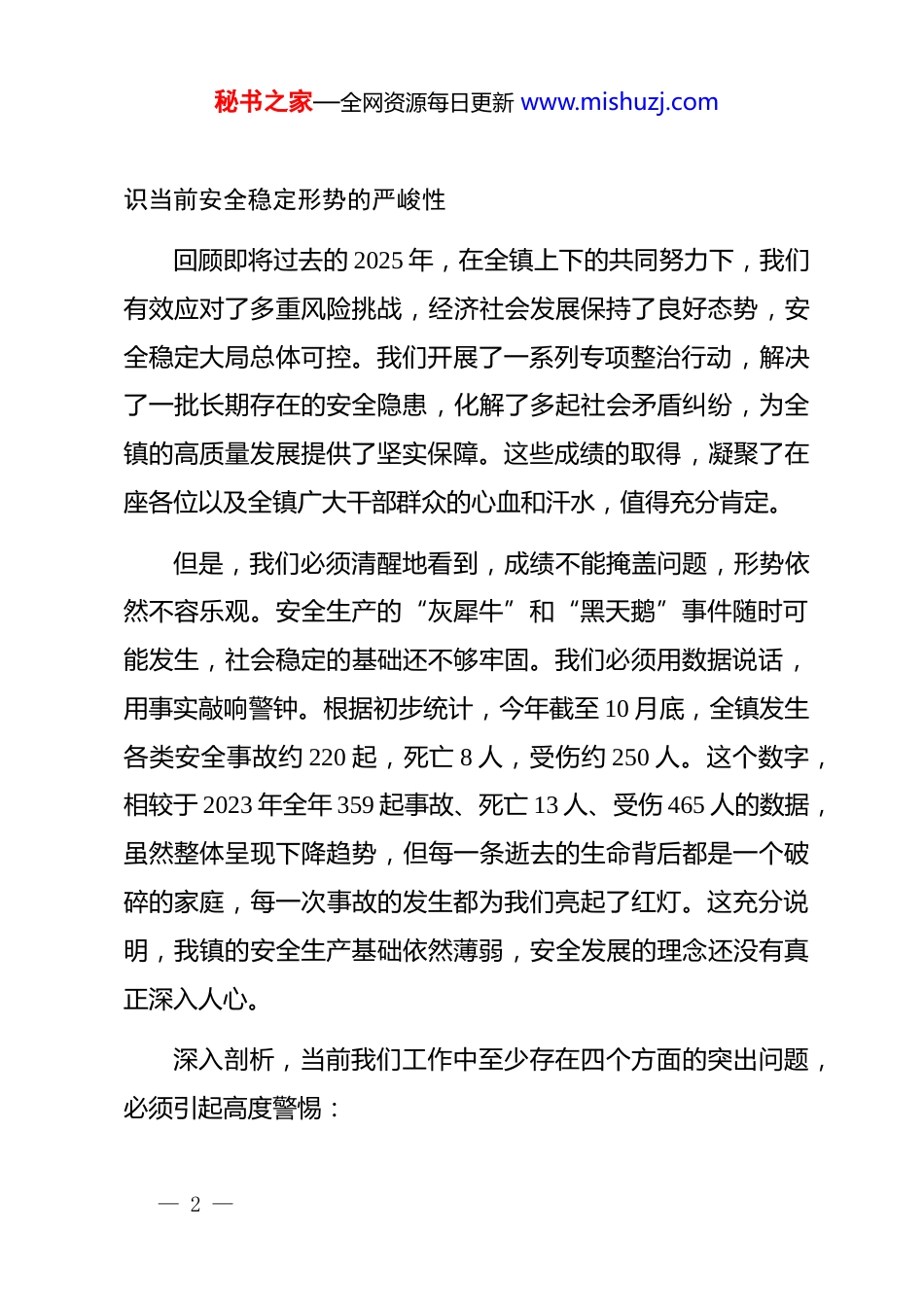 秘书之家—全网资源每日更新 www.mishuzj.com在 xx 镇岁末年初安全生产和社会稳定工作会议上的讲话同志们:今天,镇*委、镇政府在这里召开全镇岁末年初安全生产和社会稳定工作会议,主要任务是深入学习贯彻******关于安全生产和社会稳定的重要论述和****精神,迅速传达落实上级*委、政府的最新工作部署,分析研判当前我们镇面临的形势,对岁末年初这一关键时期的各项安全稳定工作进行再动员、再部署、再落实。刚才,xx 同志传达了上级相关会议精神,几位分管领导也结合各自领域作了具体的工作安排,我都同意,请大家务必深刻领会,认真抓好贯彻执行。岁末年初,历来是生产安全事故的易发期、高发期,也是各类社会矛盾的凸显期、多发期。各项工作任务繁重,人流、物流、车流高度集中,冬季天气因素带来的不确定性增多,统筹好发展和安全,确保全镇大局的和谐稳定,是我们必须肩负起的重大政治责任。下面,我讲三点意见。一、正视成绩、认清差距,以“时刻警醒”的清醒头脑认— 1 —秘书之家—全网资源每日更新 www.mishuzj.com识当前安全稳定形势的严峻性回顾即将过去的 2025 年,在全镇上下的共同努力下,我们有效应对了多重风险挑战,经济社会发展保持了良好态势,安全稳定大局总体可控。我们开展了一系列专项整治行动,解决了一批长期存在的安全隐患,化解了多起社会矛盾纠纷,为全镇的高质量发展提供了坚实保障。这些成绩的取得,凝聚了在座各位以及全镇广大干部群众的心血和汗水,值得充分肯定。但是,我们必须清醒地看到,成绩不能掩盖问题,形势依然不容乐观。安全生产的“灰犀牛”和“黑天鹅”事件随时可能发生,社会稳定的基础还不够牢固。我们必须用数据说话,用事实敲响警钟。根据初步统计,今年截至 10 月底,全镇发生各类安全事故约 220 起,死亡 8 人,受伤约 250 人。这个数字,相较于 2023 年全年 359 起事故、死亡 13 人、受伤 465 人的数据,虽然整体呈现下降趋势,但每一条逝去的生命背后都是一个破碎的家庭,每一次事故的发生都为我们亮起了红灯。这充分说明,我镇的安全生产基础依然薄弱,安全发展的理念还没有真正深入人心。深入剖析,当前我们工作中至少存在四个方面的突出问题,必须引起高度警惕:— 2 —秘书之家—全网资源每日更新 www.mishuzj.com第一,思想认识上存在“疲劳症”。随着年关将至,部分干部、部分企业负责人产生了松口气、歇歇脚的麻痹思想。认为忙碌了一年,安全生产工作可以暂告一段落,存在“年终收官”心态,对潜在的风险视而不见、对排查出的隐患整改不力,这种思想上的“软懈怠”是安全生产的最大敌人。第二,责任落实上存在“真空带”。尽管我们反复强调“*政同责、一岗双责、齐抓共管、失职追责”,但在实际操作中,一些单位和部门之间仍然存在责任边界不清、推诿扯皮的现象。特别是在一些交叉领域和新兴业态的监管上,还存在盲区和漏洞。一些企业主体责任悬空,安全投入不足,安全培训走过场,把“要我安全”当成负担,而不是“我要安全”的自觉行动。第三,隐患整治上存在“薄弱点”。从日常检查和事故分析来看,一些老问题屡禁不止,一些新问题不断涌现。例如,建筑施工领域,大型工地的安全管理相对规范,但小微工程、零星作业的监管往往成为短板;消防安全领域,厂房仓库、物流园区、“三合一”场所的老大难问题依然突出,特别是企业冷库等特殊场所的消防安全风险管控亟待加强;居民生活领域,电动自行车违规停放充电、高层住宅消防通道堵塞等问题,我们天天讲、月月查,但回潮反弹现象依然严重。这说明我们的— 3 —秘书之家—全网资源每日更新 www.mishuzj.com排查整治还不够深入、不够彻底,没有真正做到“见底清零”。第四,风险防范上存在“新变数”。当前,经济下行压力依然存在,一些企业生产经营困难,容易在安全投入上“打折扣”。同时,随着年关临近,劳资纠纷、薪资拖欠等问题进入高发期,处理不当极易引发群体性事件,成为影响社会稳定的重要风险点。我们必须认识到,安全生产和社会稳定是一个有机整体,任何一方面出问题,都会对全局造成冲击。同志们,问题是时代的声音,也是...