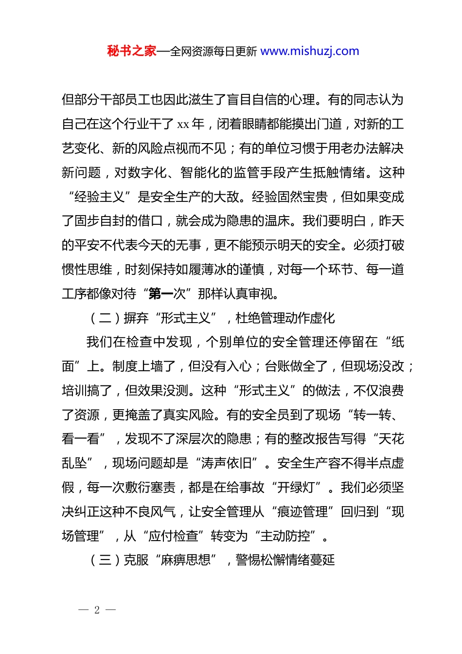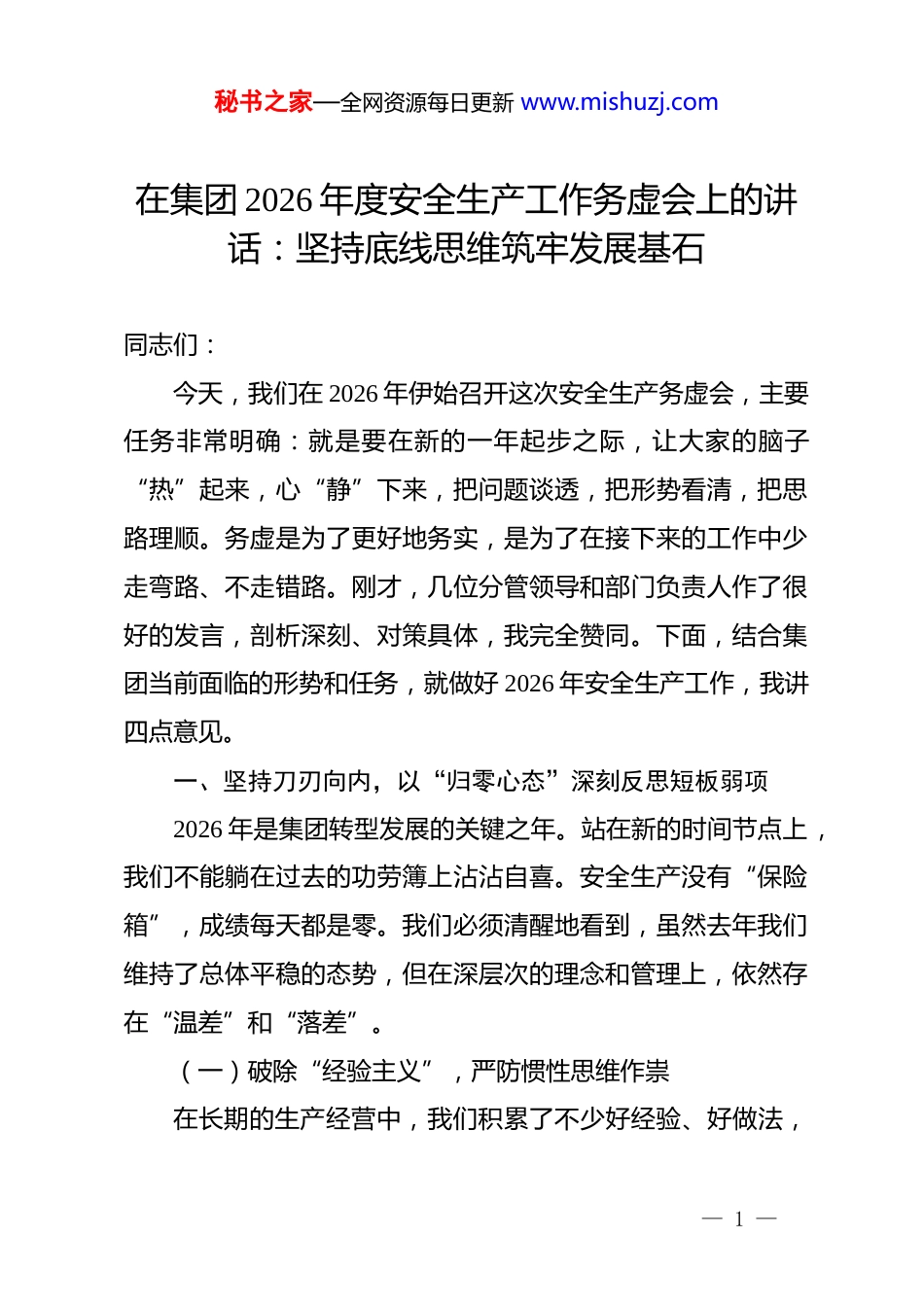 秘书之家—全网资源每日更新 www.mishuzj.com在集团 2026 年度安全生产工作务虚会上的讲话:坚持底线思维筑牢发展基石同志们:今天,我们在 2026 年伊始召开这次安全生产务虚会,主要任务非常明确:就是要在新的一年起步之际,让大家的脑子“热”起来,心“静”下来,把问题谈透,把形势看清,把思路理顺。务虚是为了更好地务实,是为了在接下来的工作中少走弯路、不走错路。刚才,几位分管领导和部门负责人作了很好的发言,剖析深刻、对策具体,我完全赞同。下面,结合集团当前面临的形势和任务,就做好 2026 年安全生产工作,我讲四点意见。一、坚持刀刃向内,以“归零心态”深刻反思短板弱项2026 年是集团转型发展的关键之年。站在新的时间节点上,我们不能躺在过去的功劳簿上沾沾自喜。安全生产没有“保险箱”,成绩每天都是零。我们必须清醒地看到,虽然去年我们维持了总体平稳的态势,但在深层次的理念和管理上,依然存在“温差”和“落差”。(一)破除“经验主义”,严防惯性思维作祟在长期的生产经营中,我们积累了不少好经验、好做法,— 1 —秘书之家—全网资源每日更新 www.mishuzj.com但部分干部员工也因此滋生了盲目自信的心理。有的同志认为自己在这个行业干了 xx 年,闭着眼睛都能摸出门道,对新的工艺变化、新的风险点视而不见;有的单位习惯于用老办法解决新问题,对数字化、智能化的监管手段产生抵触情绪。这种“经验主义”是安全生产的大敌。经验固然宝贵,但如果变成了固步自封的借口,就会成为隐患的温床。我们要明白,昨天的平安不代表今天的无事,更不能预示明天的安全。必须打破惯性思维,时刻保持如履薄冰的谨慎,对每一个环节、每一道工序都像对待“第一次”那样认真审视。(二)摒弃“形式主义”,杜绝管理动作虚化我们在检查中发现,个别单位的安全管理还停留在“纸面”上。制度上墙了,但没有入心;台账做全了,但现场没改;培训搞了,但效果没测。这种“形式主义”的做法,不仅浪费了资源,更掩盖了真实风险。有的安全员到了现场“转一转、看一看”,发现不了深层次的隐患;有的整改报告写得“天花乱坠”,现场问题却是“涛声依旧”。安全生产容不得半点虚假,每一次敷衍塞责,都是在给事故“开绿灯”。我们必须坚决纠正这种不良风气,让安全管理从“痕迹管理”回归到“现场管理”,从“应付检查”转变为“主动防控”。(三)克服“麻痹思想”,警惕松懈情绪蔓延— 2 —秘书之家—全网资源每日更新 www.mishuzj.com随着安全形势的总体平稳,部分单位出现了“歇歇脚、松口气”的苗头。有的领导干部口头上喊安全第一,遇到生产进度压力时,往往把安全往后放;有的基层员工在长期重复作业中产生了厌战情绪,操作规程执行打折扣,劳保用品佩戴不规范。这种“麻痹思想”就像温水煮青蛙,等到发现问题时往往为时已晚。我们要深刻认识到,安全生产是一场持久战,越是风平浪静的时候,越要警惕暗流涌动。任何时候都不能有丝毫松懈,必须始终紧绷安全这根弦,做到警钟长鸣、常抓不懈。二、研判时势变化,以“忧患意识”精准洞察风险挑战2026 年,宏观环境、行业标准和内部条件都在发生深刻变化。我们必须登高望远,准确识变、科学应变,在不确定性中寻找确定性,牢牢掌握安全生产的主动权。(一)紧盯“外部监管”之严,适应法治高压态势当前,国家对安全生产的监管力度空前加大,法律法规日益完善,执法检查更加严格。从刑法修正案对安全生产犯罪的严厉打击,到重大事故隐患判定标准的不断细化,都在释放一个强烈信号:安全生产是不可触碰的红线。如果我们还抱有侥幸心理,试图通过“打擦边球”、“搞变通”来蒙混过关,最终不仅会给企业带来巨额罚款和停产整顿的风险,相关责任人还将面临法律的严惩。我们必须主动适应这种高压态势,把学— 3 —秘书之家—全网资源每日更新 www.mishuzj.com法、懂法、守法作为必修课,确保企业经营行为始终在法治轨道上运行。(二)正视“设备设施”之老,化解存量风险隐患集团部分生产基地建设时间较早,随着时间的推移,一些设备设施进入了“老龄化”阶段。管道腐蚀、线路老化、设备带病运行等问题...