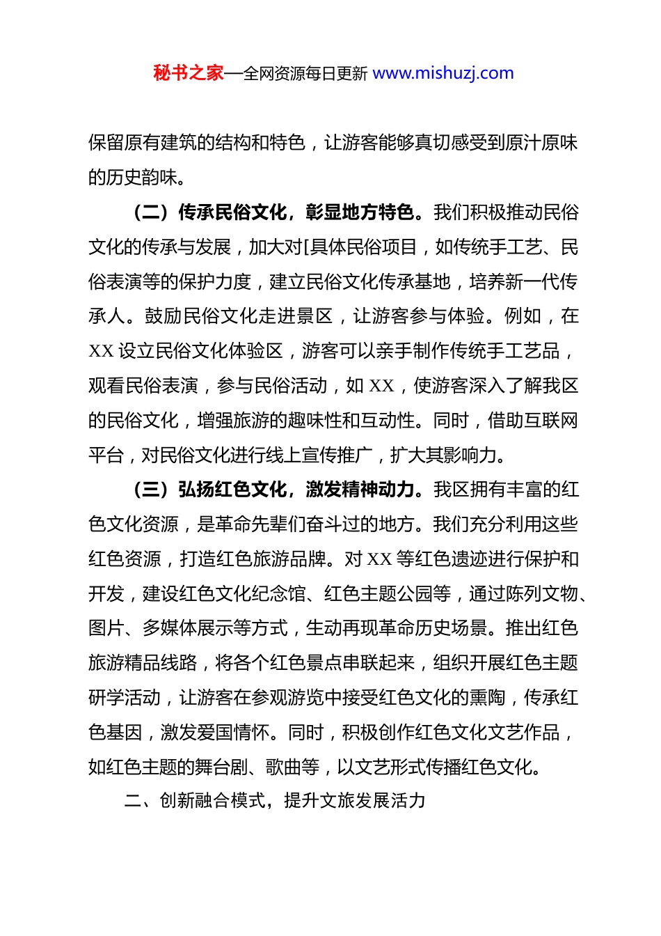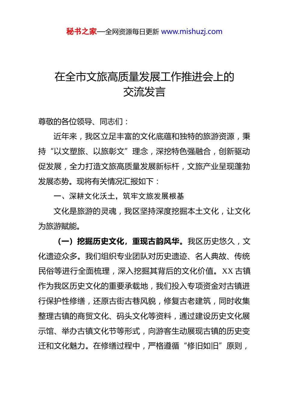 秘书之家—全网资源每日更新 www.mishuzj.com在全市文旅高质量发展工作推进会上的交流发言尊敬的各位领导、同志们:近年来,我区立足丰富的文化底蕴和独特的旅游资源,秉持“以文塑旅、以旅彰文”理念,深挖特色强融合,创新驱动促发展,全力打造文旅高质量发展新标杆,文旅产业呈现蓬勃发展态势。现将有关情况汇报如下:一、深耕文化沃土,筑牢文旅发展根基文化是旅游的灵魂,我区坚持深度挖掘本土文化,让文化为旅游赋能。(一)挖掘历史文化,重现古韵风华。我区历史悠久,文化遗迹众多。我们组织专业团队对历史遗迹、名人典故、传统民俗等进行全面梳理,深入挖掘其背后的文化价值。XX 古镇作为我区历史文化的重要承载地,我们投入专项资金对古镇进行保护性修缮,还原古街古巷风貌,修复古老建筑,同时收集整理古镇的商贸文化、码头文化等资料,通过建设历史文化展示馆、举办古镇文化节等形式,向游客生动展现古镇的历史变迁和文化魅力。在修缮过程中,严格遵循“修旧如旧”原则,秘书之家—全网资源每日更新 www.mishuzj.com保留原有建筑的结构和特色,让游客能够真切感受到原汁原味的历史韵味。(二)传承民俗文化,彰显地方特色。我们积极推动民俗文化的传承与发展,加大对[具体民俗项目,如传统手工艺、民俗表演等的保护力度,建立民俗文化传承基地,培养新一代传承人。鼓励民俗文化走进景区,让游客参与体验。例如,在XX 设立民俗文化体验区,游客可以亲手制作传统手工艺品,观看民俗表演,参与民俗活动,如 XX,使游客深入了解我区的民俗文化,增强旅游的趣味性和互动性。同时,借助互联网平台,对民俗文化进行线上宣传推广,扩大其影响力。(三)弘扬红色文化,激发精神动力。我区拥有丰富的红色文化资源,是革命先辈们奋斗过的地方。我们充分利用这些红色资源,打造红色旅游品牌。对 XX 等红色遗迹进行保护和开发,建设红色文化纪念馆、红色主题公园等,通过陈列文物、图片、多媒体展示等方式,生动再现革命历史场景。推出红色旅游精品线路,将各个红色景点串联起来,组织开展红色主题研学活动,让游客在参观游览中接受红色文化的熏陶,传承红色基因,激发爱国情怀。同时,积极创作红色文化文艺作品,如红色主题的舞台剧、歌曲等,以文艺形式传播红色文化。二、创新融合模式,提升文旅发展活力秘书之家—全网资源每日更新 www.mishuzj.com创新是文旅发展的动力源泉,我区积极探索文旅融合新模式,推动文旅产业高质量发展。(一)“文旅+科技”,打造智慧文旅新体验。充分利用现代科技手段,为游客提供便捷、高效、个性化的旅游服务。在景区建设智慧旅游系统,实现线上购票、智能导览、语音讲解、实时监控等功能。游客通过手机 APP 即可获取景区的详细信息,规划游览路线,了解景点背后的故事。例如,XX 引入虚拟现实(VR)、增强现实(AR)技术,打造沉浸式旅游体验项目,让游客仿佛穿越时空,身临其境感受历史文化的魅力。利用大数据分析游客的行为习惯和需求,为旅游企业提供精准的市场信息,助力企业优化产品和服务,实现精准营销。同时,积极推进 5G 网络在景区的覆盖,提升游客的网络体验。(二)“文旅+农业”,拓展乡村旅游新空间。我们将文旅与农业深度融合,大力发展乡村旅游。引导农民利用自家农舍、农田等资源,开发农家乐、民宿、采摘园、农事体验园等乡村旅游项目。打造乡村旅游示范村,完善基础设施建设,提升乡村旅游的品质和服务水平。例如,XX 依托当地特色农产品 XX,举办采摘节、农产品展销会等活动,吸引游客前来体验乡村生活,品尝农家美食,购买特色农产品。同时,将农业生产过程与旅游体验相结合,开发农耕文化体验项目,让游客秘书之家—全网资源每日更新 www.mishuzj.com了解农业生产知识,感受劳动的乐趣。通过文旅与农业的融合,不仅带动了农民增收致富,还促进了乡村的振兴发展。(三)“文旅+体育”,培育文旅消费新热点。体育与旅游的融合具有巨大的发展潜力。我区充分利用自然山水资源和体育设施,举办各类体育赛事和活动,吸引体育爱好者和游客前来参与。例如,在 XX 举办山地自行车赛、徒步越野赛等户外运动赛事,...