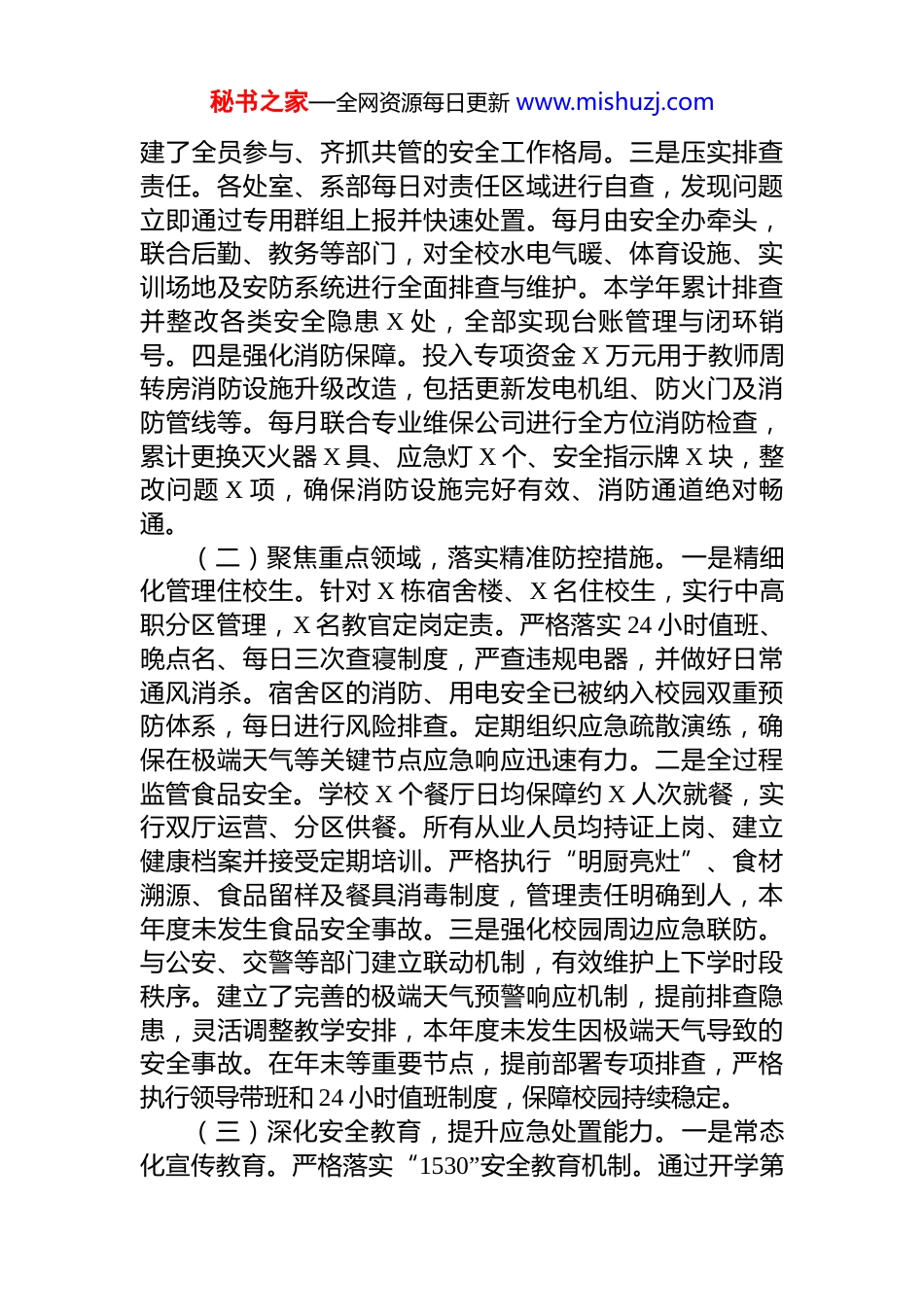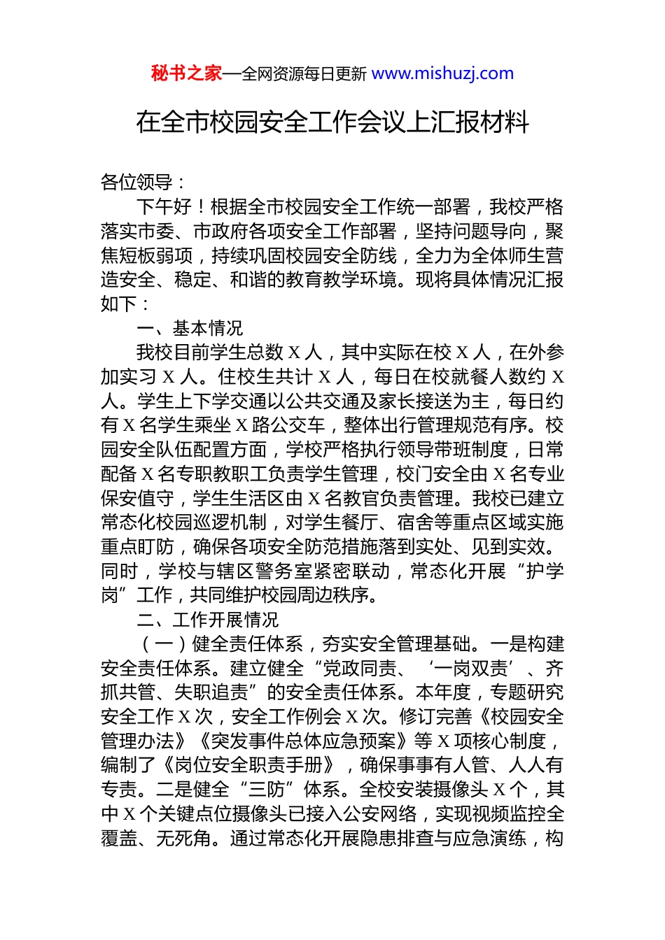 秘书之家—全网资源每日更新 www.mishuzj.com在全市校园安全工作会议上汇报材料各位领导:下午好!根据全市校园安全工作统一部署,我校严格落实市委、市政府各项安全工作部署,坚持问题导向,聚焦短板弱项,持续巩固校园安全防线,全力为全体师生营造安全、稳定、和谐的教育教学环境。现将具体情况汇报如下:一、基本情况我校目前学生总数 X 人,其中实际在校 X 人,在外参加实习 X 人。住校生共计 X 人,每日在校就餐人数约 X人。学生上下学交通以公共交通及家长接送为主,每日约有 X 名学生乘坐 X 路公交车,整体出行管理规范有序。校园安全队伍配置方面,学校严格执行领导带班制度,日常配备 X 名专职教职工负责学生管理,校门安全由 X 名专业保安值守,学生生活区由 X 名教官负责管理。我校已建立常态化校园巡逻机制,对学生餐厅、宿舍等重点区域实施重点盯防,确保各项安全防范措施落到实处、见到实效。同时,学校与辖区警务室紧密联动,常态化开展“护学岗”工作,共同维护校园周边秩序。二、工作开展情况(一)健全责任体系,夯实安全管理基础。一是构建安全责任体系。建立健全“党政同责、‘一岗双责’、齐抓共管、失职追责”的安全责任体系。本年度,专题研究安全工作 X 次,安全工作例会 X 次。修订完善《校园安全管理办法》《突发事件总体应急预案》等 X 项核心制度,编制了《岗位安全职责手册》,确保事事有人管、人人有专责。二是健全“三防”体系。全校安装摄像头 X 个,其中 X 个关键点位摄像头已接入公安网络,实现视频监控全覆盖、无死角。通过常态化开展隐患排查与应急演练,构秘书之家—全网资源每日更新 www.mishuzj.com建了全员参与、齐抓共管的安全工作格局。三是压实排查责任。各处室、系部每日对责任区域进行自查,发现问题立即通过专用群组上报并快速处置。每月由安全办牵头,联合后勤、教务等部门,对全校水电气暖、体育设施、实训场地及安防系统进行全面排查与维护。本学年累计排查并整改各类安全隐患 X 处,全部实现台账管理与闭环销号。四是强化消防保障。投入专项资金 X 万元用于教师周转房消防设施升级改造,包括更新发电机组、防火门及消防管线等。每月联合专业维保公司进行全方位消防检查,累计更换灭火器 X 具、应急灯 X 个、安全指示牌 X 块,整改问题 X 项,确保消防设施完好有效、消防通道绝对畅通。(二)聚焦重点领域,落实精准防控措施。一是精细化管理住校生。针对 X 栋宿舍楼、X 名住校生,实行中高职分区管理,X 名教官定岗定责。严格落实 24 小时值班、晚点名、每日三次查寝制度,严查违规电器,并做好日常通风消杀。宿舍区的消防、用电安全已被纳入校园双重预防体系,每日进行风险排查。定期组织应急疏散演练,确保在极端天气等关键节点应急响应迅速有力。二是全过程监管食品安全。学校 X 个餐厅日均保障约 X 人次就餐,实行双厅运营、分区供餐。所有从业人员均持证上岗、建立健康档案并接受定期培训。严格执行“明厨亮灶”、食材溯源、食品留样及餐具消毒制度,管理责任明确到人,本年度未发生食品安全事故。三是强化校园周边应急联防。与公安、交警等部门建立联动机制,有效维护上下学时段秩序。建立了完善的极端天气预警响应机制,提前排查隐患,灵活调整教学安排,本年度未发生因极端天气导致的安全事故。在年末等重要节点,提前部署专项排查,严格执行领导带班和 24 小时值班制度,保障校园持续稳定。(三)深化安全教育,提升应急处置能力。一是常态化宣传教育。严格落实“1530”安全教育机制。通过开学第秘书之家—全网资源每日更新 www.mishuzj.com一课、主题班会、国旗下讲话、宣传栏、电子屏及家长群等多种形式,持续开展防诈骗、防欺凌、防灾减灾、交通安全等专题教育。本学年累计组织面向全体教职工的专题培训 X 余次。二是实战化应急演练。本学期按计划开展各类应急演练 X 次,涵盖消防、防灾、防踩踏等重点场景,部分演练在公安部门指导下进行,师生参与率达 X%,应急处置的实战能力得到显著提升。(四)关注特殊群体,细化学生服务管理。现有中高职相...