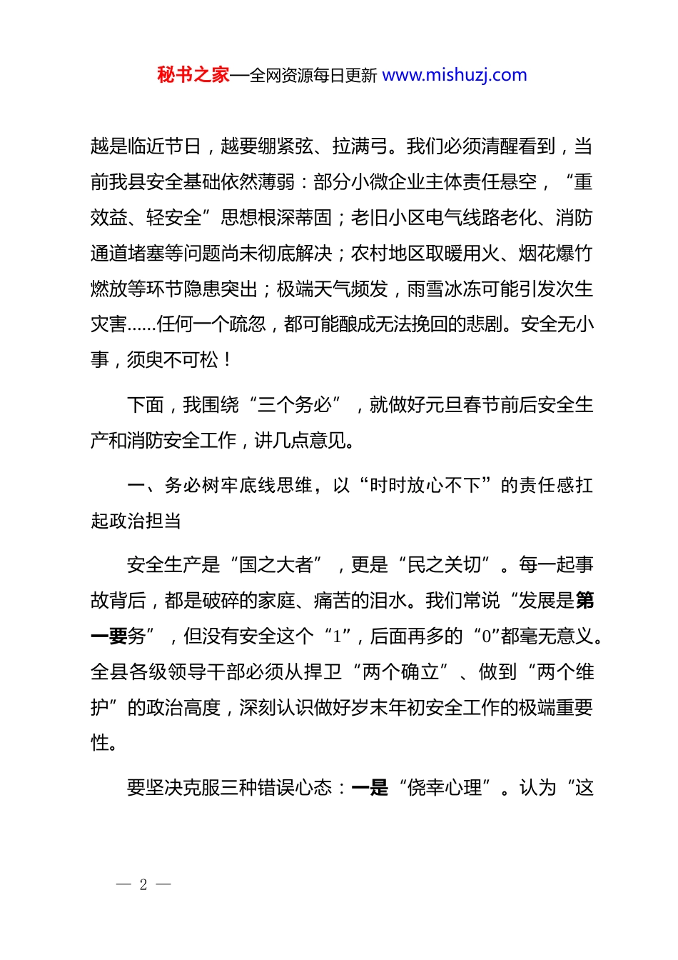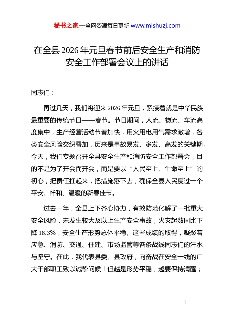 秘书之家—全网资源每日更新 www.mishuzj.com在全县 2026 年元旦春节前后安全生产和消防安全工作部署会议上的讲话同志们:再过几天,我们将迎来 2026 年元旦,紧接着就是中华民族最重要的传统节日——春节。节日期间,人流、物流、车流高度集中,生产经营活动节奏加快,用火用电用气需求激增,各类安全风险交织叠加,历来是事故易发、多发、高发的关键期。今天,我们专题召开全县安全生产和消防安全工作部署会,目的不是为了开会而开会,而是要以“人民至上、生命至上”的初心,把责任扛起来,把措施落下去,确保全县人民度过一个平安、祥和、温暖的新春佳节。过去一年,全县上下齐心协力,有效防范化解了一批重大安全风险,未发生较大及以上生产安全事故,火灾起数同比下降 18.3%,安全生产形势总体平稳。这些成绩的取得,凝聚着应急、消防、交通、住建、市场监管等各条战线同志们的汗水与坚守。在此,我代表县委、县政府,向奋战在安全一线的广大干部职工致以诚挚问候!但越是形势平稳,越要保持清醒;— 1 —秘书之家—全网资源每日更新 www.mishuzj.com越是临近节日,越要绷紧弦、拉满弓。我们必须清醒看到,当前我县安全基础依然薄弱:部分小微企业主体责任悬空,“重效益、轻安全”思想根深蒂固;老旧小区电气线路老化、消防通道堵塞等问题尚未彻底解决;农村地区取暖用火、烟花爆竹燃放等环节隐患突出;极端天气频发,雨雪冰冻可能引发次生灾害……任何一个疏忽,都可能酿成无法挽回的悲剧。安全无小事,须臾不可松!下面,我围绕“三个务必”,就做好元旦春节前后安全生产和消防安全工作,讲几点意见。一、务必树牢底线思维,以“时时放心不下”的责任感扛起政治担当安全生产是“国之大者”,更是“民之关切”。每一起事故背后,都是破碎的家庭、痛苦的泪水。我们常说“发展是第一要务”,但没有安全这个“1”,后面再多的“0”都毫无意义。全县各级领导干部必须从捍卫“两个确立”、做到“两个维护”的政治高度,深刻认识做好岁末年初安全工作的极端重要性。要坚决克服三种错误心态:一是“侥幸心理”。认为“这— 2 —秘书之家—全网资源每日更新 www.mishuzj.com么多年都没出事,今年也不会出”,对隐患视而不见;二是“厌战情绪”。觉得“年年讲安全、月月查隐患”,产生麻痹思想;三是“甩手掌柜”倾向。把安全责任简单压给下级,自己当“二传手”。同志们,群众把身家性命托付给我们,我们就要以父母之心、兄弟之情去守护。特别是各乡镇(街道)*政主要负责同志、各部门“一把手”,必须亲自部署、亲自检查、亲自督办,真正做到守土有责、守土负责、守土尽责。二、务必聚焦重点领域,以“事事落实到位”的硬举措筑牢安全堤坝安全工作贵在精准、重在闭环。要盯紧看牢重点行业、重点场所、重点环节,打出“排查+整治+宣传”组合拳。一是狠抓消防安全“生命通道”畅通。近期省内外多起亡人火灾暴露出消防通道被占、疏散楼梯堆物等致命问题。即日起,由消防救援大队牵头,联合公安、住建、城管等部门,在全县开展为期一个月的“畅通生命通道”专项整治。对住宅小区、商场市场、养老机构、学校医院等人员密集场所,全面清理楼道杂物、拆除违规防盗窗、整治车辆乱停乱放。对拒不整改的,依法强制执行并公开曝光。同时,要加快老旧小区消防设施改造,在 2026 年一季度前完成 15 个小区微型消防站建设。— 3 —秘书之家—全网资源每日更新 www.mishuzj.com二是严管交通运输“流动风险”。春运即将启动,预计我县道路客运量将同比增长 12%。交通、交警部门要强化“两客一危一货”监管,严查超速、超载、疲劳驾驶;加强农村道路临水临崖、急弯陡坡路段巡查,及时设置警示标志;遇雨雪冰冻天气,果断采取限行、封路等措施,宁可十防九空,不可失防万一。特别要规范网约车、顺风车管理,严厉打击非法营运。三是紧盯企业生产“末端落实”。应急管理部门要组织专家力量,对危化品、非煤矿山、工贸企业开展“全覆盖”检查,重点检查员工岗前培训是否到位、特种作业是否持证、应急预案是否演练。对存在重大隐患的企业,一律停产整顿;对“厂中厂”“园中园”等租...
