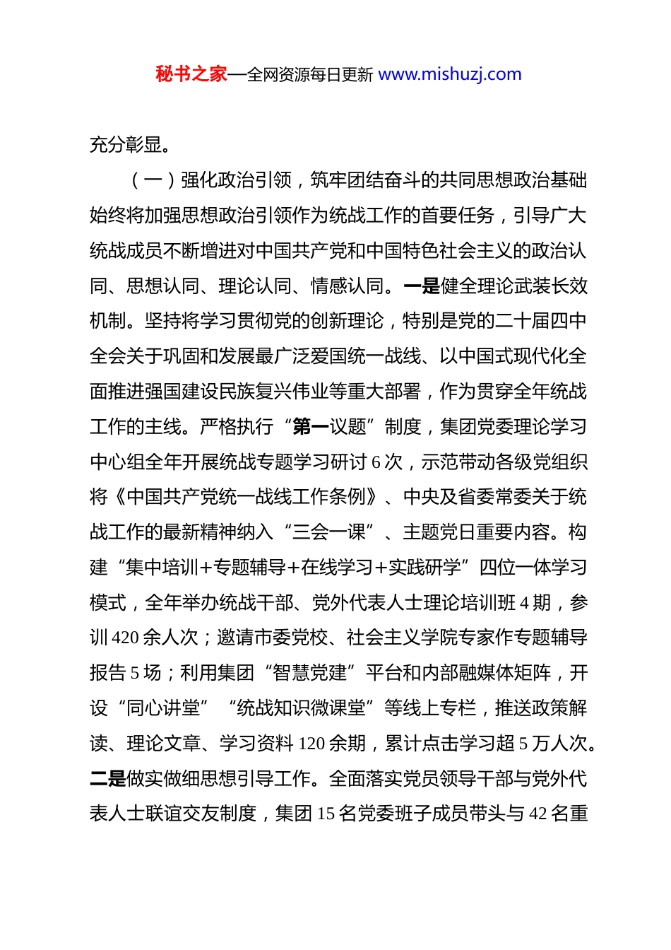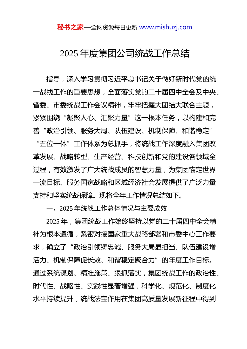 秘书之家—全网资源每日更新 www.mishuzj.com2025 年度集团公司统战工作总结 指导,深入学习贯彻习近平总书记关于做好新时代党的统一战线工作的重要思想,全面落实党的二十届四中全会及中央、省委、市委统战工作会议精神,牢牢把握大团结大联合主题,紧紧围绕“凝聚人心、汇聚力量”这一根本任务,以构建和完善“政治引领、服务大局、队伍建设、机制保障、和谐稳定”“五位一体”工作体系为总抓手,将统战工作深度融入集团改革发展、战略转型、生产经营、科技创新和党的建设各领域全过程,有效激发了广大统战成员的智慧力量,为集团锚定世界一流目标、服务国家战略和区域经济社会发展提供了广泛力量支持和坚实统战保障。现将全年工作情况总结如下。一、2025 年统战工作总体情况与主要成效2025 年,集团统战工作始终坚持以党的二十届四中全会精神为根本遵循,紧密对接国家重大战略部署和市委中心工作要求,确立了“政治引领铸忠诚、服务大局显担当、队伍建设增活力、机制保障促长效、和谐稳定聚合力”的年度工作目标。通过系统谋划、精准施策、狠抓落实,集团统战工作的政治性、时代性、战略性、实践性显著增强,科学化、规范化、制度化水平持续提升,统战法宝作用在集团高质量发展新征程中得到秘书之家—全网资源每日更新 www.mishuzj.com充分彰显。(一)强化政治引领,筑牢团结奋斗的共同思想政治基础始终将加强思想政治引领作为统战工作的首要任务,引导广大统战成员不断增进对中国共产党和中国特色社会主义的政治认同、思想认同、理论认同、情感认同。一是健全理论武装长效机制。坚持将学习贯彻党的创新理论,特别是党的二十届四中全会关于巩固和发展最广泛爱国统一战线、以中国式现代化全面推进强国建设民族复兴伟业等重大部署,作为贯穿全年统战工作的主线。严格执行“第一议题”制度,集团党委理论学习中心组全年开展统战专题学习研讨 6 次,示范带动各级党组织将《中国共产党统一战线工作条例》、中央及省委常委关于统战工作的最新精神纳入“三会一课”、主题党日重要内容。构建“集中培训+专题辅导+在线学习+实践研学”四位一体学习模式,全年举办统战干部、党外代表人士理论培训班 4 期,参训 420 余人次;邀请市委党校、社会主义学院专家作专题辅导报告 5 场;利用集团“智慧党建”平台和内部融媒体矩阵,开设“同心讲堂”“统战知识微课堂”等线上专栏,推送政策解读、理论文章、学习资料 120 余期,累计点击学习超 5 万人次。二是做实做细思想引导工作。全面落实党员领导干部与党外代表人士联谊交友制度,集团 15 名党委班子成员带头与 42 名重秘书之家—全网资源每日更新 www.mishuzj.com点联系的党外知识分子、民主党派成员、无党派人士、归国留学人员、少数民族代表等建立常态化联系,全年开展面对面谈心谈话、走访慰问、情况通报等活动 160 余次,及时掌握思想动态,倾听意见建议,帮助解决实际困难。围绕党的二十届四中全会提出的“深化国有企业改革,提升核心竞争力和增强核心功能”“加快发展新质生产力”等重大议题,组织“同心同行·共谋发展”系列主题座谈会、情况通报会、专题研讨班 8 场,引导统战成员深刻领悟“两个确立”的决定性意义,不断增强“四个意识”、坚定“四个自信”、做到“两个维护”,自觉将思想和行动统一到党中央决策部署和集团党委工作要求上来。三是加强统战政策宣传阐释。深入开展“统战政策宣传月”活动,制作并发放《新时代统战工作应知应会手册》《集团统战成员服务指南》等宣传资料 2000 余册。通过举办政策宣讲会、知识竞赛、主题征文、拍摄微视频等形式,深入基层一线、车间班组、研发中心,广泛宣传党的统一战线理论方针政策,解读集团“十四五”战略规划和中长期发展目标,覆盖职工群众近万人次。在集团官网、内刊、宣传栏及新媒体平台开设“统战之声”“党外人士风采录”等专栏,全年宣传报道统战工作动态、先进经验、典型人物事迹 35 篇,生动展现统战成员立足岗位、建功立业的良好风貌,营造了“了解统战、重视统战、秘书之家—全网资源每日更新 www.mishuzj.com支持统战、参与统战”的...