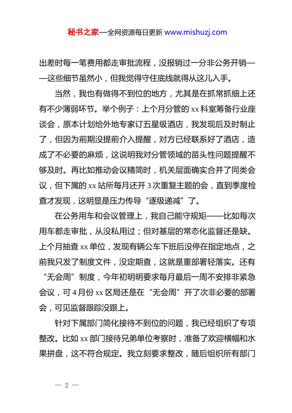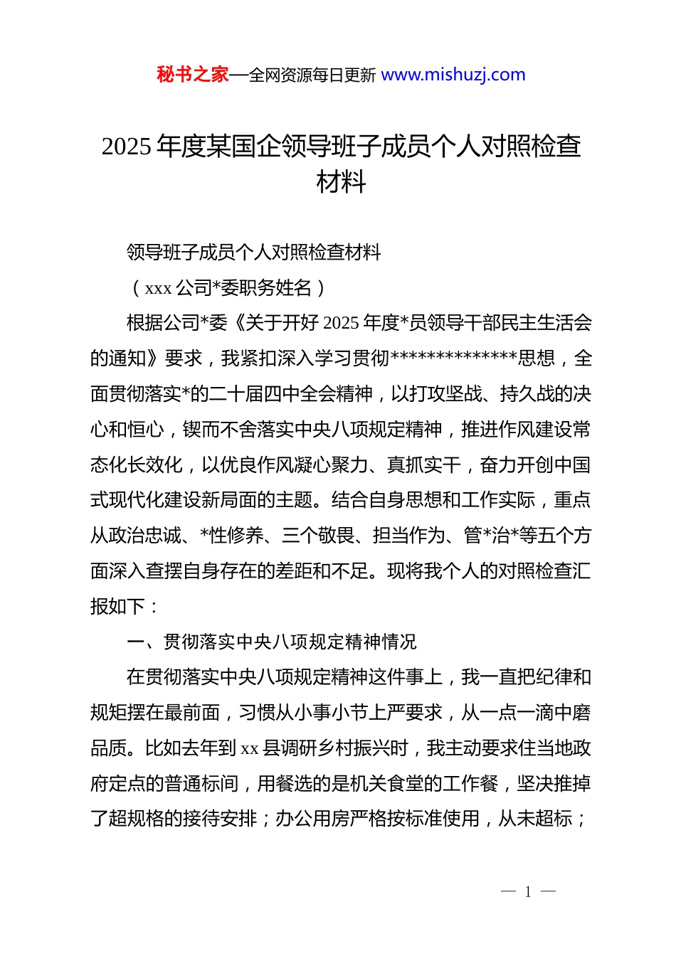 秘书之家—全网资源每日更新 www.mishuzj.com2025 年度某国企领导班子成员个人对照检查材料领导班子成员个人对照检查材料(xxx 公司*委职务姓名)根据公司*委《关于开好 2025 年度*员领导干部民主生活会的通知》要求,我紧扣深入学习贯彻**************思想,全面贯彻落实*的二十届四中全会精神,以打攻坚战、持久战的决心和恒心,锲而不舍落实中央八项规定精神,推进作风建设常态化长效化,以优良作风凝心聚力、真抓实干,奋力开创中国式现代化建设新局面的主题。结合自身思想和工作实际,重点从政治忠诚、*性修养、三个敬畏、担当作为、管*治*等五个方面深入查摆自身存在的差距和不足。现将我个人的对照检查汇报如下:一、贯彻落实中央八项规定精神情况在贯彻落实中央八项规定精神这件事上,我一直把纪律和规矩摆在最前面,习惯从小事小节上严要求,从一点一滴中磨品质。比如去年到 xx 县调研乡村振兴时,我主动要求住当地政府定点的普通标间,用餐选的是机关食堂的工作餐,坚决推掉了超规格的接待安排;办公用房严格按标准使用,从未超标;— 1 —秘书之家—全网资源每日更新 www.mishuzj.com出差时每一笔费用都走审批流程,没报销过一分非公务开销——这些细节虽然小,但我觉得守住底线就得从这儿入手。当然,我也有做得不到位的地方,尤其是在抓常抓细上还有不少薄弱环节。举个例子:上个月分管的 xx 科室筹备行业座谈会,原本计划给外地专家订五星级酒店,我发现后及时制止了,但因为前期没提前介入提醒,对方已经联系好了酒店,造成了不必要的麻烦,这说明我对分管领域的苗头性问题提醒不够及时。再比如推动会议精简时,机关层面确实合并了同类会议,但下属的 xx 站所每月还开 3 次重复主题的会,直到季度检查才发现,这明显是压力传导“逐级递减”了。在公务用车和会议管理上,我自己能守规矩——比如每次用车都走审批,从没私用过;但对基层的常态化监督还是缺。上个月抽查 xx 单位,发现有辆公车下班后没停在指定地点,之前我只发了制度文件,没定期查,这就是重部署轻落实。还有“无会周”制度,今年初明明要求每月最后一周不安排非紧急会议,可 4 月份 xx 区局还是在“无会周”开了次非必要的部署会,可见监督跟踪没跟上。针对下属部门简化接待不到位的问题,我已经组织了专项整改。比如 xx 部门接待兄弟单位考察时,准备了欢迎横幅和水果拼盘,这不符合规定。我立刻要求整改,随后组织所有部门— 2 —秘书之家—全网资源每日更新 www.mishuzj.com重学接待标准,修订了《内部接待细则》,明确禁止摆放鲜花、水果等非必要物品——现在各部门的接待流程都规范多了。今后我会进一步强化担当,以身作则推动作风建设往深里走。比如公务用车要建立每月抽查机制,不仅查机关,还要随机查基层的用车记录;会议管理要加“无会周”周报制度,发现问题立刻通报。针对压力传导问题,每季度我会和分管部门负责人谈一次作风建设,把责任压实到每一层。总之,我会健全定期抽查通报机制,确保八项规定在各层级落地见效,持续巩固公司风清气正的政治生态。二、对照五个方面查摆问题情况(一)在带头强化政治忠诚、提高政治能力反面1.政治理论学习“浅尝辄止”,学用脱节明显去年学习******关于“以人民为中心”的重要论述时,我抄了满满一本笔记,还在支部会上作了发言,但在实际处理 xx街道老旧小区改造问题时,却优先盯着工程进度表,没花时间挨家挨户听居民意见——直到有老人反映改造后的楼道灯亮度不够、台阶太陡,我才意识到自己把“人民至上”当成了口号,没真正落到实处。2.政治执行力存在“温差”,贯彻决策部署打折扣比如今年初*中央要求“加快推进绿色低碳转型”,我负责— 3 —秘书之家—全网资源每日更新 www.mishuzj.com的 xx 工业园区节能改造项目,虽然按要求制定了方案,但推进中怕影响企业生产,就把“每月现场检查”改成了“线上报数据”——结果第三季度园区能耗比预期高了 15%,这就是我在落实*中央决策时,没有“钉钉子”的韧劲,让政策打了折扣。3.政治敏锐性不够强,对意识形态风险预判不足比如上个月处理 xx 单位员工微信...