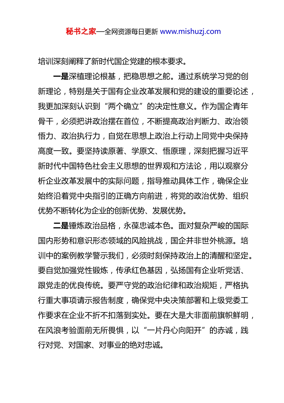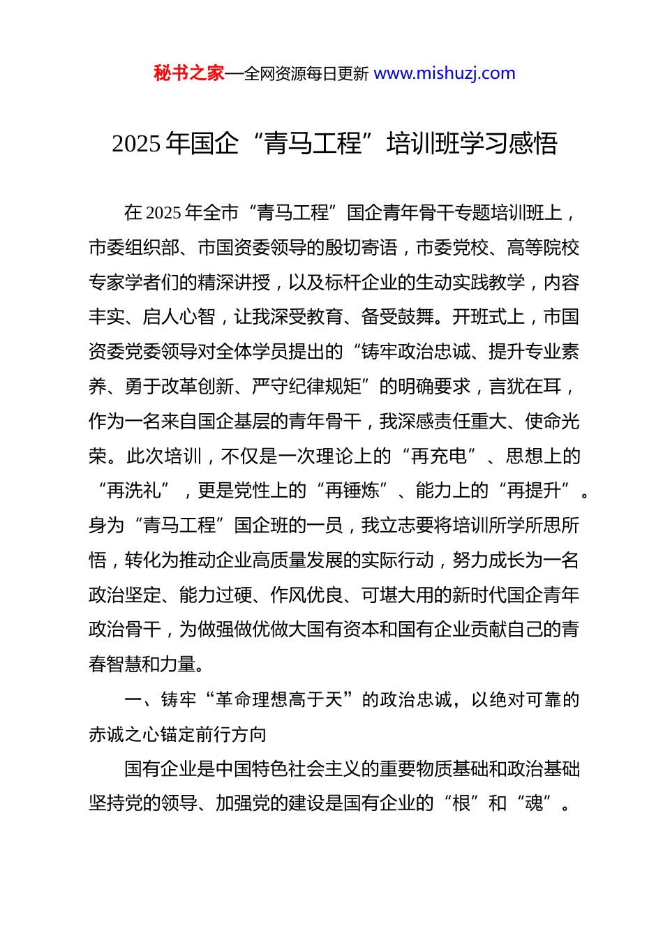 秘书之家—全网资源每日更新 www.mishuzj.com2025 年国企“青马工程”培训班学习感悟 在 2025 年全市“青马工程”国企青年骨干专题培训班上,市委组织部、市国资委领导的殷切寄语,市委党校、高等院校专家学者们的精深讲授,以及标杆企业的生动实践教学,内容丰实、启人心智,让我深受教育、备受鼓舞。开班式上,市国资委党委领导对全体学员提出的“铸牢政治忠诚、提升专业素养、勇于改革创新、严守纪律规矩”的明确要求,言犹在耳,作为一名来自国企基层的青年骨干,我深感责任重大、使命光荣。此次培训,不仅是一次理论上的“再充电”、思想上的“再洗礼”,更是党性上的“再锤炼”、能力上的“再提升”。身为“青马工程”国企班的一员,我立志要将培训所学所思所悟,转化为推动企业高质量发展的实际行动,努力成长为一名政治坚定、能力过硬、作风优良、可堪大用的新时代国企青年政治骨干,为做强做优做大国有资本和国有企业贡献自己的青春智慧和力量。一、铸牢“革命理想高于天”的政治忠诚,以绝对可靠的赤诚之心锚定前行方向国有企业是中国特色社会主义的重要物质基础和政治基础坚持党的领导、加强党的建设是国有企业的“根”和“魂”。秘书之家—全网资源每日更新 www.mishuzj.com培训深刻阐释了新时代国企党建的根本要求。一是深植理论根基,把稳思想之舵。通过系统学习党的创新理论,特别是关于国有企业改革发展和党的建设的重要论述,我更加深刻认识到“两个确立”的决定性意义。作为国企青年骨干,必须把讲政治摆在首位,不断提高政治判断力、政治领悟力、政治执行力,自觉在思想上政治上行动上同党中央保持高度一致。要坚持读原著、学原文、悟原理,深刻把握习近平新时代中国特色社会主义思想的世界观和方法论,用以观察分析企业改革发展中的实际问题,指导推动具体工作,确保企业始终沿着党中央指引的正确方向前进,将党的政治优势、组织优势不断转化为企业的创新优势、发展优势。二是锤炼政治品格,永葆忠诚本色。面对复杂严峻的国际国内形势和意识形态领域的风险挑战,国企并非世外桃源。培训中的案例教学警示我们,必须时刻保持政治上的清醒和坚定。要自觉加强党性锻炼,传承红色基因,弘扬国有企业听党话、跟党走的优良传统。要严守党的政治纪律和政治规矩,严格执行重大事项请示报告制度,确保党中央决策部署和上级党委工作要求在企业不折不扣落到实处。要在大是大非面前旗帜鲜明,在风浪考验面前无所畏惧,以“一片丹心向阳开”的赤诚,践行对党、对国家、对事业的绝对忠诚。秘书之家—全网资源每日更新 www.mishuzj.com三是强化组织观念,夯实战斗堡垒。坚持党对国有企业的领导是重大政治原则,必须一以贯之。要深刻理解并积极推动将党的领导融入公司治理各环节,在实际工作中,支持完善企业“三重一大”决策制度,推动党组织在公司治理结构中的法定地位有效落实。作为青年骨干,要自觉参加并推动所在党支部严格落实“三会一课”、组织生活会、民主评议党员等制度,增强党内政治生活的政治性、时代性、原则性、战斗性,使基层党组织真正成为团结群众的核心、教育党员的学校、攻坚克难的堡垒。二、砥砺“重任千钧惟担当”的奋斗精神,以攻坚克难的实干之为服务国之大者当前,国有企业改革深化提升行动正向纵深推进,高质量发展是首要任务。培训围绕服务国家战略、提升核心竞争力的专题,激发了我们的使命感和紧迫感。一是胸怀国之大者,扛起使命责任。国有企业是国民经济的中流砥柱,必须在服务国家战略中当先锋、打头阵。无论是保障能源资源安全、科技自立自强,还是推动区域协调发展、建设现代化产业体系,国企都肩负着不可替代的重任。作为青年骨干,要自觉将个人奋斗融入企业发展蓝图和国家发展大局,深刻理解企业主责主业在国家战略全局中的定位,主动思考如秘书之家—全网资源每日更新 www.mishuzj.com何在构建新发展格局、推动高质量发展中展现更大作为。要聚焦主责主业,心无旁骛做强实业、做优产业,以实实在在的业绩诠释国企的“顶梁柱”、“压舱石”作用。二是勇于攻坚克难,破解发展难题。改革进入深水区,发展面临新挑战,迫切需要青年一代...