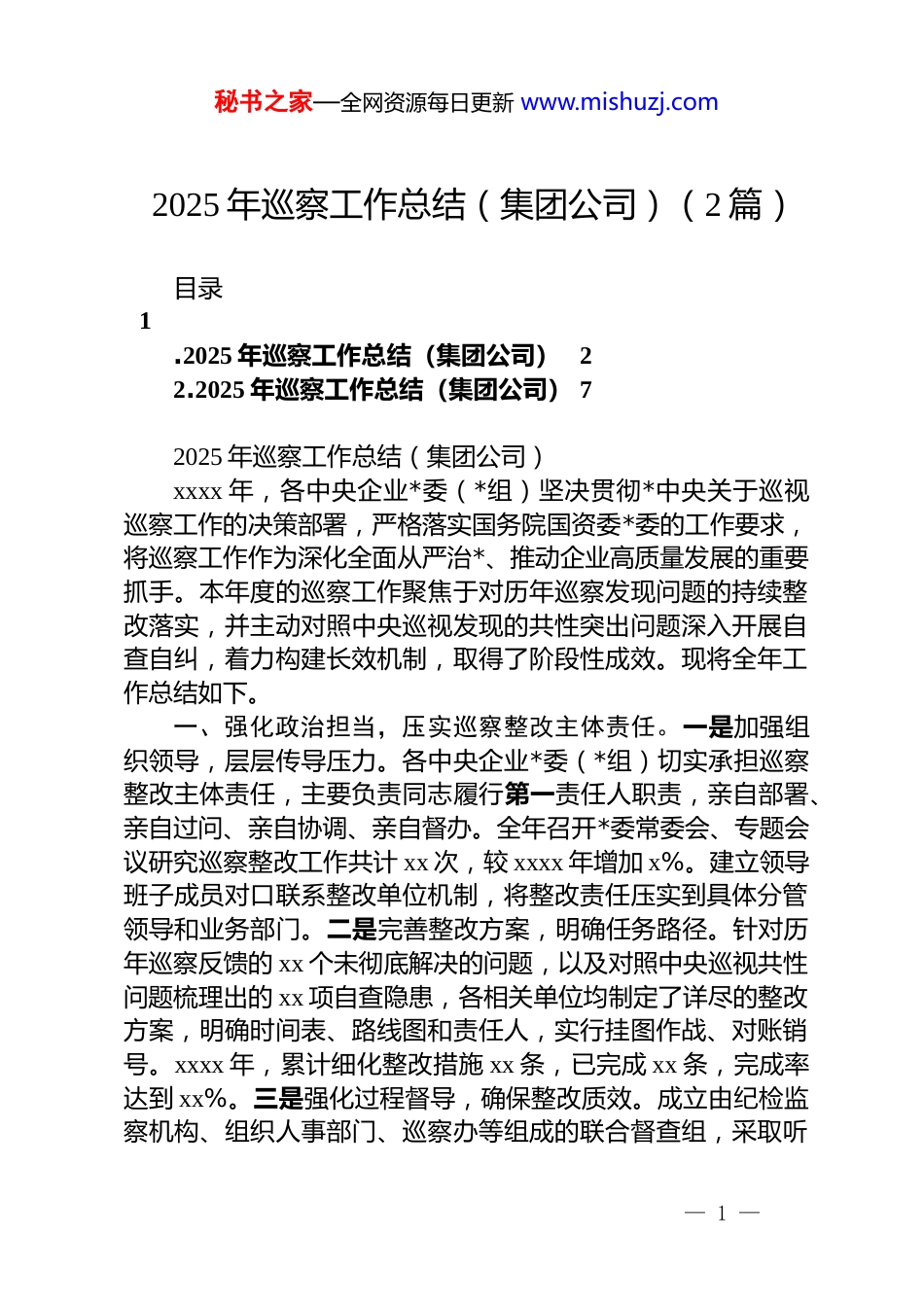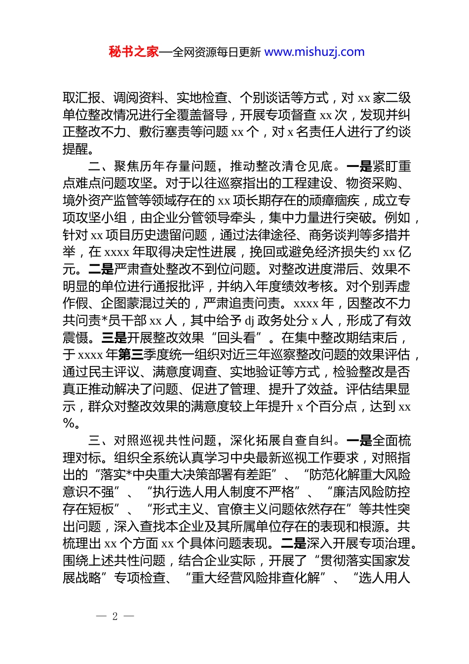 秘书之家—全网资源每日更新 www.mishuzj.com2025 年巡察工作总结(集团公司)(2 篇)目录1.2025 年巡察工作总结(集团公司) 22.2025 年巡察工作总结(集团公司) 72025 年巡察工作总结(集团公司)xxxx 年,各中央企业*委(*组)坚决贯彻*中央关于巡视巡察工作的决策部署,严格落实国务院国资委*委的工作要求,将巡察工作作为深化全面从严治*、推动企业高质量发展的重要抓手。本年度的巡察工作聚焦于对历年巡察发现问题的持续整改落实,并主动对照中央巡视发现的共性突出问题深入开展自查自纠,着力构建长效机制,取得了阶段性成效。现将全年工作总结如下。一、强化政治担当,压实巡察整改主体责任。一是加强组织领导,层层传导压力。各中央企业*委(*组)切实承担巡察整改主体责任,主要负责同志履行第一责任人职责,亲自部署、亲自过问、亲自协调、亲自督办。全年召开*委常委会、专题会议研究巡察整改工作共计 xx 次,较 xxxx 年增加 x%。建立领导班子成员对口联系整改单位机制,将整改责任压实到具体分管领导和业务部门。二是完善整改方案,明确任务路径。针对历年巡察反馈的 xx 个未彻底解决的问题,以及对照中央巡视共性问题梳理出的 xx 项自查隐患,各相关单位均制定了详尽的整改方案,明确时间表、路线图和责任人,实行挂图作战、对账销号。xxxx 年,累计细化整改措施 xx 条,已完成 xx 条,完成率达到 xx%。三是强化过程督导,确保整改质效。成立由纪检监察机构、组织人事部门、巡察办等组成的联合督查组,采取听— 1 —秘书之家—全网资源每日更新 www.mishuzj.com取汇报、调阅资料、实地检查、个别谈话等方式,对 xx 家二级单位整改情况进行全覆盖督导,开展专项督查 xx 次,发现并纠正整改不力、敷衍塞责等问题 xx 个,对 x 名责任人进行了约谈提醒。二、聚焦历年存量问题,推动整改清仓见底。一是紧盯重点难点问题攻坚。对于以往巡察指出的工程建设、物资采购、境外资产监管等领域存在的 xx 项长期存在的顽瘴痼疾,成立专项攻坚小组,由企业分管领导牵头,集中力量进行突破。例如,针对 xx 项目历史遗留问题,通过法律途径、商务谈判等多措并举,在 xxxx 年取得决定性进展,挽回或避免经济损失约 xx 亿元。二是严肃查处整改不到位问题。对整改进度滞后、效果不明显的单位进行通报批评,并纳入年度绩效考核。对个别弄虚作假、企图蒙混过关的,严肃追责问责。xxxx 年,因整改不力共问责*员干部 xx 人,其中给予 dj 政务处分 x 人,形成了有效震慑。三是开展整改效果“回头看”。在集中整改期结束后,于 xxxx 年第三季度统一组织对近三年巡察整改问题的效果评估,通过民主评议、满意度调查、实地验证等方式,检验整改是否真正推动解决了问题、促进了管理、提升了效益。评估结果显示,群众对整改效果的满意度较上年提升 x 个百分点,达到 xx%。三、对照巡视共性问题,深化拓展自查自纠。一是全面梳理对标。组织全系统认真学习中央最新巡视工作要求,对照指出的“落实*中央重大决策部署有差距”、“防范化解重大风险意识不强”、“执行选人用人制度不严格”、“廉洁风险防控存在短板”、“形式主义、官僚主义问题依然存在”等共性突出问题,深入查找本企业及其所属单位存在的表现和根源。共梳理出 xx 个方面 xx 个具体问题表现。二是深入开展专项治理。围绕上述共性问题,结合企业实际,开展了“贯彻落实国家发展战略”专项检查、“重大经营风险排查化解”、“选人用人— 2 —秘书之家—全网资源每日更新 www.mishuzj.com工作规范化建设”、“重点领域廉洁风险防控”、“作风建设提升”等 xx 项专项治理行动。通过治理,推动新增投入科技创新资金 xx 亿元,清理处置高风险业务 xx 项,调整优化中层管理人员 x 人,修订完善廉洁风险防控制度 xx 项,查处违反中央八项规定精神问题 xx 起。三是注重举一反三。要求各单位不仅解决点上的问题,更要注重从体制机制上分析原因,做到纠正一个问题、整改一类问题、规范一个领域。针对共性问题暴露出的制度漏洞和监管短板,推动相关主责部门完善制度流...