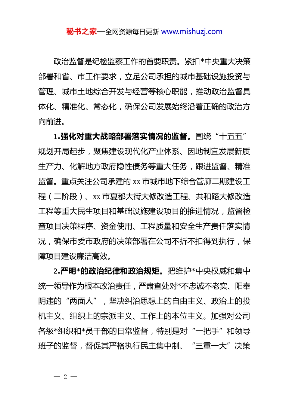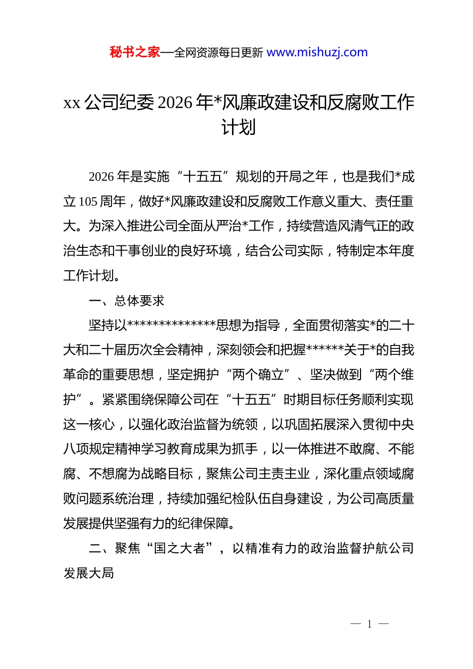 秘书之家—全网资源每日更新 www.mishuzj.comxx 公司纪委 2026 年*风廉政建设和反腐败工作计划2026 年是实施“十五五”规划的开局之年,也是我们*成立 105 周年,做好*风廉政建设和反腐败工作意义重大、责任重大。为深入推进公司全面从严治*工作,持续营造风清气正的政治生态和干事创业的良好环境,结合公司实际,特制定本年度工作计划。一、总体要求坚持以**************思想为指导,全面贯彻落实*的二十大和二十届历次全会精神,深刻领会和把握******关于*的自我革命的重要思想,坚定拥护“两个确立”、坚决做到“两个维护”。紧紧围绕保障公司在“十五五”时期目标任务顺利实现这一核心,以强化政治监督为统领,以巩固拓展深入贯彻中央八项规定精神学习教育成果为抓手,以一体推进不敢腐、不能腐、不想腐为战略目标,聚焦公司主责主业,深化重点领域腐败问题系统治理,持续加强纪检队伍自身建设,为公司高质量发展提供坚强有力的纪律保障。二、聚焦“国之大者”,以精准有力的政治监督护航公司发展大局— 1 —秘书之家—全网资源每日更新 www.mishuzj.com政治监督是纪检监察工作的首要职责。紧扣*中央重大决策部署和省、市工作要求,立足公司承担的城市基础设施投资与管理、城市土地综合开发与经营等核心职能,推动政治监督具体化、精准化、常态化,确保公司发展始终沿着正确的政治方向前进。1.强化对重大战略部署落实情况的监督。围绕“十五五”规划开局起步,聚焦建设现代化产业体系、因地制宜发展新质生产力、化解地方政府隐性债务等重大任务,跟进监督、精准监督。重点关注公司承建的 xx 市城市地下综合管廊二期建设工程(二阶段)、xx 市夏都大街大修改造工程、共和路大修改造工程等重大民生项目和基础设施建设项目的推进情况,监督检查项目决策程序、资金使用、工程质量和安全生产责任落实情况,确保市委市政府的决策部署在公司不折不扣得到执行,保障项目建设廉洁高效。2.严明*的政治纪律和政治规矩。把维护*中央权威和集中统一领导作为根本政治责任,严肃查处对*不忠诚不老实、阳奉阴违的“两面人”,坚决纠治思想上的自由主义、政治上的投机主义、组织上的宗派主义、工作上的本位主义。加强对公司各级*组织和*员干部的日常监督,特别是对“一把手”和领导班子的监督,督促其严格执行民主集中制、“三重一大”决策— 2 —秘书之家—全网资源每日更新 www.mishuzj.com制度,防止个人专断、任性用权。结合公司过往发生的职工违纪违法案件教训,举一反三,加强对*员干部“八小时之外”的监督管理,抓早抓小,防微杜渐。3.保障政绩观正确树立与践行。推动公司*员干部深入学习领会新发展理念,树立和践行正确政绩观,坚决反对和纠治急功近利、脱离实际的“形象工程”“政绩工程”。在项目投资决策、开发建设等环节,加强对项目可行性、经济社会效益评估等方面的监督,防止因追求短期利益、盲目铺摊子而造成资源浪费和潜在风险,确保每一笔投资都经得起历史和人民的检验。三、深化作风建设,以钉钉子精神巩固拓展中央八项规定精神堤坝作风建设永远在路上。严格落实二十届中央纪委五次全会关于持续深化正风肃纪的要求,巩固拓展深入贯彻中央八项规定精神学习教育成果,坚持不懈纠“四风”树新风,营造求真务实、清正廉洁的新风尚。4.持续加压整治享乐主义、奢靡之风。紧盯“四风”问题新动向、新表现,对违规吃喝、违规收送礼品礼金、违规发放津补贴等易发多发问题,露头就打、寸步不让。严肃查处以项目考察、业务培训、dj 活动等名义公款旅游、变相旅游等问题。— 3 —秘书之家—全网资源每日更新 www.mishuzj.com针对公司工程项目多、外部协调接待任务重的特点,严格规范公务接待、商务招待和项目考察活动标准,加强对相关费用报销的审核监督,坚决防止“舌尖上的腐败”和“车轮上的腐败”。5.重点纠治形式主义、官僚主义。聚焦影响公司高质量发展的堵点难点问题,坚决纠治工作中存在的推诿扯皮、不担当不作为、报喜不报忧、数据造假等问题。重点整治在项目推进、安全生产、风险化解等工作中临阵退缩、敷衍塞责的行为,推动为基层一线减负,激发干部职工...