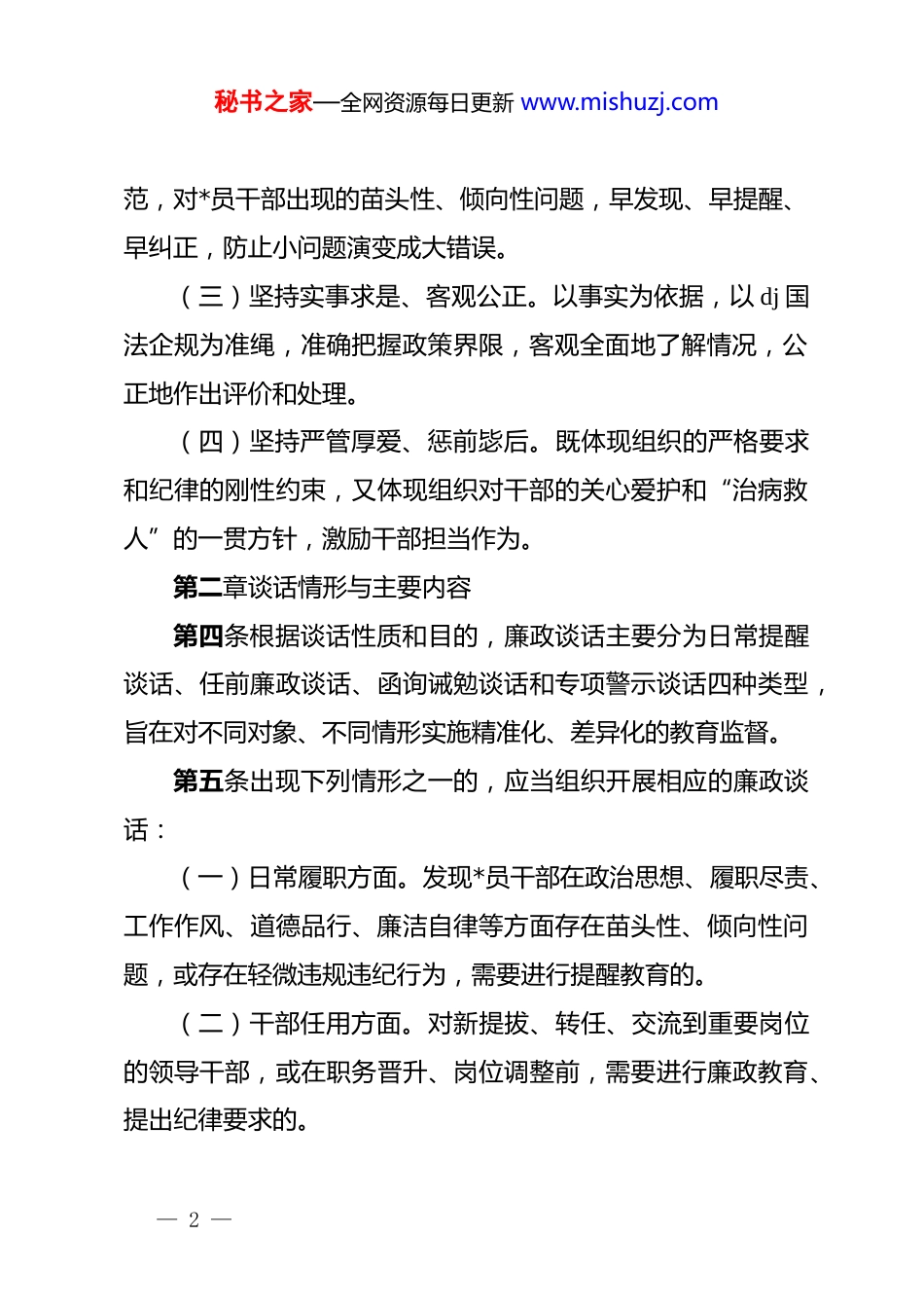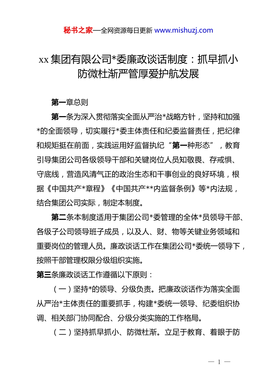 秘书之家—全网资源每日更新 www.mishuzj.comxx 集团有限公司*委廉政谈话制度:抓早抓小防微杜渐严管厚爱护航发展第一章总则第一条为深入贯彻落实全面从严治*战略方针,坚持和加强*的全面领导,切实履行*委主体责任和纪委监督责任,把纪律和规矩挺在前面,实践运用好监督执纪“第一种形态”,教育引导集团公司各级领导干部和关键岗位人员知敬畏、存戒惧、守底线,营造风清气正的政治生态和干事创业的良好环境,根据《中国共产*章程》《中国共产**内监督条例》等*内法规,结合集团公司实际,制定本制度。第二条本制度适用于集团公司*委管理的全体*员领导干部、各级子公司领导班子成员,以及人、财、物等关键业务领域和重要岗位的管理人员。廉政谈话工作在集团公司*委统一领导下,按照干部管理权限分级组织实施。第三条廉政谈话工作遵循以下原则:(一)坚持*的领导、分级负责。把廉政谈话作为落实全面从严治*主体责任的重要抓手,构建*委统一领导、纪委组织协调、相关部门协同配合、分级分类实施的工作格局。(二)坚持抓早抓小、防微杜渐。立足于教育、着眼于防— 1 —秘书之家—全网资源每日更新 www.mishuzj.com范,对*员干部出现的苗头性、倾向性问题,早发现、早提醒、早纠正,防止小问题演变成大错误。(三)坚持实事求是、客观公正。以事实为依据,以 dj 国法企规为准绳,准确把握政策界限,客观全面地了解情况,公正地作出评价和处理。(四)坚持严管厚爱、惩前毖后。既体现组织的严格要求和纪律的刚性约束,又体现组织对干部的关心爱护和“治病救人”的一贯方针,激励干部担当作为。第二章谈话情形与主要内容第四条根据谈话性质和目的,廉政谈话主要分为日常提醒谈话、任前廉政谈话、函询诫勉谈话和专项警示谈话四种类型,旨在对不同对象、不同情形实施精准化、差异化的教育监督。第五条出现下列情形之一的,应当组织开展相应的廉政谈话:(一)日常履职方面。发现*员干部在政治思想、履职尽责、工作作风、道德品行、廉洁自律等方面存在苗头性、倾向性问题,或存在轻微违规违纪行为,需要进行提醒教育的。(二)干部任用方面。对新提拔、转任、交流到重要岗位的领导干部,或在职务晋升、岗位调整前,需要进行廉政教育、提出纪律要求的。— 2 —秘书之家—全网资源每日更新 www.mishuzj.com(三)问题线索方面。根据信访举报、监督检查、审查审计、巡视巡察等工作中发现的问题线索,反映笼统、情节轻微,需要由本人作出说明或进行批评教育的。(四)专项工作方面。围绕集团公司重大决策部署、重要改革任务、重点工程项目推进,或在元旦、春节等重要节点前,需要进行专题廉政教育和纪律重申的。(五)其他需要谈话的情形第六条廉政谈话应当紧扣“廉洁”主题,突出政治性和针对性,主要围绕以下内容展开:(一)学习贯彻*的创新理论,坚定理想信念,筑牢思想防线的情况(二)遵守*的“六大纪律”,特别是政治纪律和政治规矩的情况(三)贯彻执行中央八项规定精神及集团公司实施细则,持续纠治“四风”的情况(四)履行“一岗双责”,落实*风廉政建设责任制,加强对分管领域和部门监管的情况(五)秉公用权、廉洁从业,在项目投资、物资采购、招标投标、财务管理等关键环节的履职情况(六)个人作风、生活作风和家风家教建设,自觉净化社— 3 —秘书之家—全网资源每日更新 www.mishuzj.com交圈、生活圈、朋友圈的情况第三章谈话组织与实施程序第七条廉政谈话实行分级实施。集团公司*委书记、副书记、纪委书记及其他*委委员负责与分管领域、直属子公司及总部部门的主要负责人进行谈话。各子公司*组织参照本制度,负责组织实施本单位范围内的廉政谈话工作。集团公司纪检监察机构、*委组织部、*委办公室等部门根据职责分工,承担相应的组织协调和具体实施工作。第八条严格规范谈话程序,确保谈话的严肃性和有效性。(一)谈话前精心准备。根据谈话类型和对象,提前制定谈话方案,全面了解谈话对象的思想、工作和作风状况,梳理分析存在的主要问题,明确谈话的重点和目的,做到“有的放矢”。(二)谈话中坦诚交流。谈话应在严肃、坦诚、和谐的氛围中进行。谈话人要...
