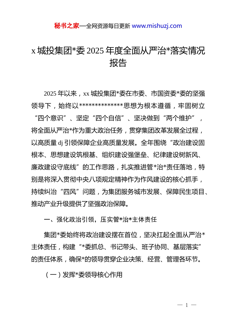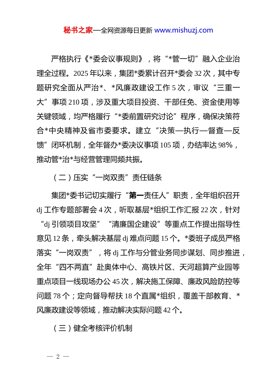 秘书之家—全网资源每日更新 www.mishuzj.comx 城投集团*委 2025 年度全面从严治*落实情况报告2025 年以来,xx 城投集团*委在市委、市国资委*委的坚强领导下,始终以**************思想为根本遵循,牢固树立“四个意识”、坚定“四个自信”、坚决做到“两个维护”,将全面从严治*作为重大政治任务,贯穿集团改革发展全过程,以高质量 dj 引领保障企业高质量发展。全年围绕“政治建设固根本、思想建设筑根基、组织建设强堡垒、纪律建设树新风、廉政建设守底线”的工作思路,扎实推进管*治*责任落地,特别是将深入贯彻中央八项规定精神作为作风建设的核心抓手,持续纠治“四风”问题,为集团服务城市发展、保障民生项目、推动产业升级提供了坚强政治保障。一、强化政治引领,压实管*治*主体责任集团*委始终将政治建设摆在首位,坚决扛起全面从严治*主体责任,构建“*委抓总、书记带头、班子协同、基层落实”的责任体系,确保*的领导贯穿企业决策、经营、管理各环节。(一)发挥*委领导核心作用— 1 —秘书之家—全网资源每日更新 www.mishuzj.com严格执行《*委会议事规则》,将“*管一切”融入企业治理全过程。2025 年以来,集团*委累计召开*委会 32 次,其中专题研究全面从严治*、*风廉政建设工作 5 次,审议“三重一大”事项 210 项,涉及重大项目投资、干部任免、资金使用等关键领域,均严格履行“*委前置研究讨论”程序,确保决策符合*中央精神及省市委要求。建立“决策—执行—督查—反馈”闭环机制,全年督办*委决议事项 105 项,办结率达 98%,推动管*治*与经营管理同频共振。(二)压实“一岗双责”责任链条集团*委书记切实履行“第一责任人”职责,全年组织召开dj 工作专题部署会 4 次,听取基层*组织工作汇报 22 次,针对“dj 引领项目攻坚”“清廉国企建设”等重点工作提出指导性意见 12 条,牵头解决基层 dj 难点问题 15 个。*委班子成员严格落实“一岗双责”,将 dj 工作与分管业务同步谋划、同步推进,全年“四不两直”赴奥体中心、高铁片区、天河超算产业园等重点项目一线现场办公 45 次,解决施工保障、廉政风险防控等问题 78 个;定向督导帮扶 18 个直属*组织,覆盖干部教育、*风廉政建设等领域,推动解决实际问题 42 个。(三)健全考核评价机制— 2 —秘书之家—全网资源每日更新 www.mishuzj.com修订《基层*组织 dj 工作考核办法》,将全面从严治*成效纳入“双百考核”体系(dj 考核 100 分、业绩考核 100 分),考核结果与干部薪酬、评优评先直接挂钩。组织开展半年、年度基层*组织书记“联述联评联考”,15 名直属*组织书记现场述职并接受民主评议,评议优秀率达 90%。贯彻落实《基层*组织运用监督执纪“第一种形态”工作细则》,全年与基层*组织书记、部室*员负责人开展谈心谈话 56 人次,及时纠正苗头性、倾向性问题,筑牢干部思想防线。二、深化理论武装,筑牢思想政治根基集团*委坚持以**************思想凝心铸魂,将理论学习与实践结合、与作风建设结合,推动*的创新理论入脑入心,为全面从严治*提供思想支撑。(一)强化*委理论中心组领学作用聚焦*中央重大决策部署、******关于国企改革发展和*的建设重要论述、中央八项规定精神等核心内容,制定《*委理论中心组 2025 年学习计划》,全年开展集中学习 12 次、专题读书班 2 次,邀请省委*校专家作“全面从严治*新形势新要求”“中央八项规定精神解读”等专题辅导 4 次,班子成员撰写心— 3 —秘书之家—全网资源每日更新 www.mishuzj.com得体会、调研报告 28 篇,带动各级*组织形成“学理论、强*性、转作风”的浓厚氛围。(二)精准推进*员教育培训分级分类制定《2025 年*员教育培训配档表》12 期,覆盖集团 498 名*员,重点开展“*章*规”“中央八项规定精神案例分析”“廉洁从业”等专题培训,通过“线上+线下”结合模式(学习强国、国企 dj 平台线上学习,支部集中研讨、现场教学线下推进),确保*员年均学时不低于 30 学时,目前已完成培训总时长 1.5 万小时,*员理论素养和纪律意识显著提升。组织*员赴“***在山...